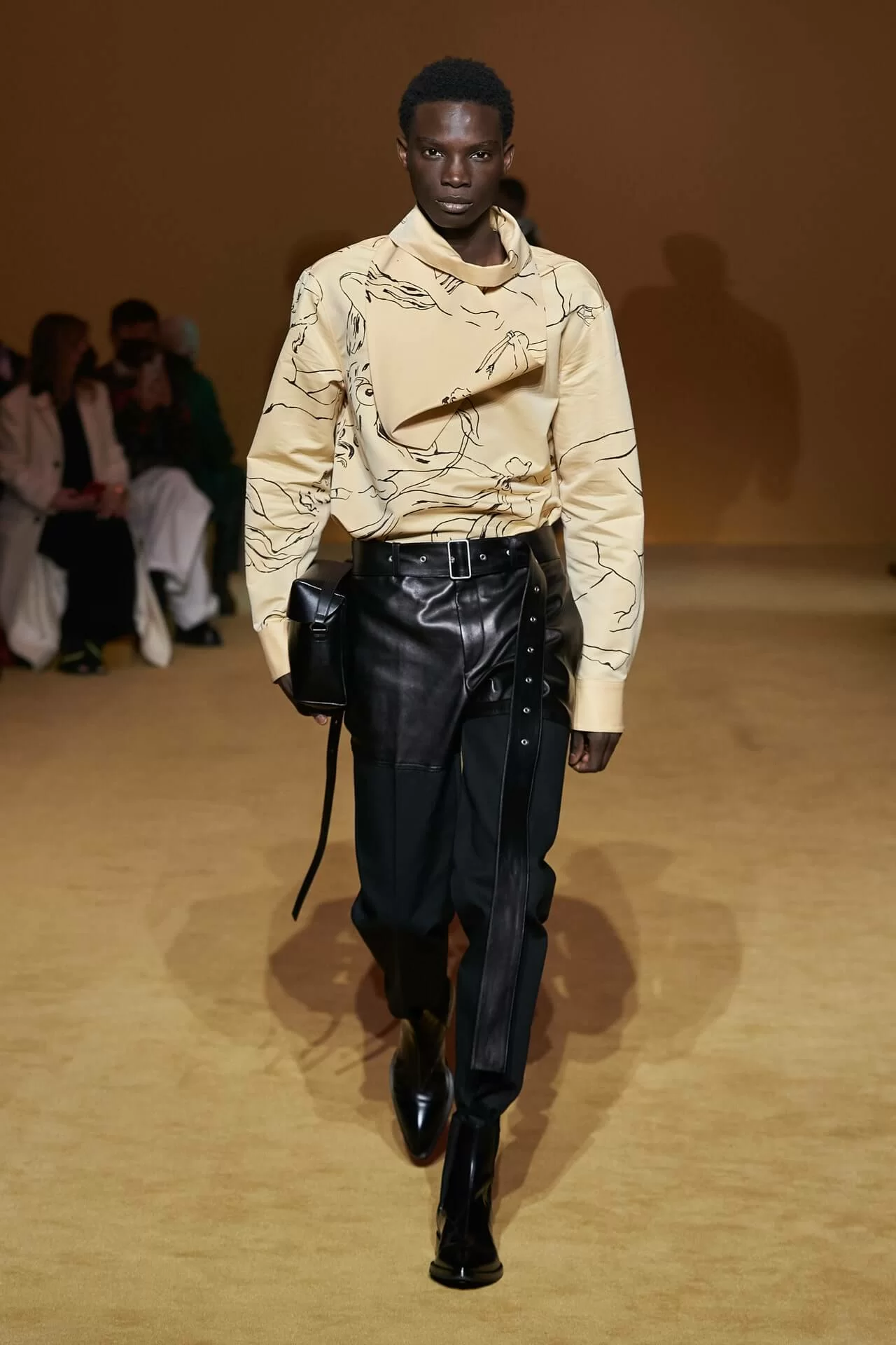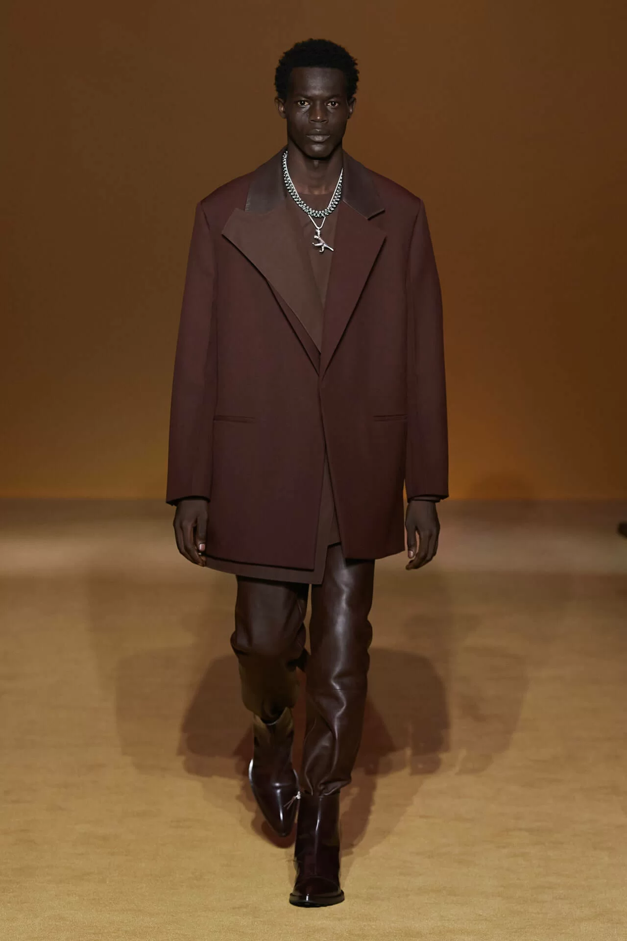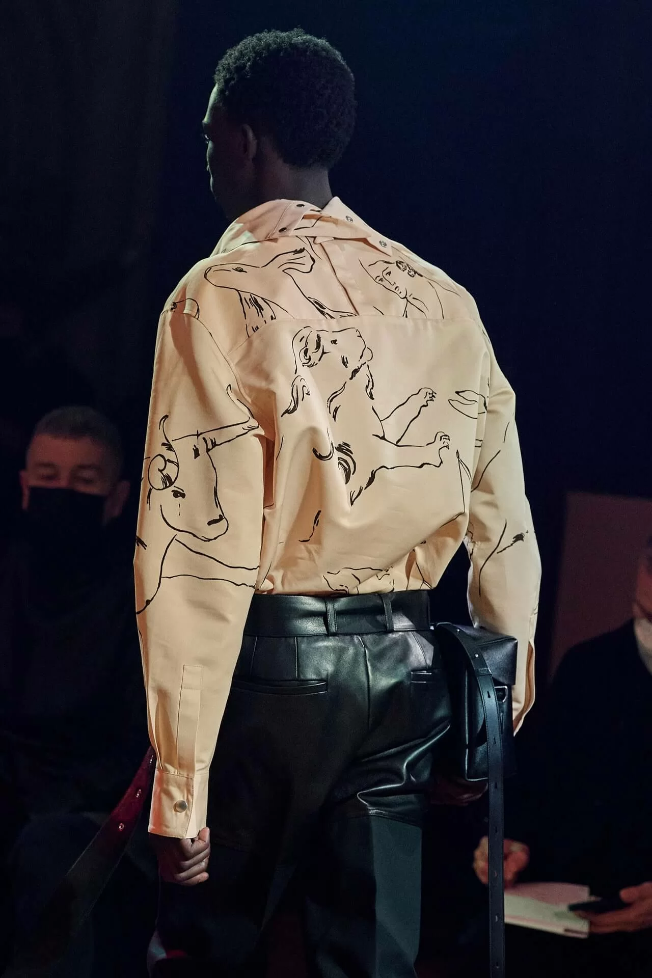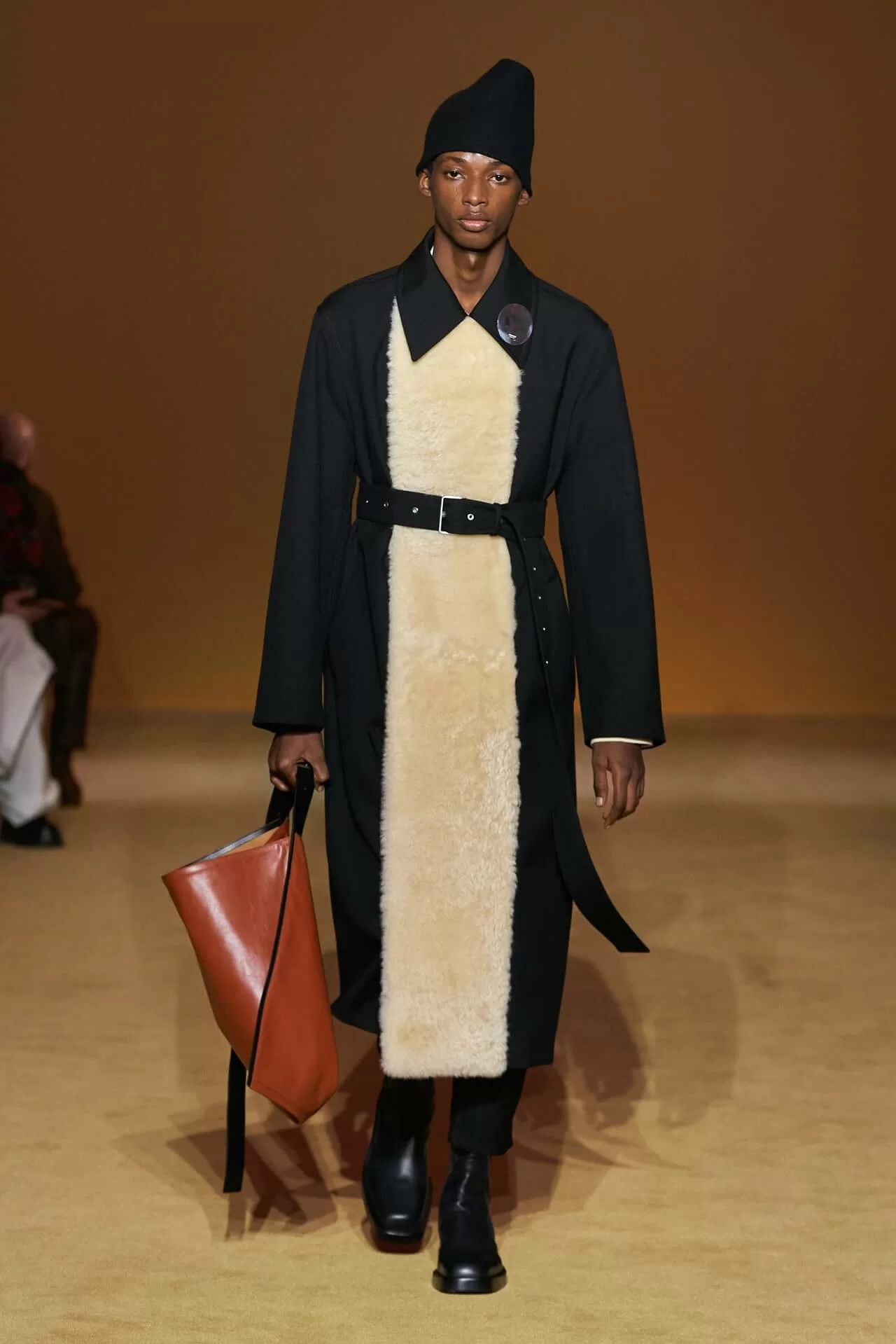 除了皮革拼西裝料的大衣是經典之外,值得一提的是當中的毛衣也加入不少占星術、動物等的印花元素,加上修腳的尖頭靴、高身的毛冷帽,整體帶有嬉皮士的氣氛,亦是將街頭風格和正裝相融一體的另類手法。