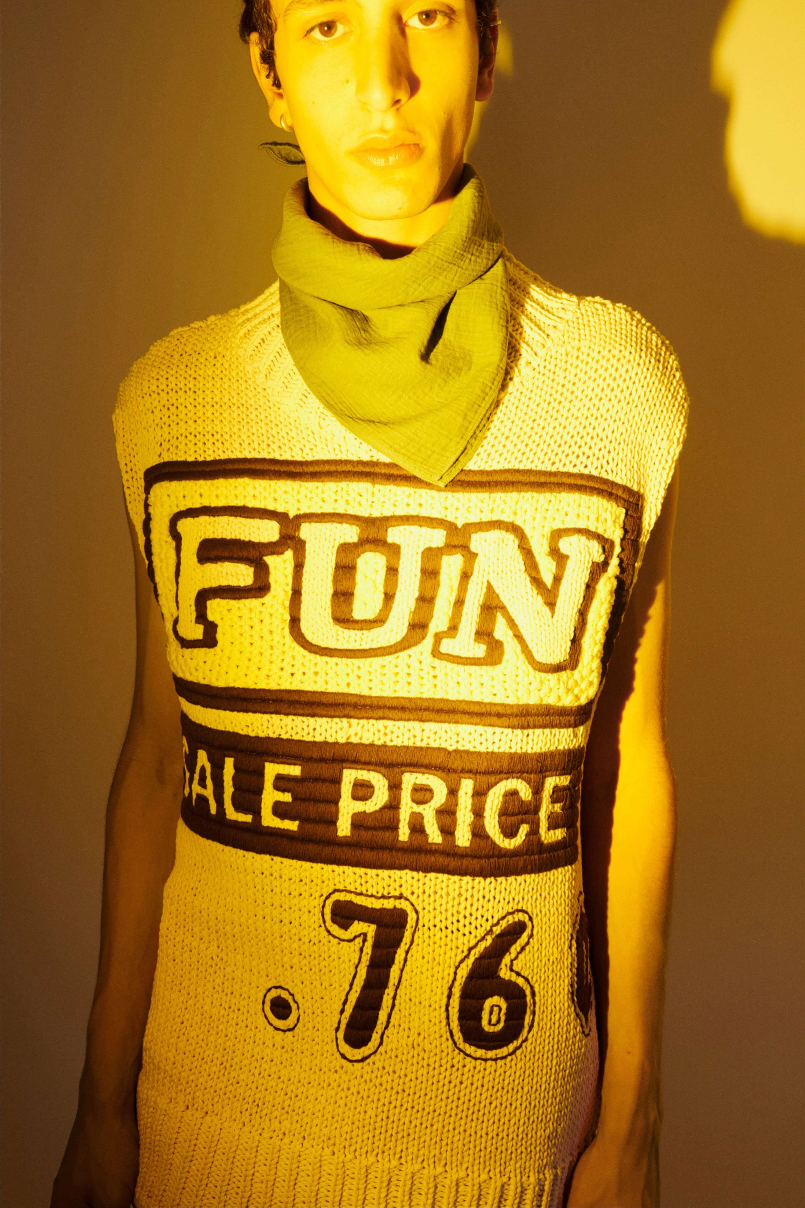 所以今季我們可以見到 JIL SANDER 重覆使用色彩明亮的領巾、晶瑩剔透的閃亮胸針,超大型的手袋等元素。原來當中一條膝上繡有 VENTURE 和 PARADISE 字樣的褲子,和印有 FUN 及 SALE PRICE 的背心冷衫的靈感同樣是老式廣告,這種眨低自己以提升自己的創作手法,正是當時紐約的 POST POP ART 精神。