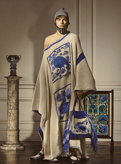 活躍於十九世紀末的WILLIAM DE MORGAN的創作以中世紀及伊斯蘭圖騰為主,他創新的釉料和燒製技術讓珍禽異獸、花卉蔓藤轉變為這次LOEWE的男、女裝成衣與飾物。LOEWE將當中的細節放大於系列產品之中,大圍巾、針織服、毛線帽,孔雀大衣都具冒險色彩,陶藝大師的夢幻主題配上JONATHAN ANDERSON的獨特剪裁,實是兩位藝術家的跨時空藝術交流。