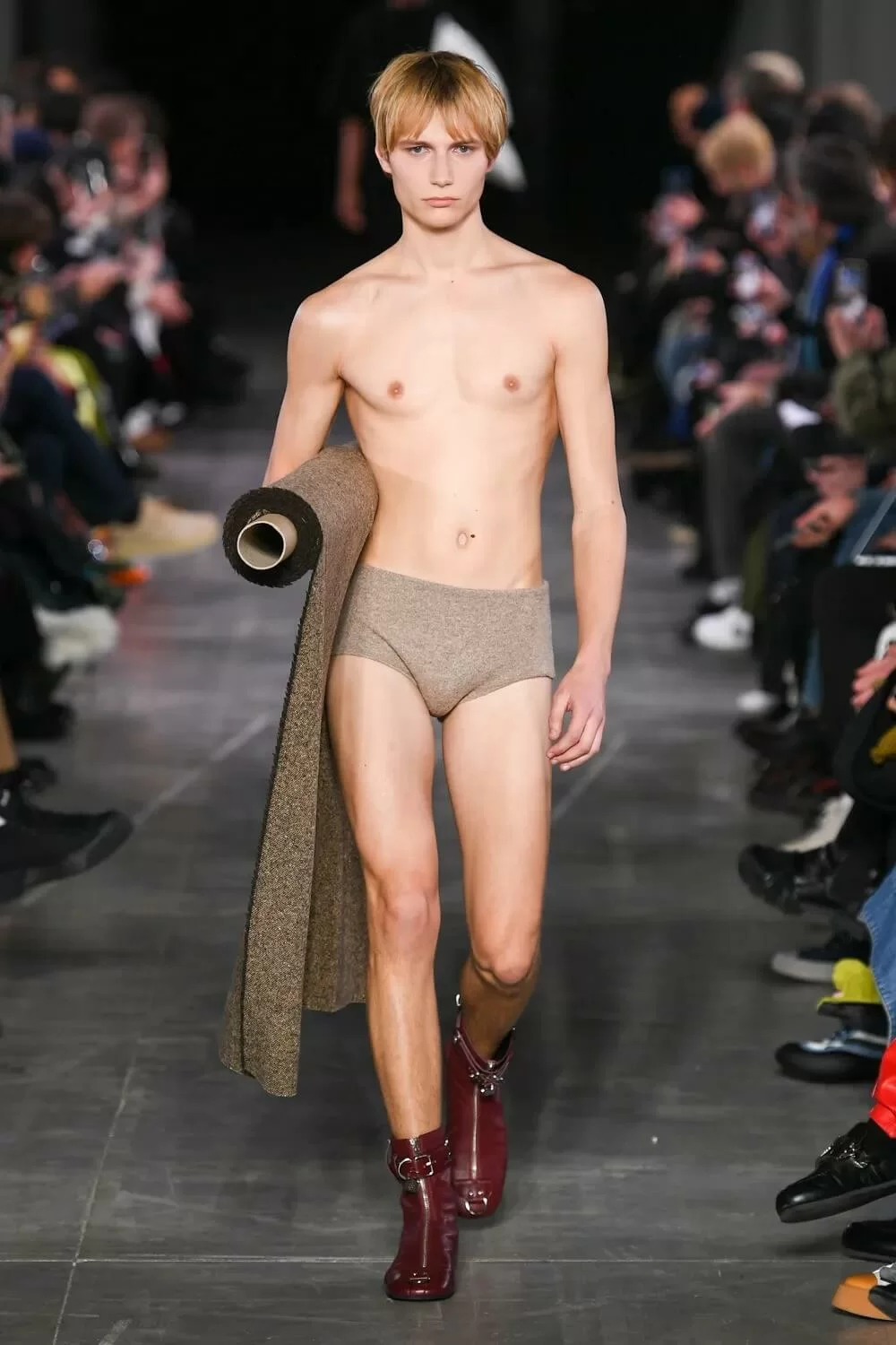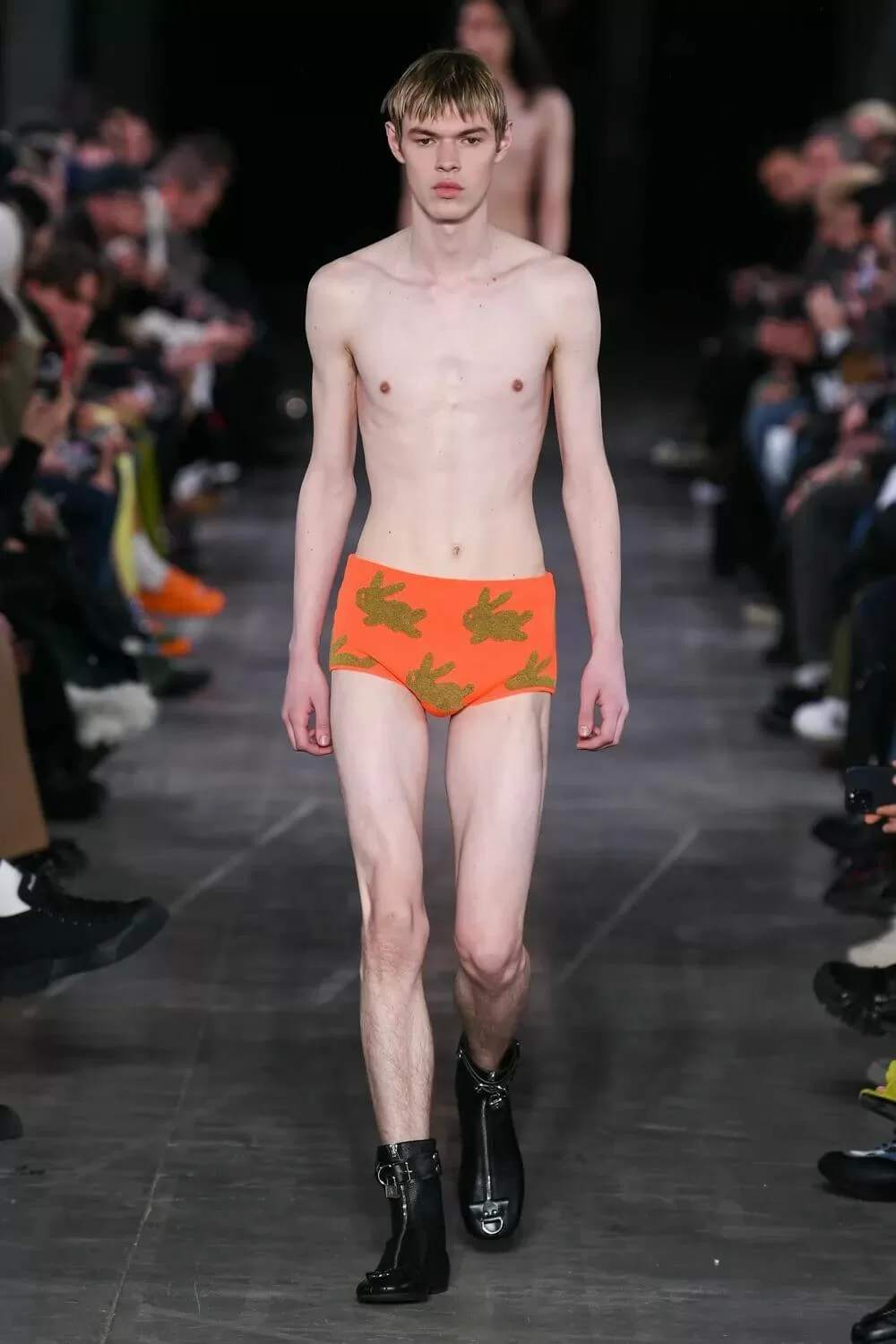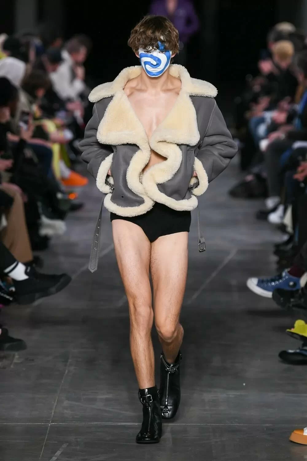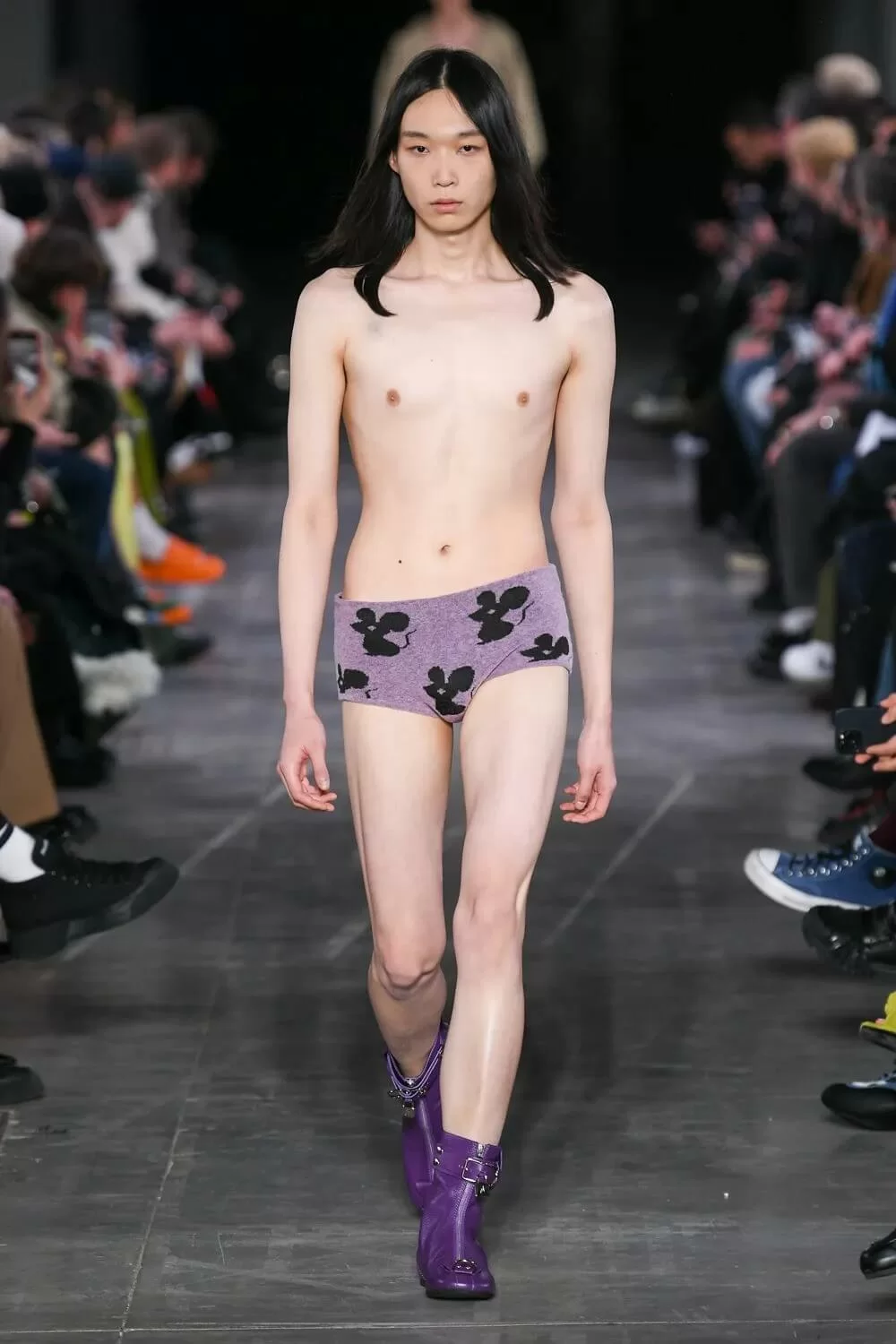 JW ANDERSON FW23 系列再度讓模特兒露出大量「肉體」,皮革花邊短褲或是飾有小動物圖案的綿質內褲不分雌雄,趣緻極致。