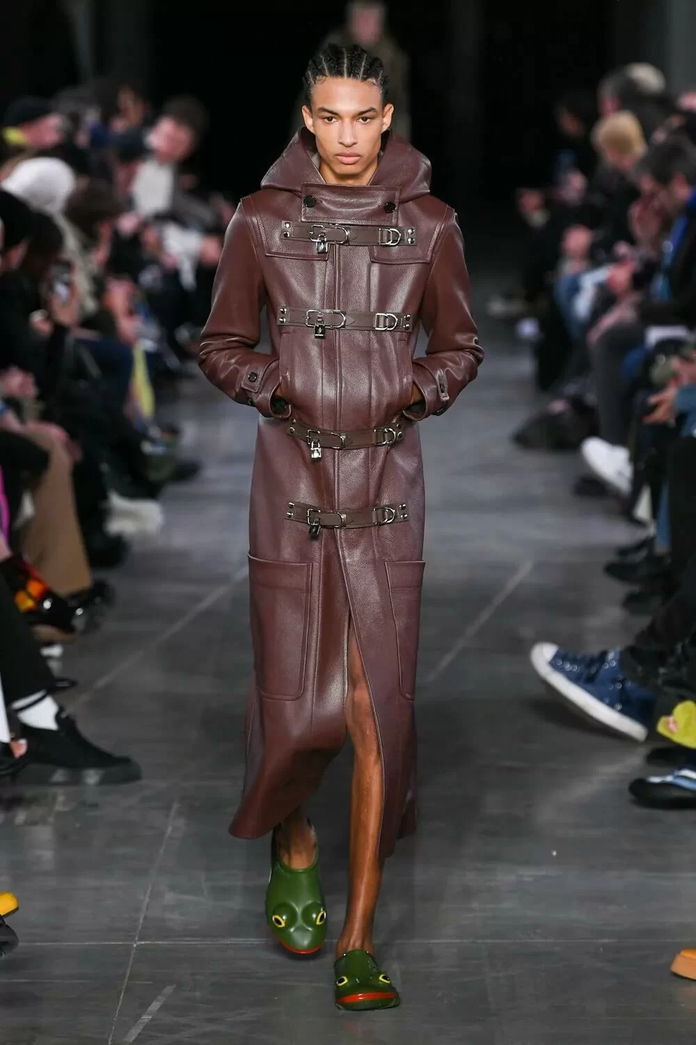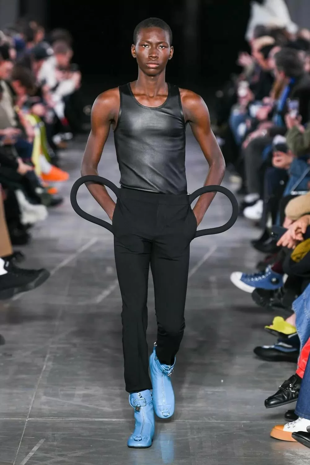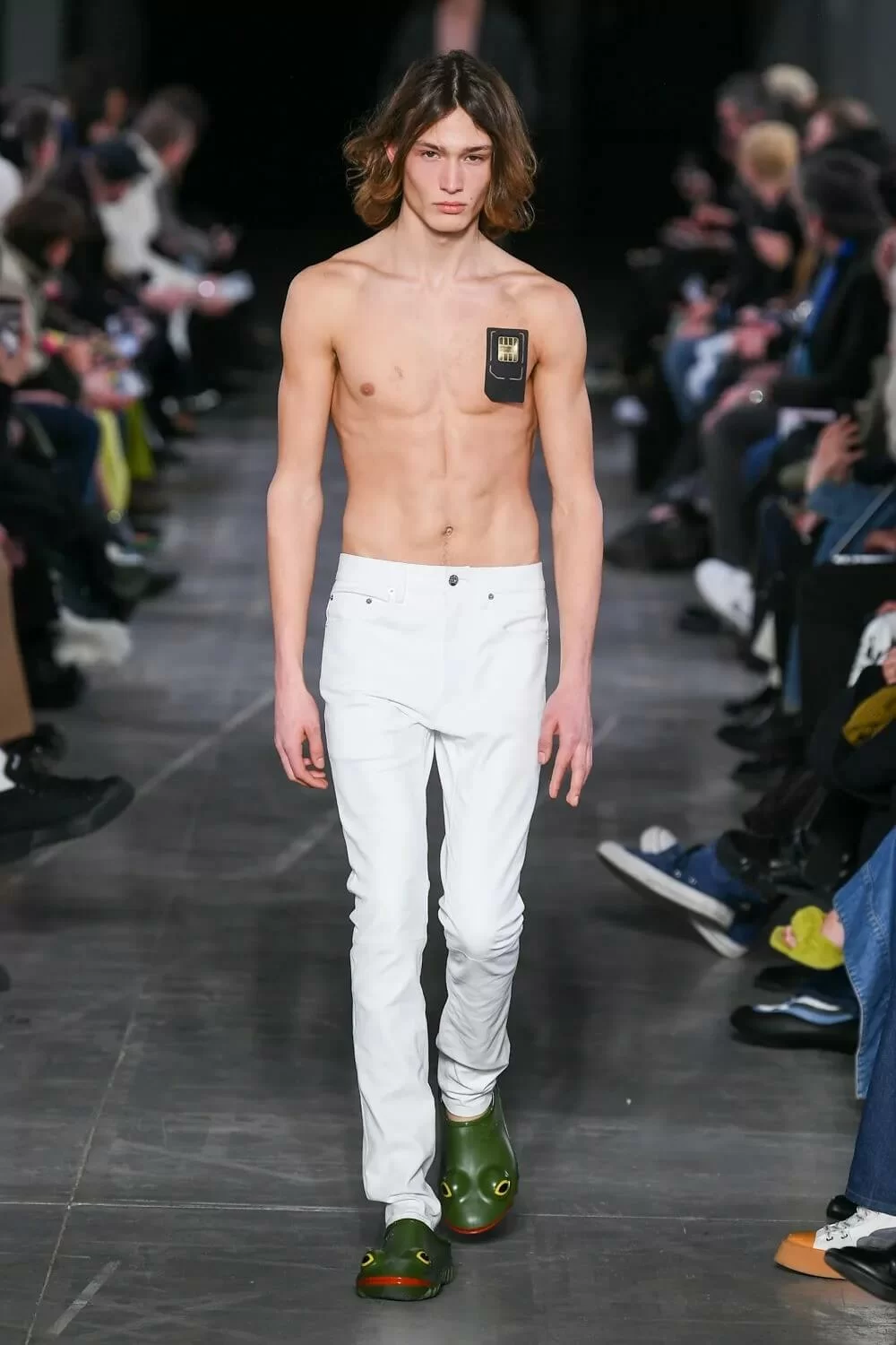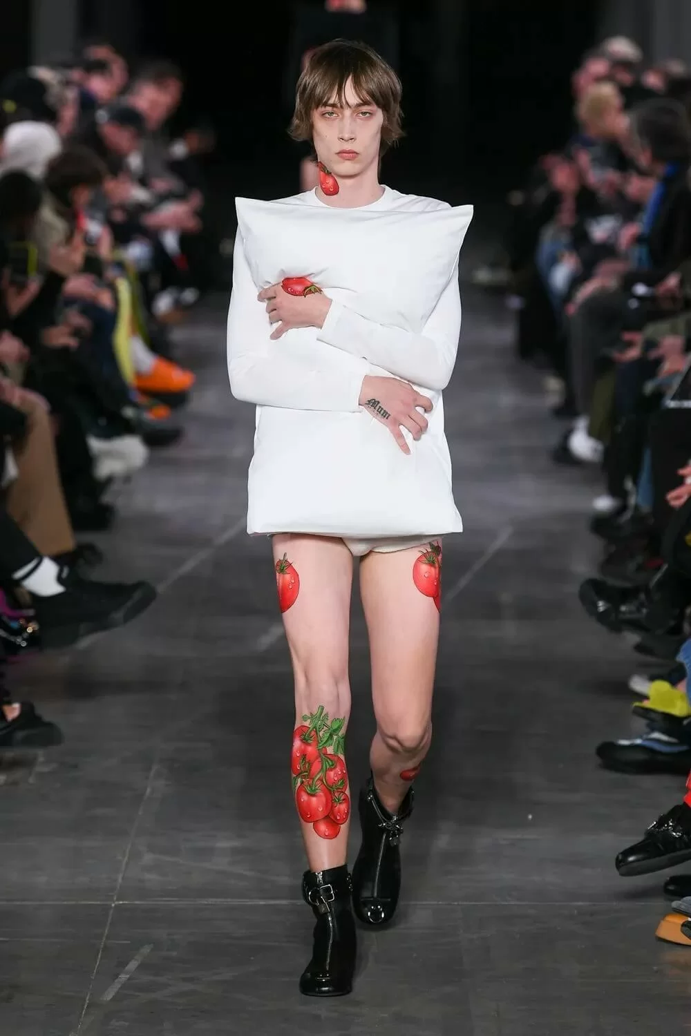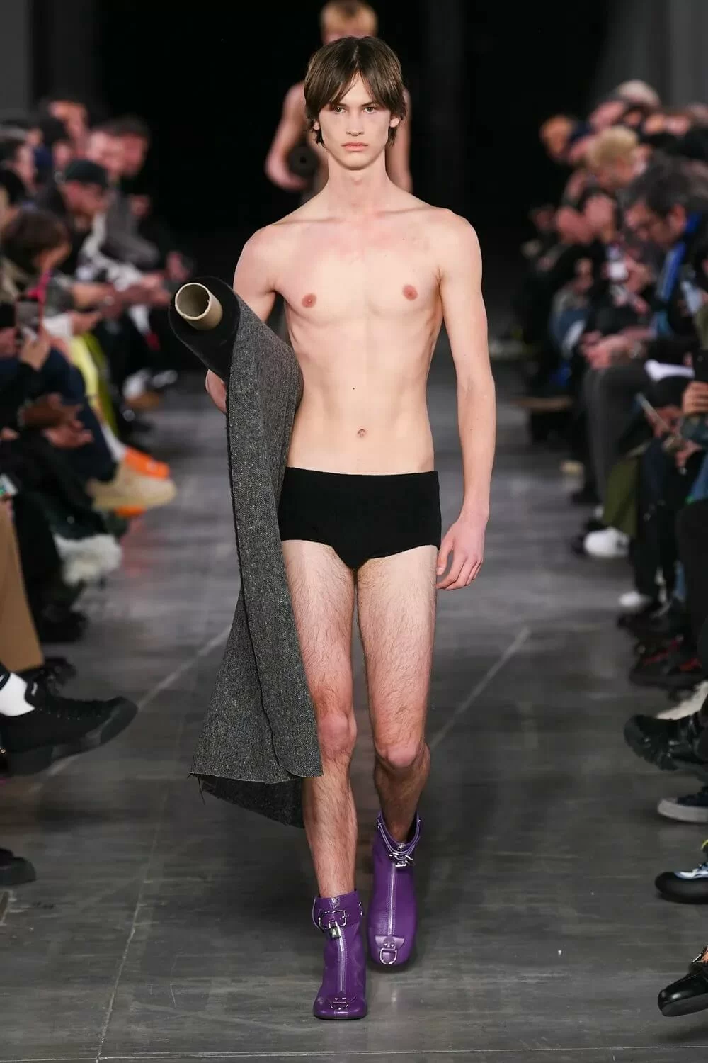 JW ANDERSON FW23 系列再度讓模特兒露出大量「肉體」,皮革花邊短褲或是飾有小動物圖案的綿質內褲不分雌雄,趣緻極致。