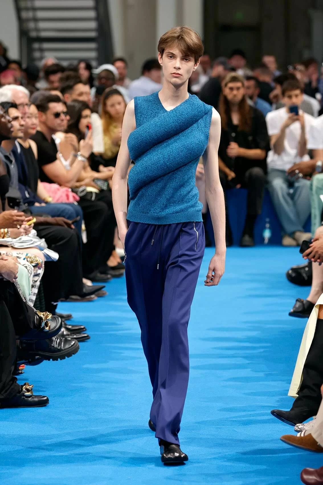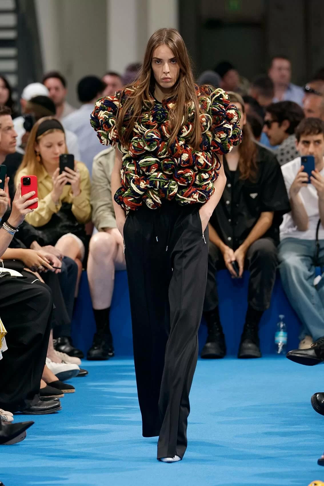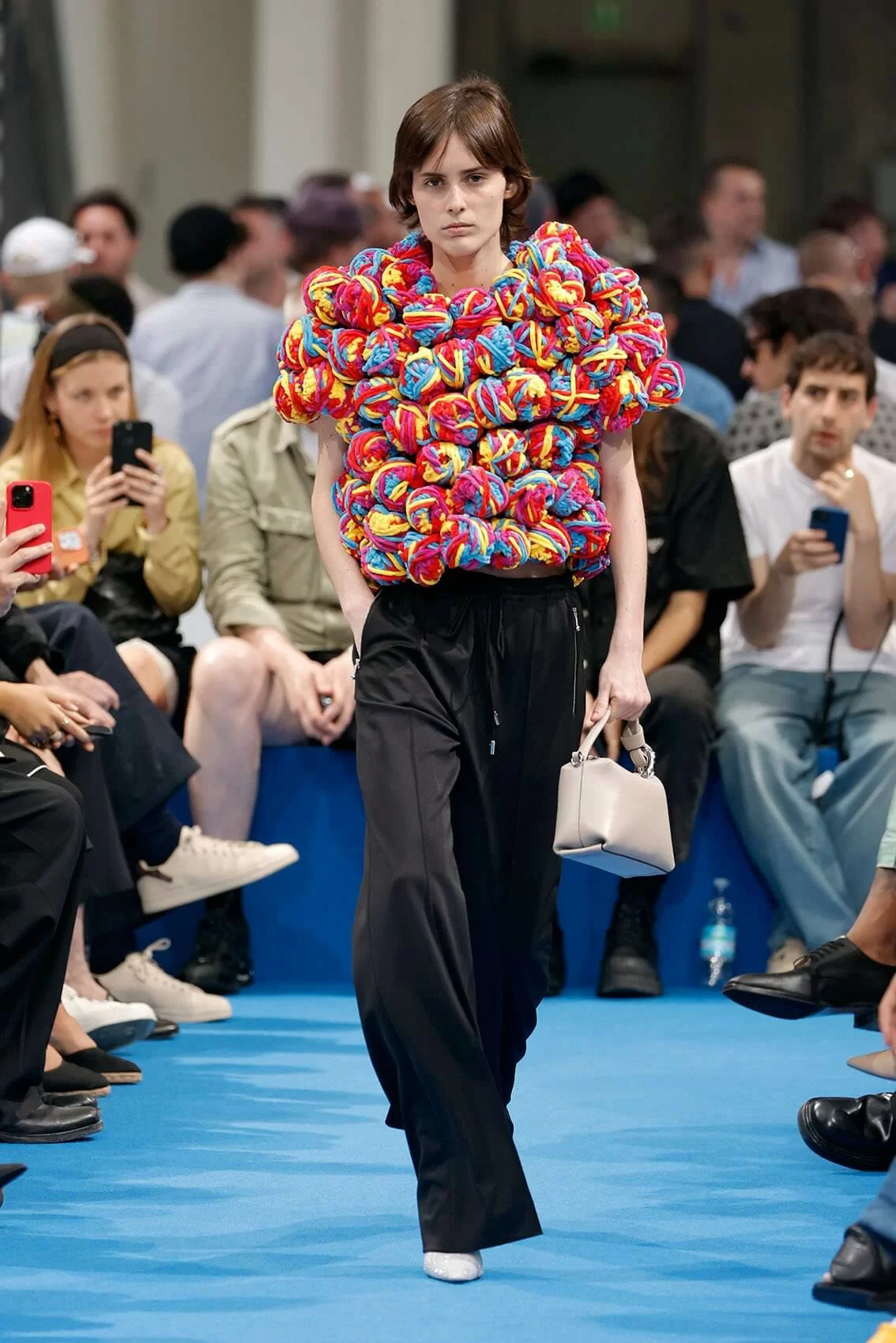 誰也不曾想到毛線球、地拖頭這些擁有奇形怪狀的物件在 JONATHAN 手上,能通過編織手法再結合運動球衣的輪廓,打造成一件件時裝單品。橫向延長的褲裝、挺闊面料扭轉成立體的裙子下擺,利用視覺錯覺塑造空中剪影。縱橫交錯的毛背心,像似一塊塊拼圖,又像一條賽車跑道。除此之外,「斷臂」毛衣、帶有童裝前襟的皮革大衣及採用深 V 鏤空設計的HOODIE等,JONATHAN 就這樣借助服裝,一件一件向我們訴說著他的童年。
