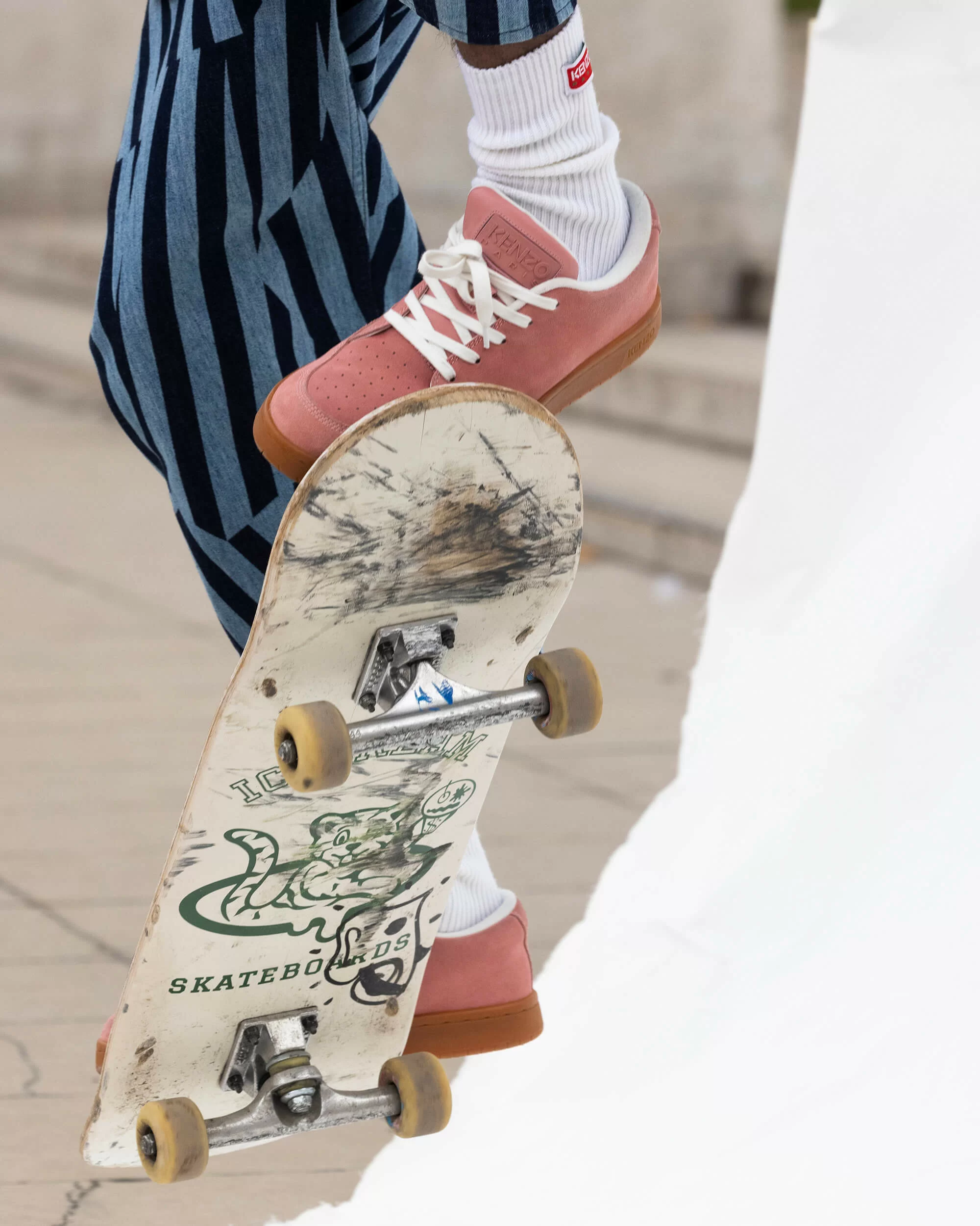 今個系列以街頭滑板文化為基礎平衡KENZO高級時裝理念,除了中性經典顏色,亦有季節限定色,包括米色和粉色麂皮鞋面搭配棕色橡膠鞋底,黑色麂皮鞋面搭配黑色橡膠鞋底,以及白色粒面皮革搭配白色鞋底。