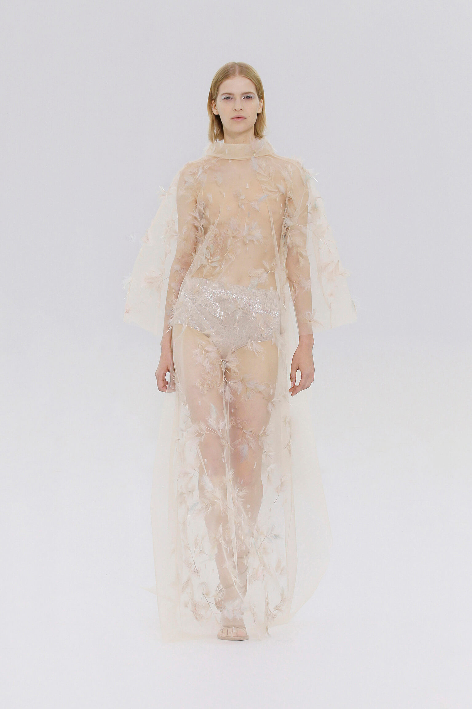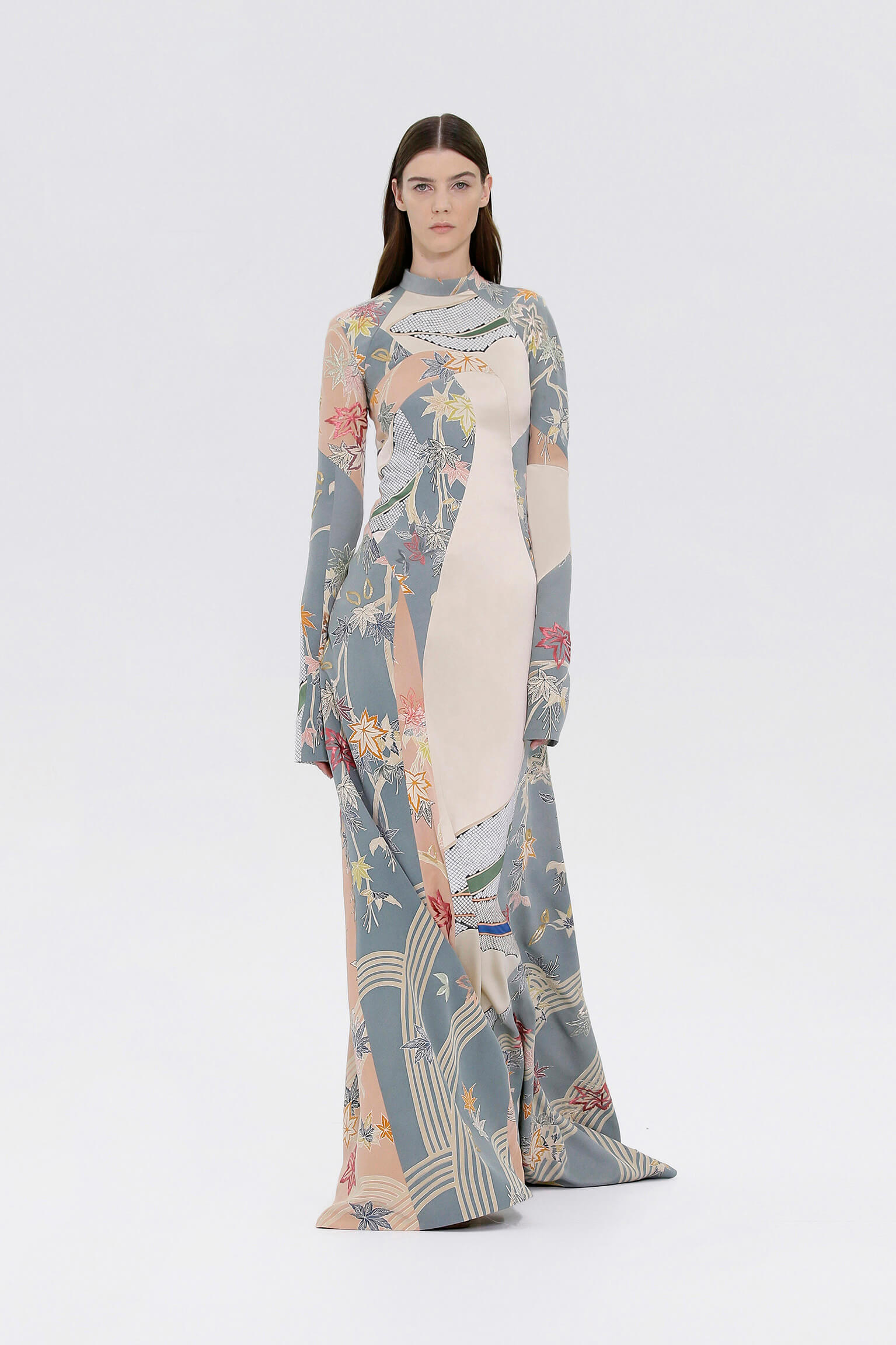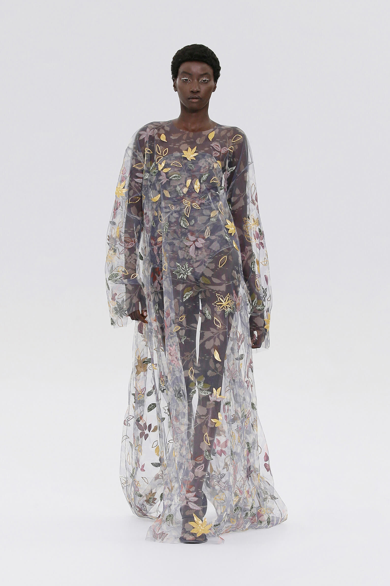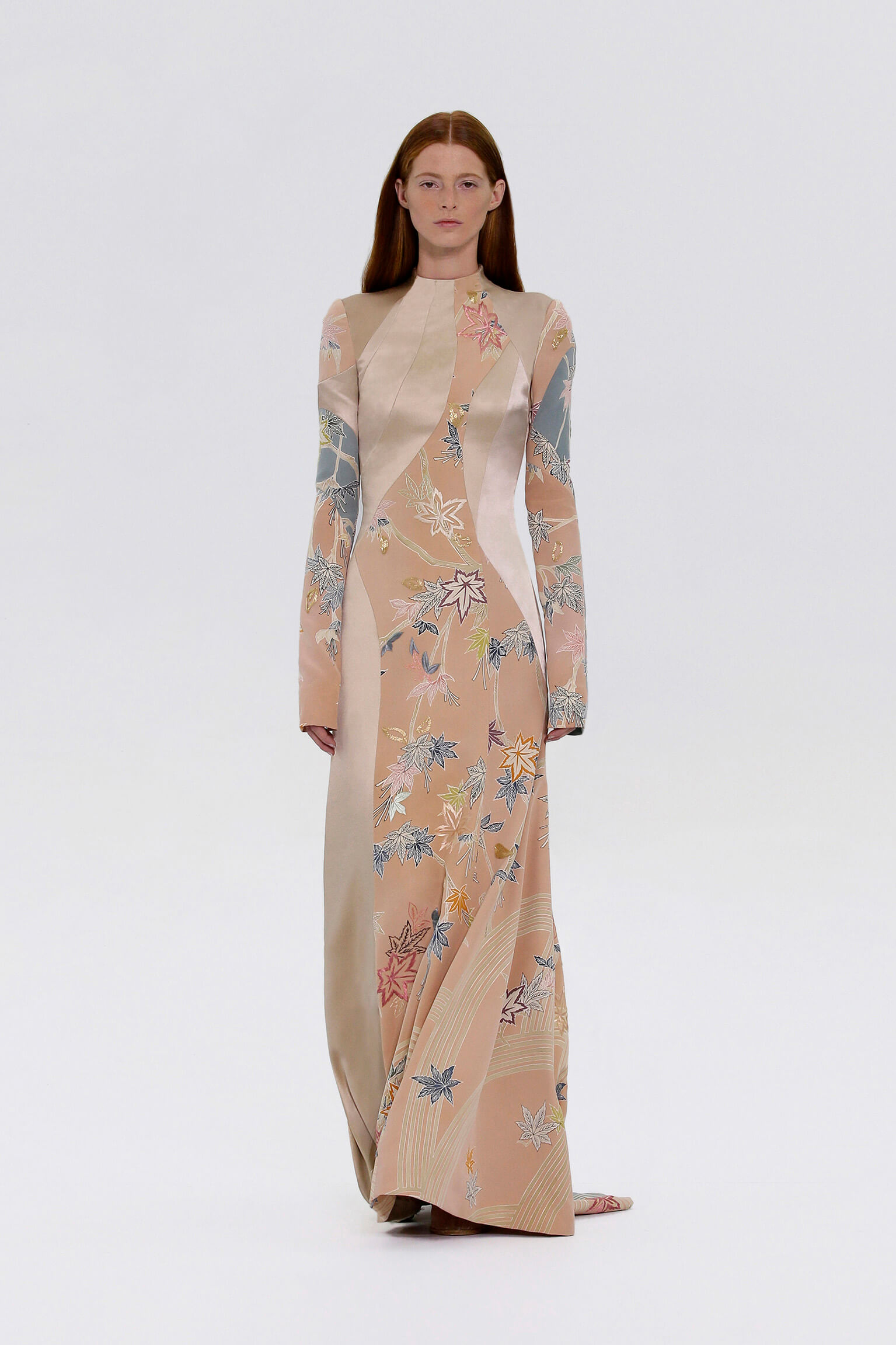 壓軸登場的薄紗晚裝是品味的現實呈現,東西方藝術文化的精湛結合透過刺繡展現,夢幻豐富的意像名為「秋之頌」,如流水傾瀉而下的楓葉圖案是 1700 年代的經典樣式。