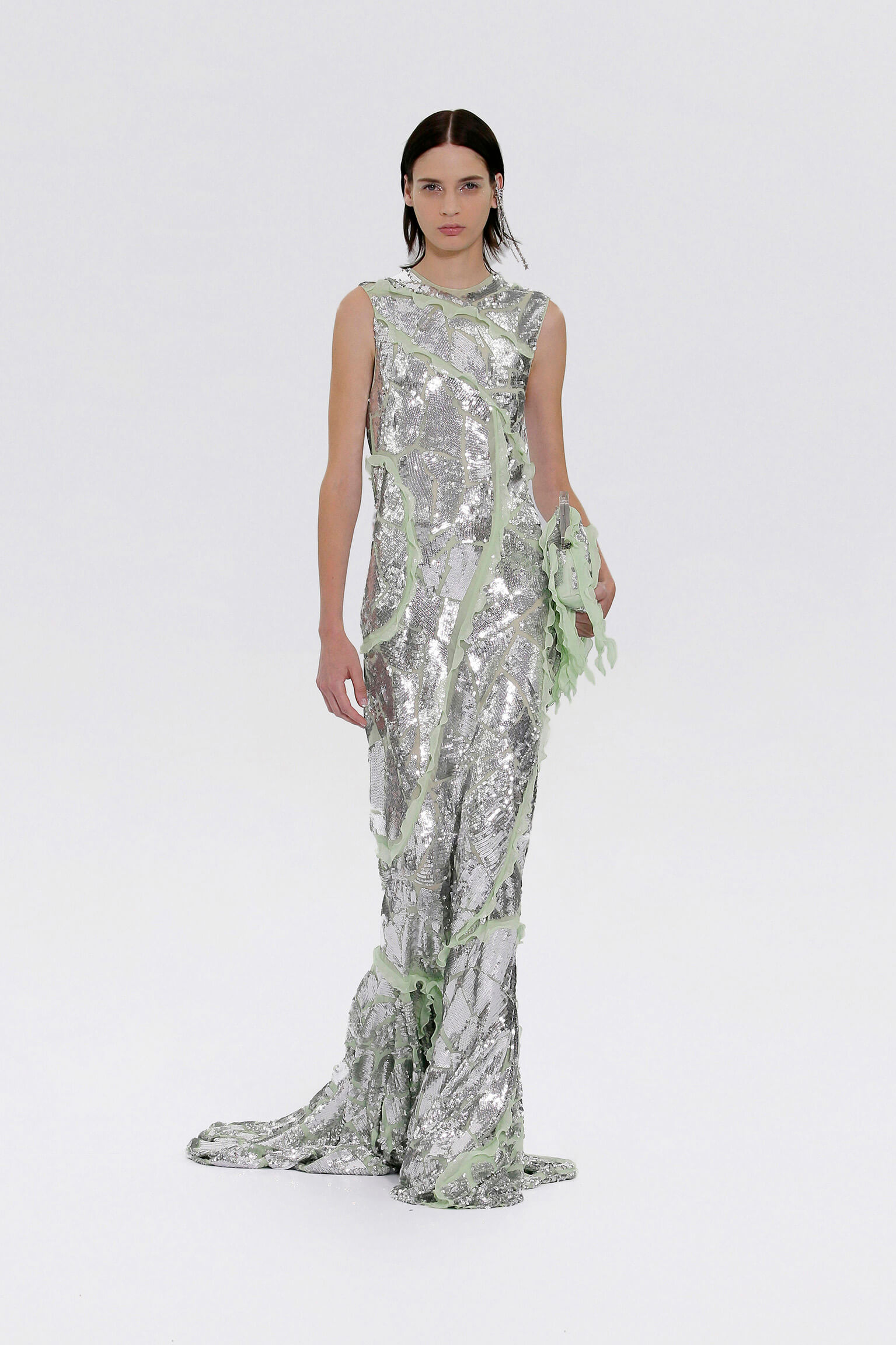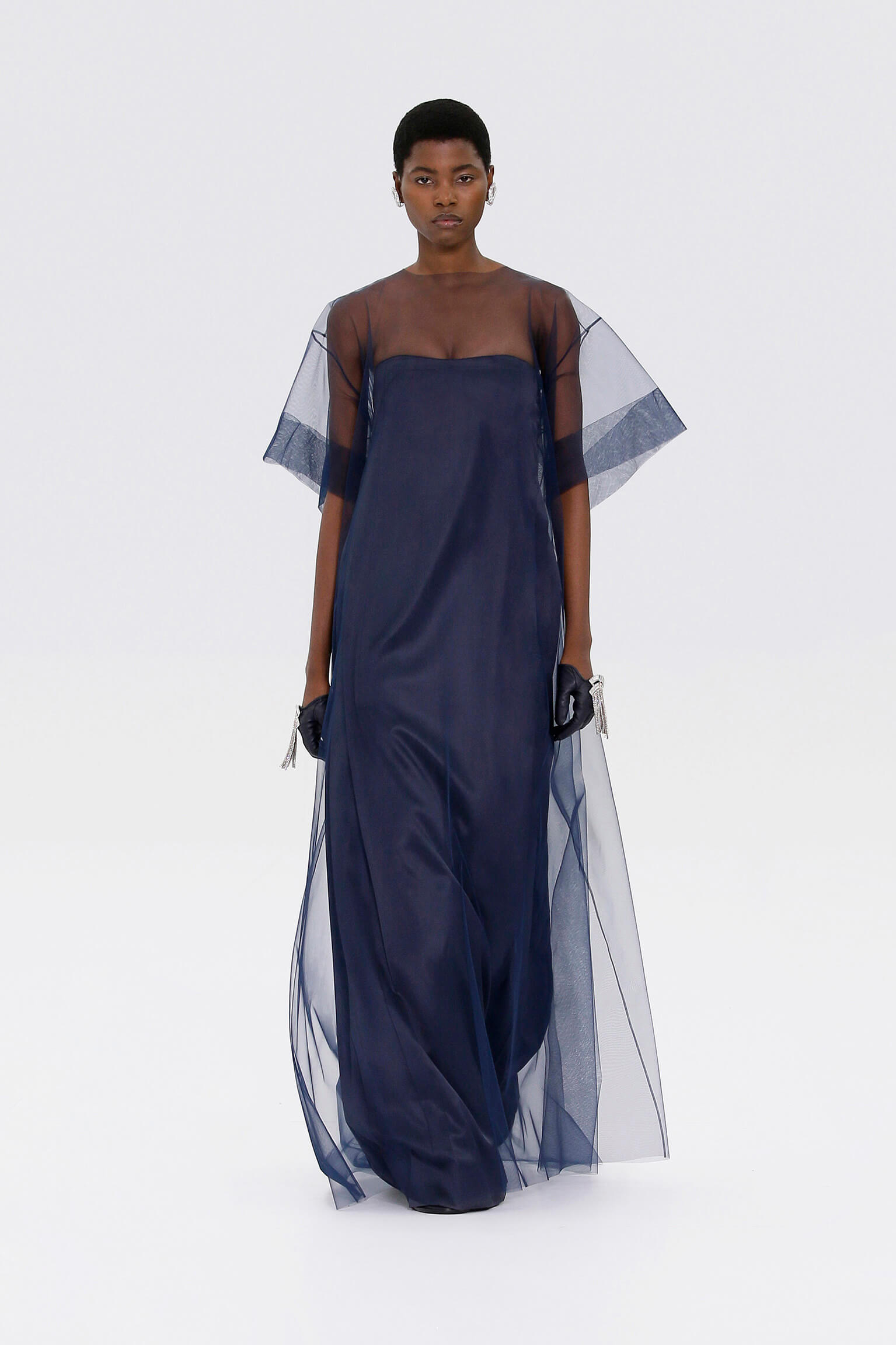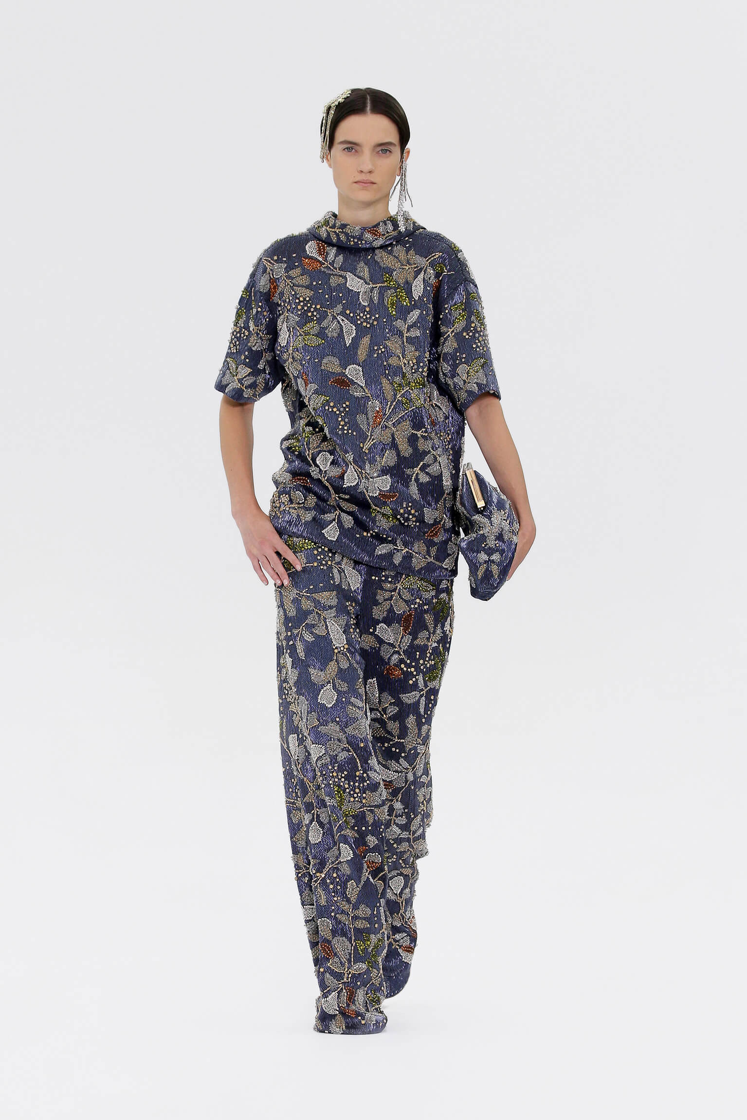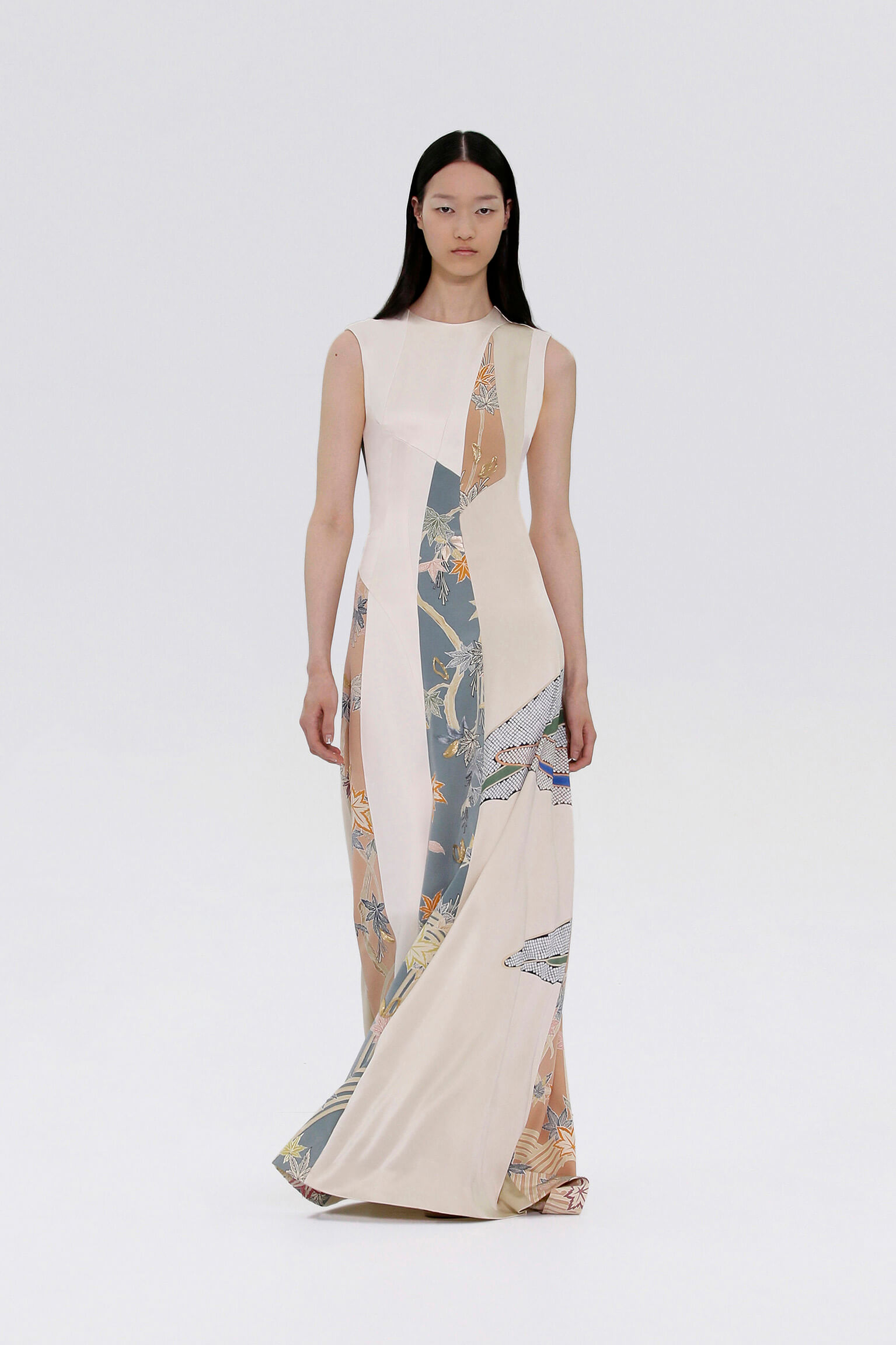 壓軸登場的薄紗晚裝是品味的現實呈現,東西方藝術文化的精湛結合透過刺繡展現,夢幻豐富的意像名為「秋之頌」,如流水傾瀉而下的楓葉圖案是 1700 年代的經典樣式。
