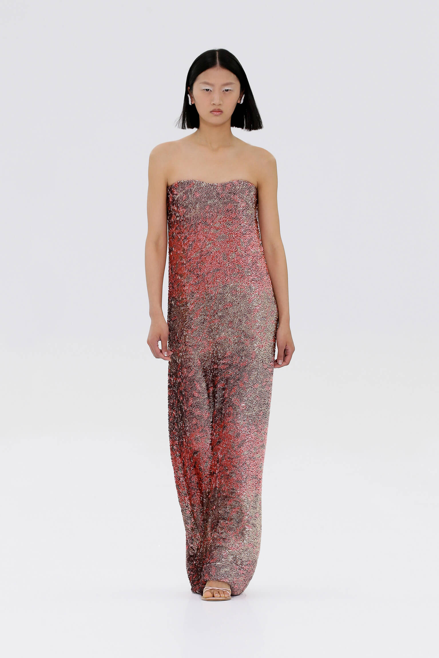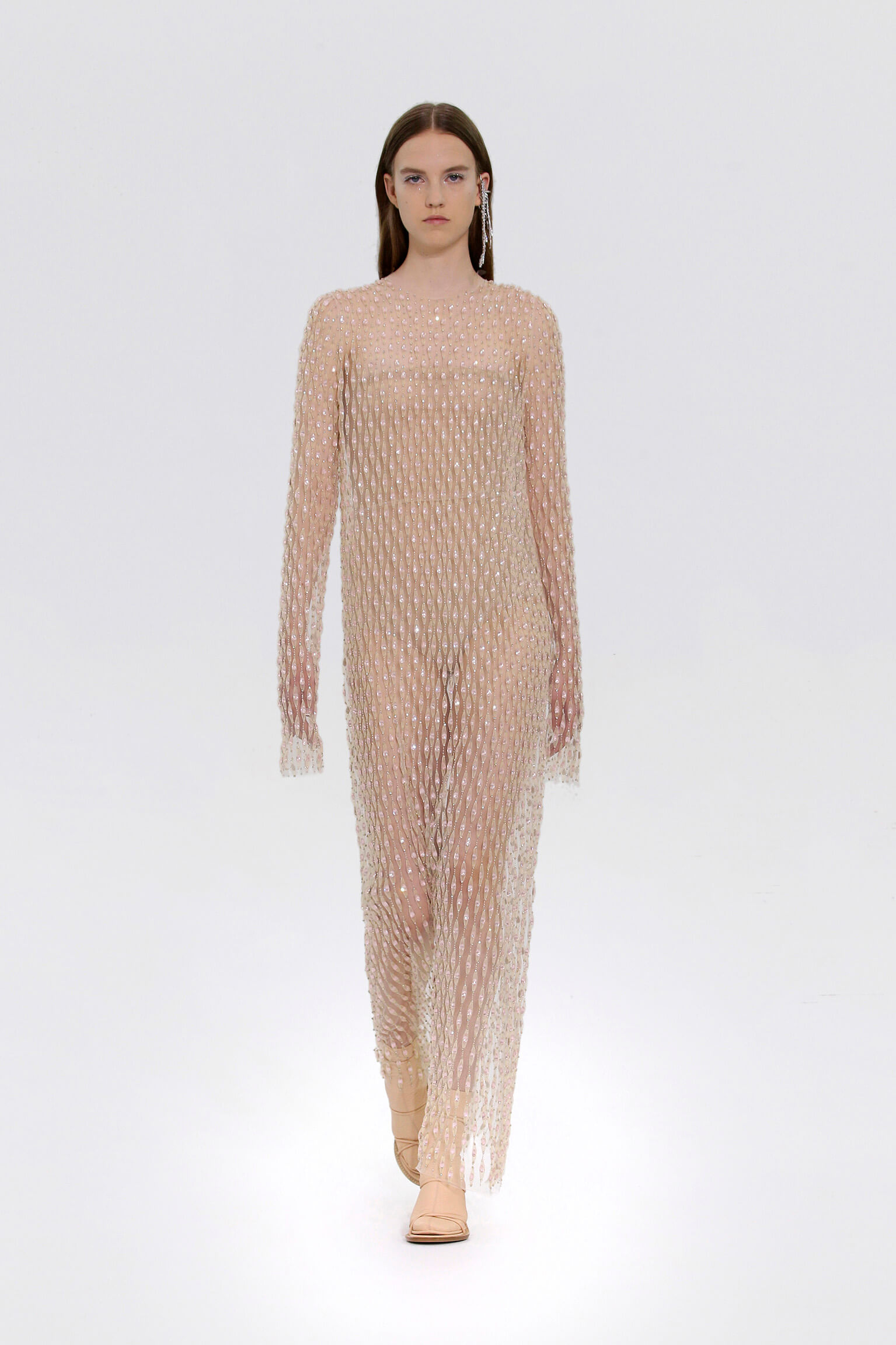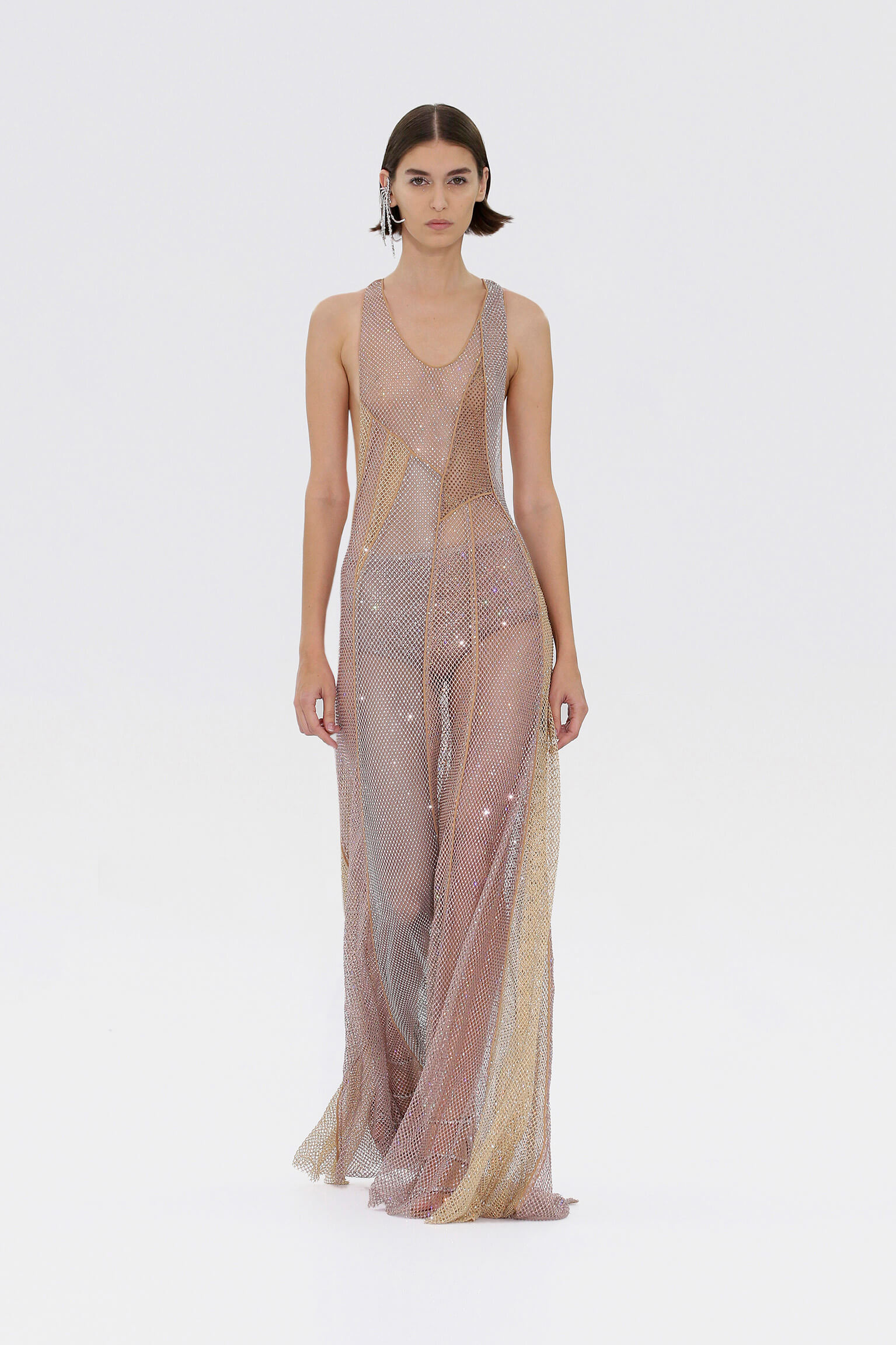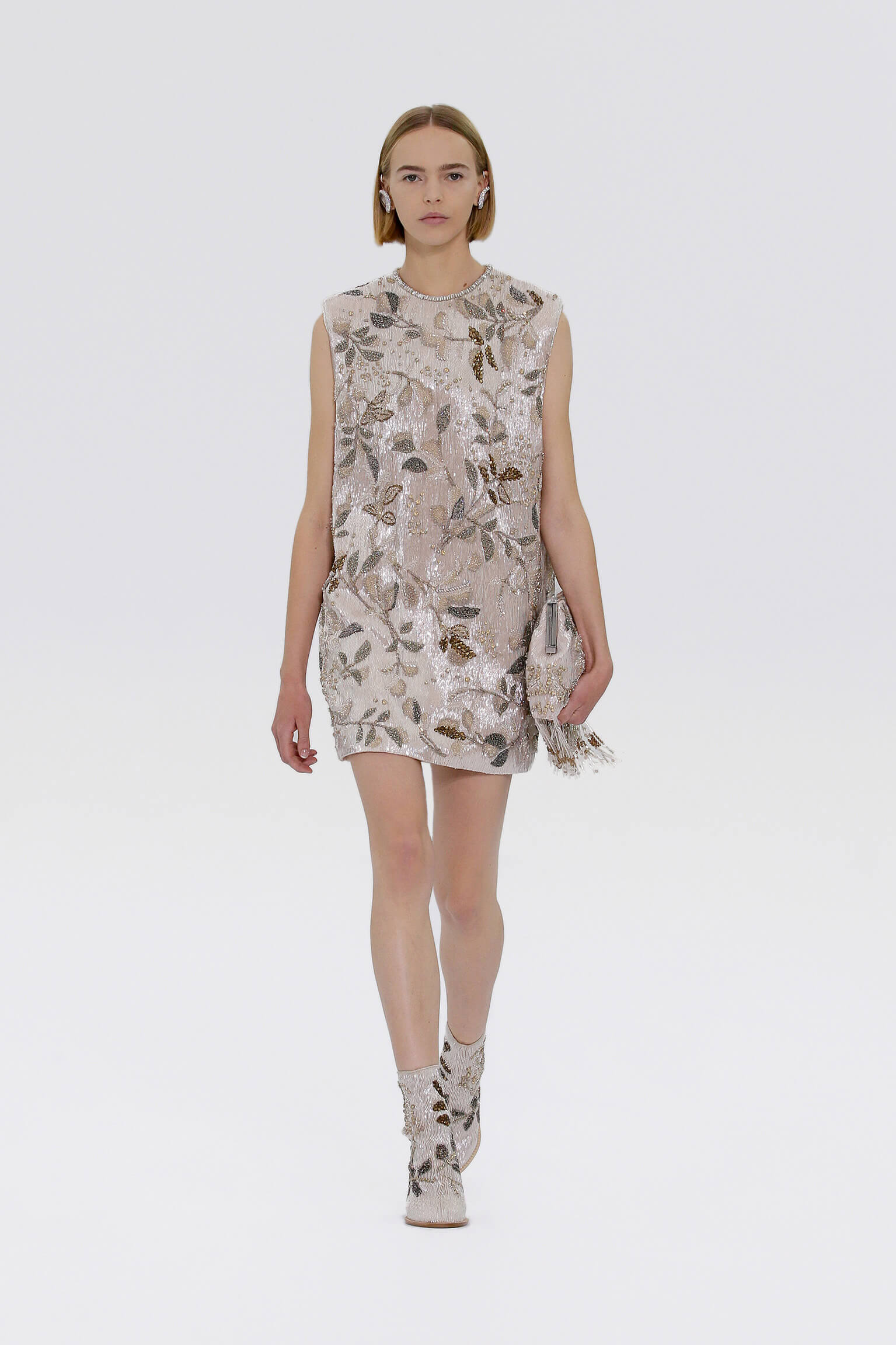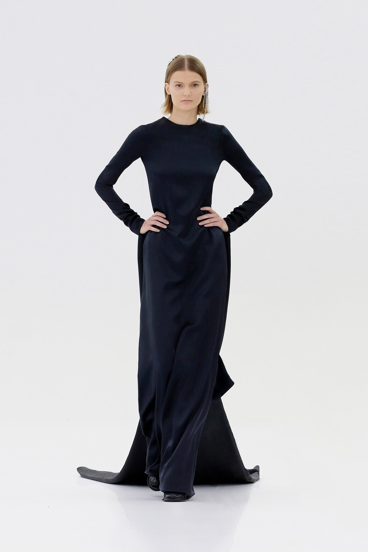 壓軸登場的薄紗晚裝是品味的現實呈現,東西方藝術文化的精湛結合透過刺繡展現,夢幻豐富的意像名為「秋之頌」,如流水傾瀉而下的楓葉圖案是 1700 年代的經典樣式。