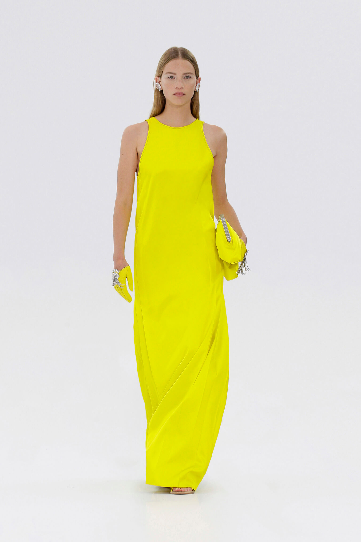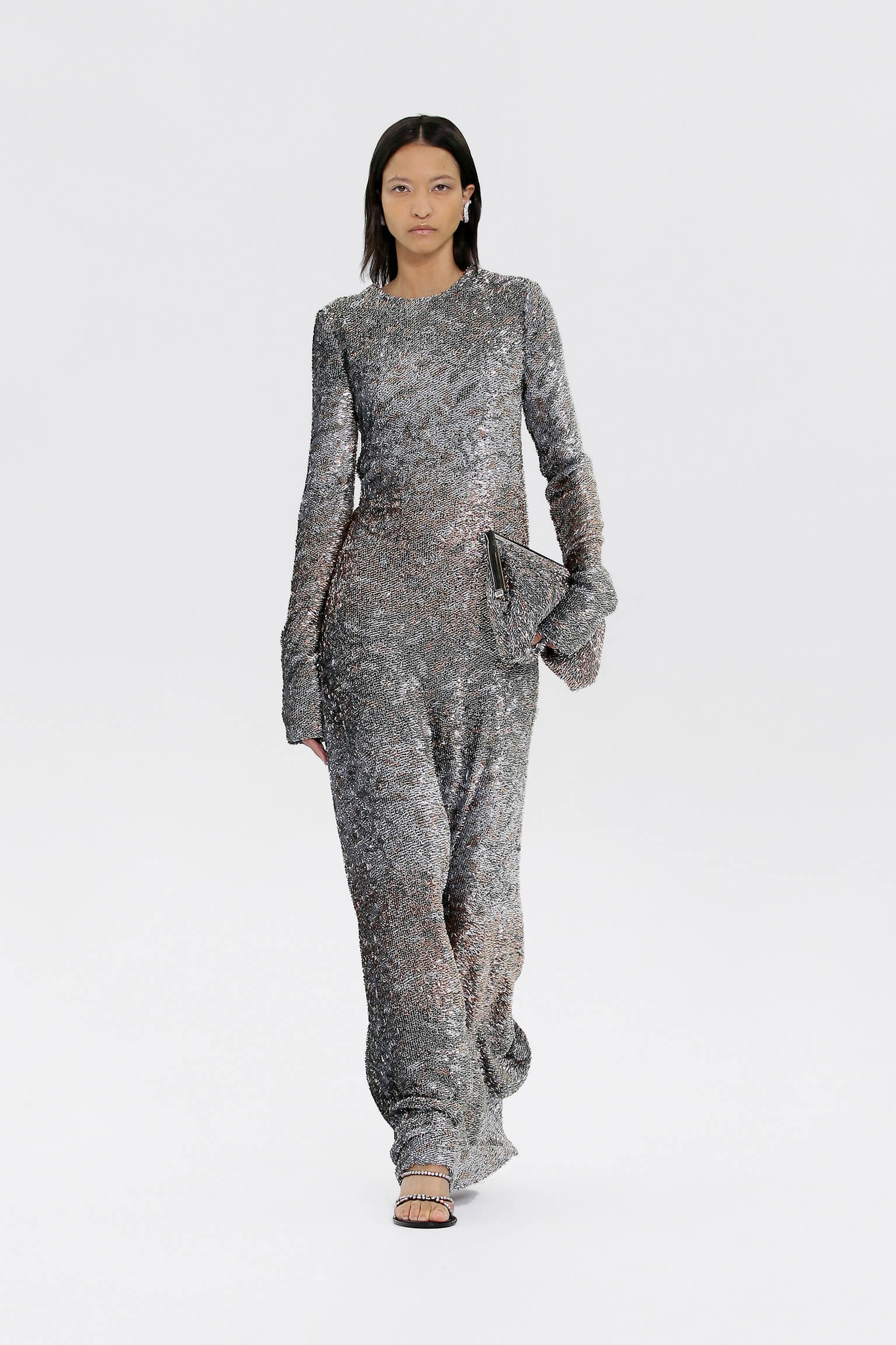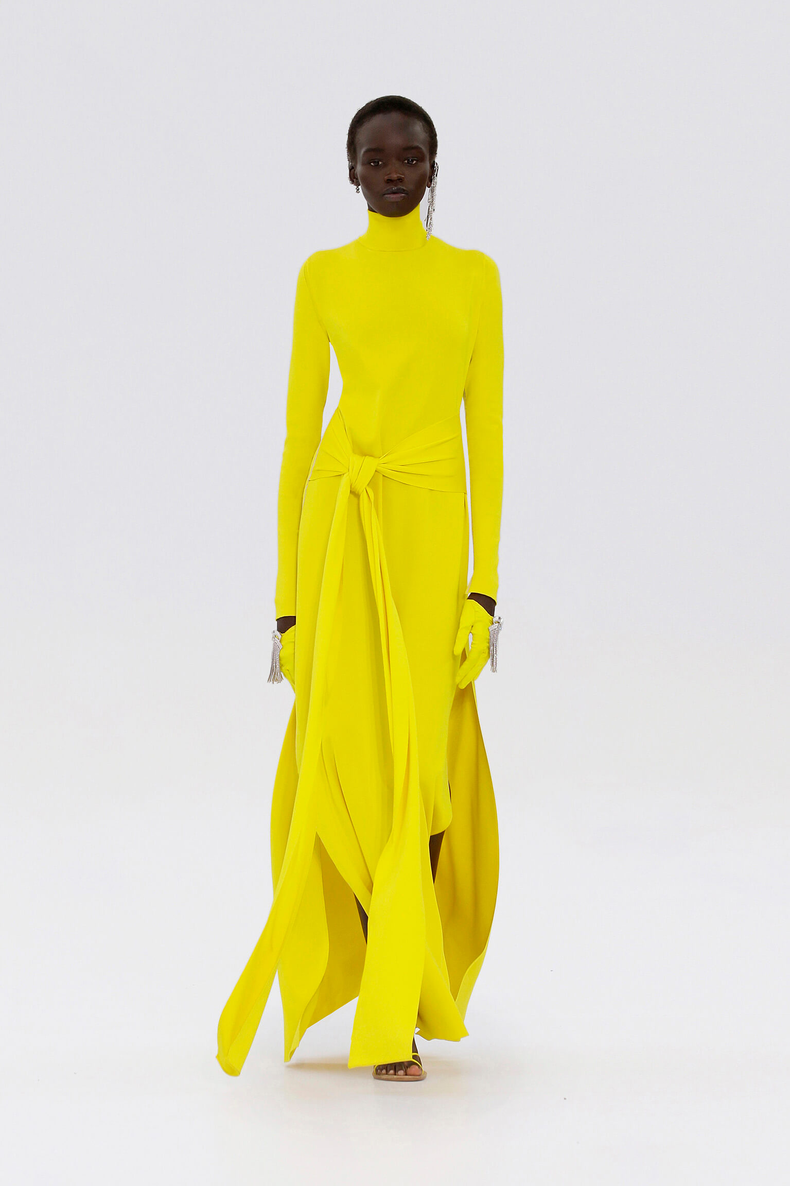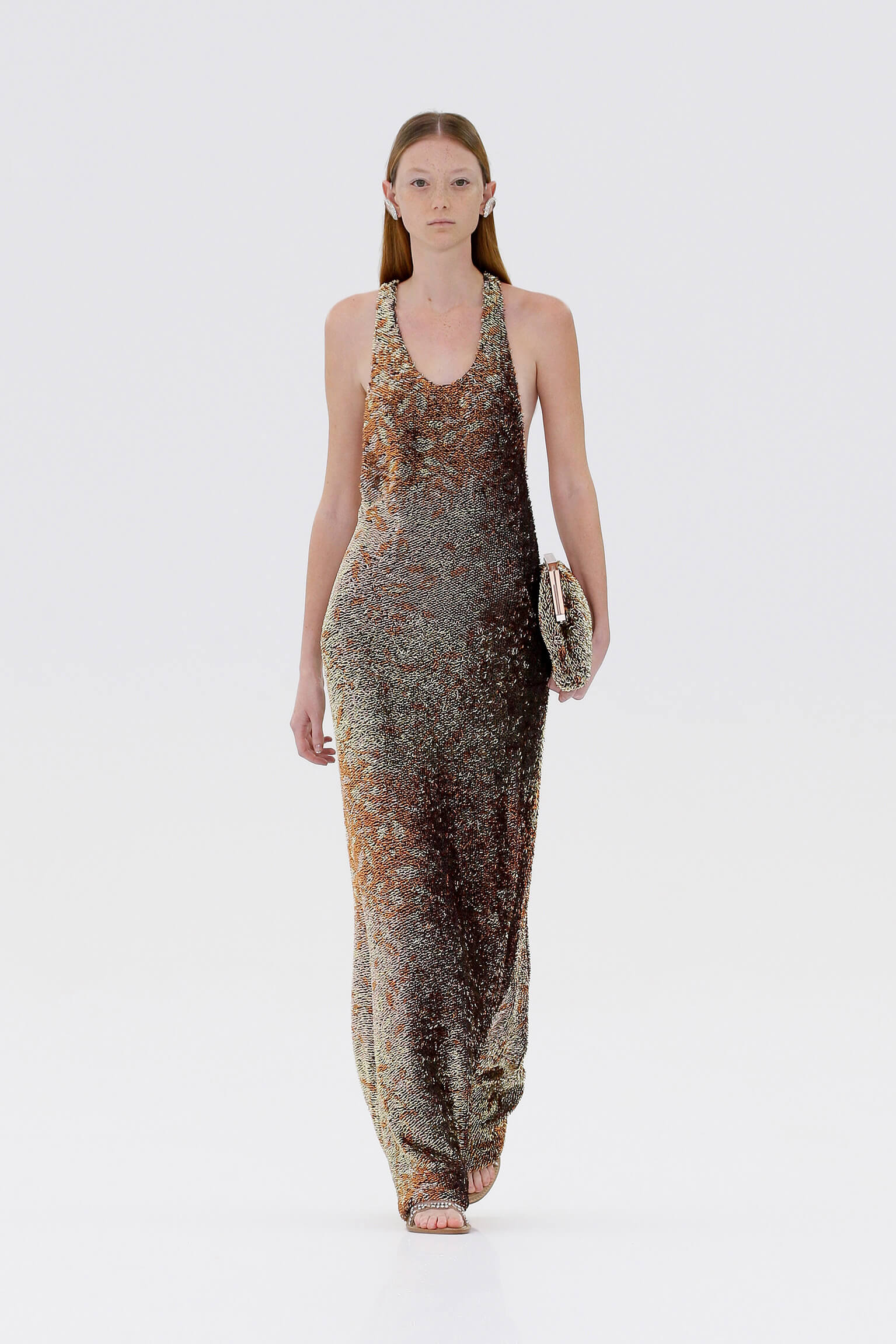 壓軸登場的薄紗晚裝是品味的現實呈現,東西方藝術文化的精湛結合透過刺繡展現,夢幻豐富的意像名為「秋之頌」,如流水傾瀉而下的楓葉圖案是 1700 年代的經典樣式。