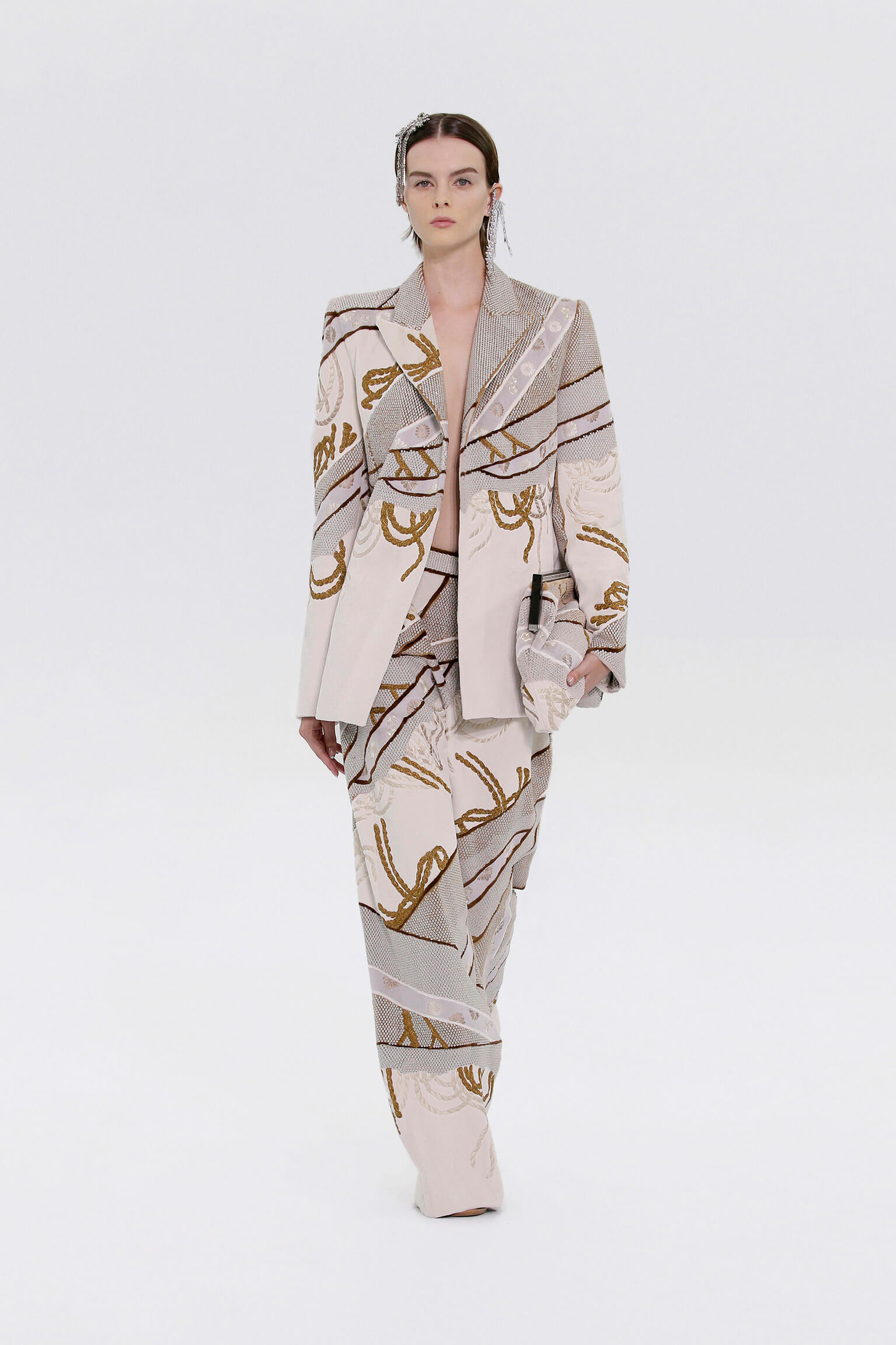 人本精神結合高訂的傳統技藝,嶄新的價值觀、嶄新的視點為經典的物料和手法帶來全新的結果、令人眼前一亮的設計。18 世紀的和服古布經過演繹勾勒出未來的輪廓。當然 FENDI 皮草工坊超卓造詣得到進一步的詮釋和發揮的空間,羊駝毛西裝及干邑色小牛皮單品線條俐落,縫線細節強調方正的結構。西裝和連身裙的襯裡和絎縫圖案更具心思,在看不見的位置也有三個城市的特質,採用傳統日本布料,帶來令人愉悅的質感。剪絨貂皮西裝的嵌花藝術手法展示 18 世紀日本古布上的「繩山」圖案。