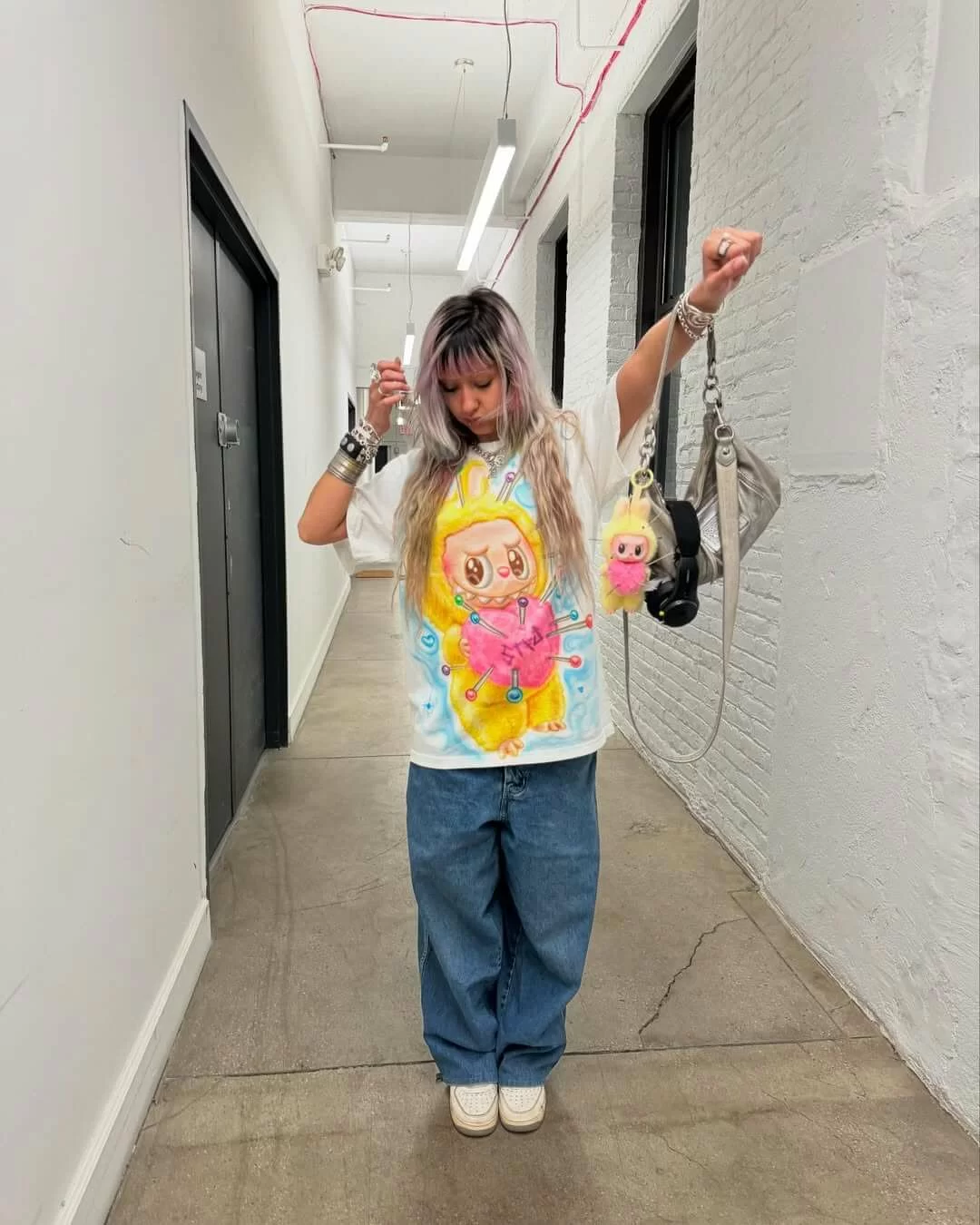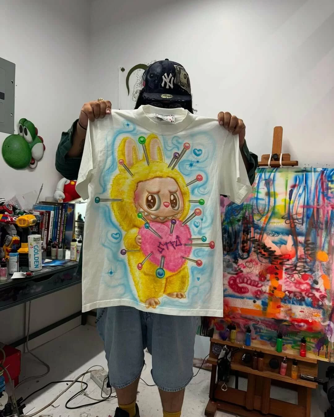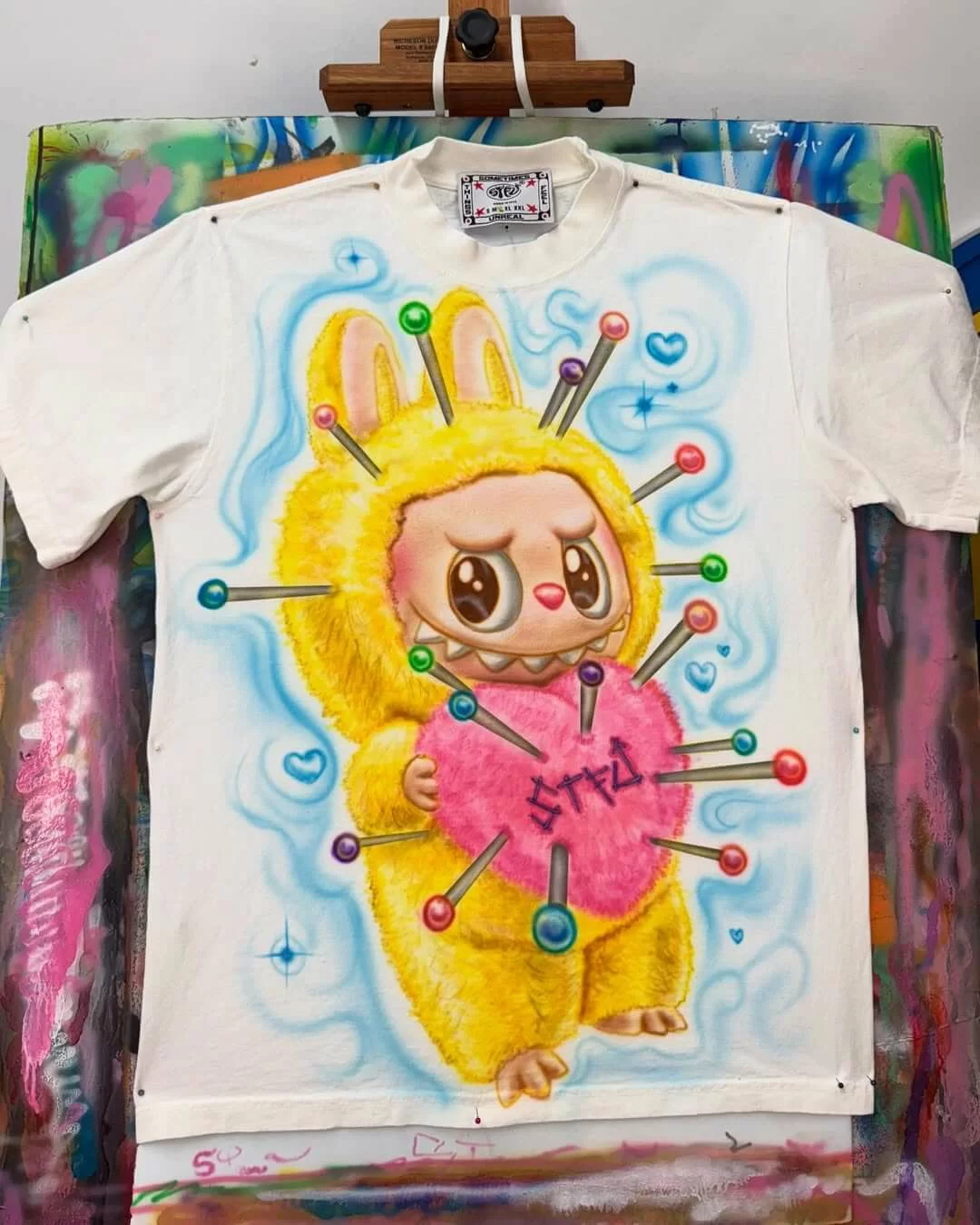 然後,OMI 就將這隻「邪惡版」LABUBU 外貌噴製在 T-SHIRT上,創作出這件獨一無二的 LABUBU 上衣,具創意之餘,也帶點讓人會心微笑的幽默感。