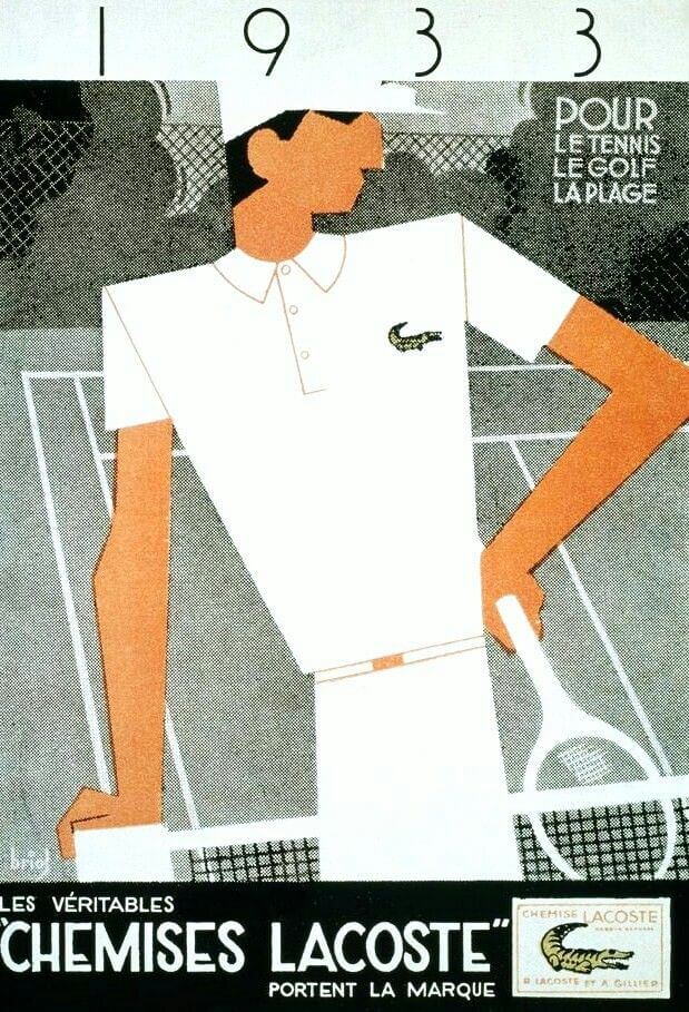 當時網球比賽的衣著是比較「休閒」,亦即是冷衫、襯衫、CHINO、領帶和帽子組成,令RENÉ LACOSTE發現傳統網球比賽的衣著非常限制在球場上的表現。於是LACOSTE在1933年,發明了世界上第一件現代網球衫—一種棉製的短袖PIQUÉ POLO衫,並繡上他的簽名鱷魚﹣歷史上第一個設計師徽標,徹底改變了當時網球比賽的衣著服裝,並導致一段屬於LACOSTE的「法式優雅」。