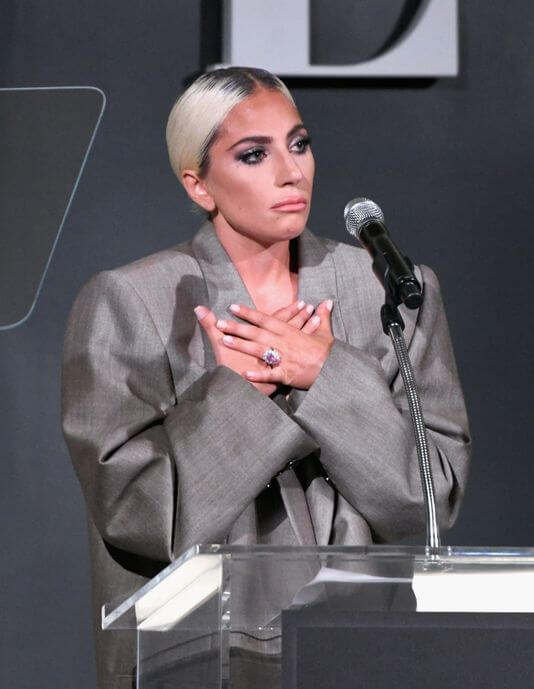 百變天后 Lady Gaga 周一於洛杉磯出席《Elle’s Annual Women in Hollywood Celebration》時發表感性致詞,穿上一身 Marc Jacobs 灰色 oversized 西服套裝的她提出有關荷里活女藝人遭性侵犯,心理健康和美容標準的議題;字裡行間更透露其與經理人 Christian Carino 訂婚這天大的喜訊,向未婚夫示謝意。