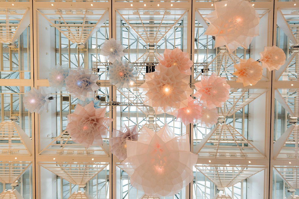 Studio Drift以花和自然結合的動態裝置「Meadow」, 由向下的花朶組合而成,其花瓣以充滿詩意的節奏開合。