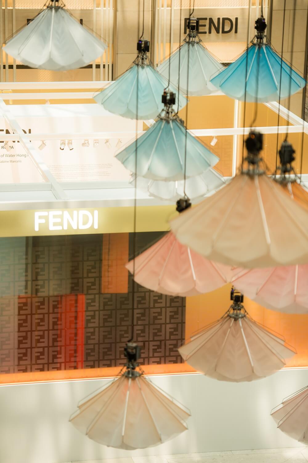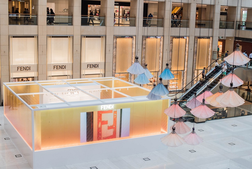FENDI「The Shapes of Water」的暖色設計調子,與動態花朵裝置「Meadow」的柔和色彩互相輝映,為置地廣塲增添一份大自然之時尚感。