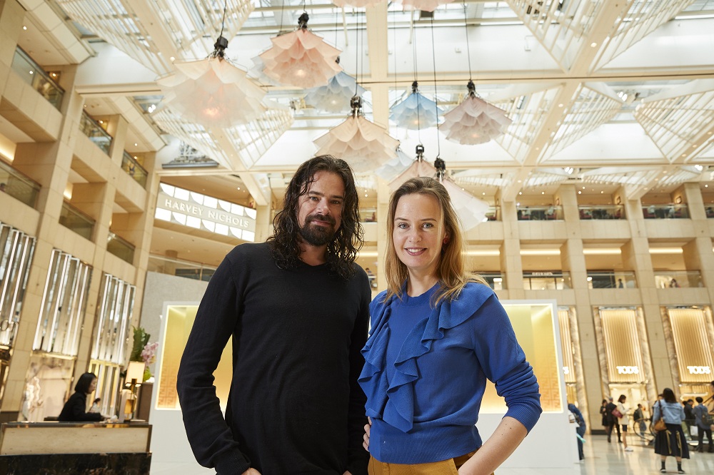 兩組裝置以簡約美學營造出大自然靈動的美感:「Meadow」花朶裝置呈現柔和色調,緩緩開合的自然形態,配以借用羅馬天空般暖色調設計、恰似隨性流動的「The Shapes of Water」噴泉,交織出當代時尚視野下,自然美藝融合的感官體驗,點綴置地廣塲中庭的喘息空間。