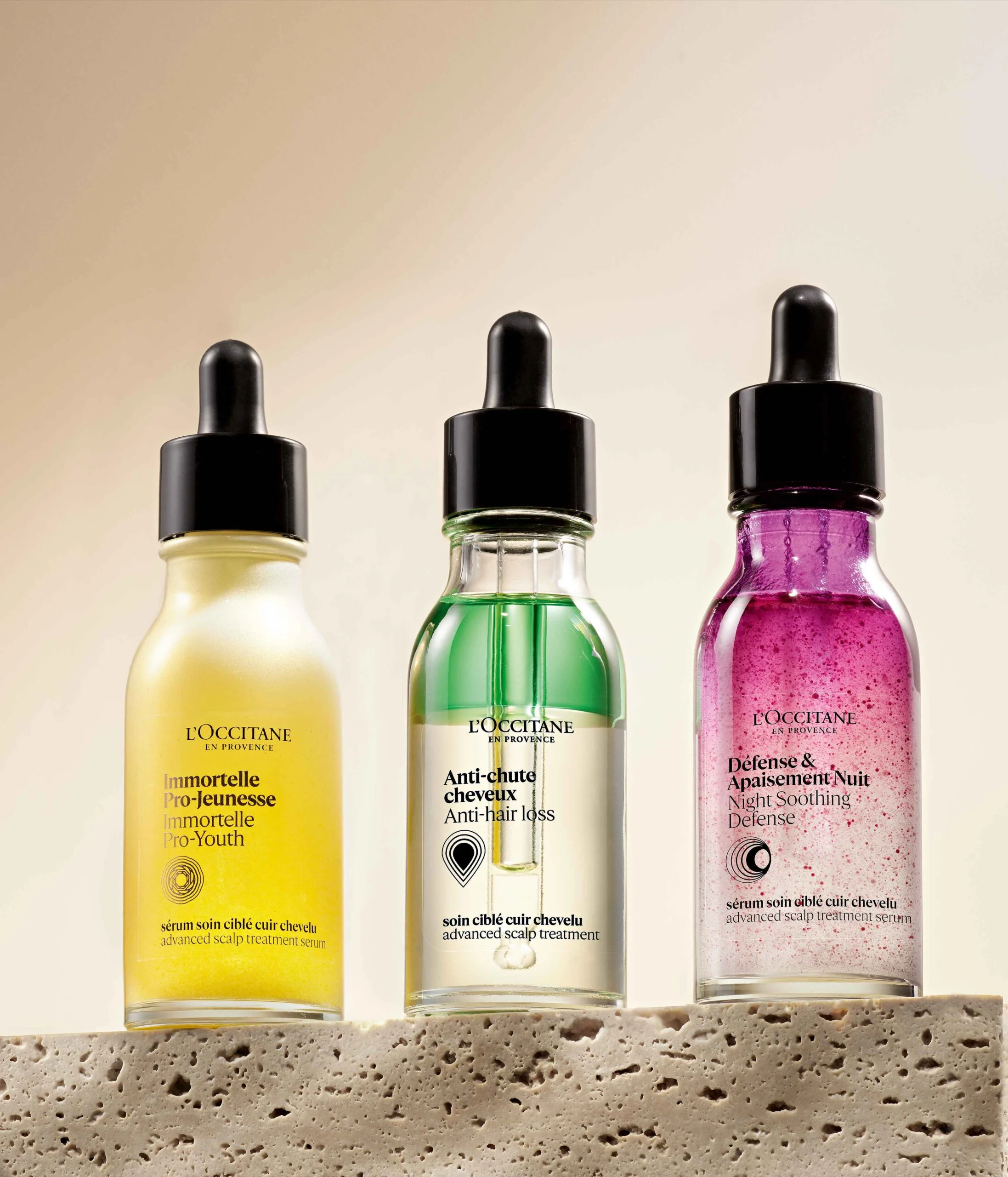 至於頭皮精華,大家可能比較陌生。系列三款精華分別預防老化、改善掉髮問題,以及針對敏感頭皮提供即時舒緩。蠟菊極致賦活頭皮精華 (左) 專提升頭皮活力,蠟菊精華及多種抗氧化成分可深層滋養頭皮,改善微循環,為頭髮打造最佳生長環境。草本療法防掉髮頭皮護理精華 (中) 的水油雙層質地能迅速滲透頭皮,其中的獐牙菜精華活絡頭皮、水芥精華減低荷爾蒙影響促進生長、甘草精華則舒緩頭皮壓力。夜間舒緩平衡頭皮精華 (右) 融合薰衣草精油、精胺酸及多種維他命,有效舒緩頭皮不適、減少紅腫搔癢,同時強化頭皮屏障。