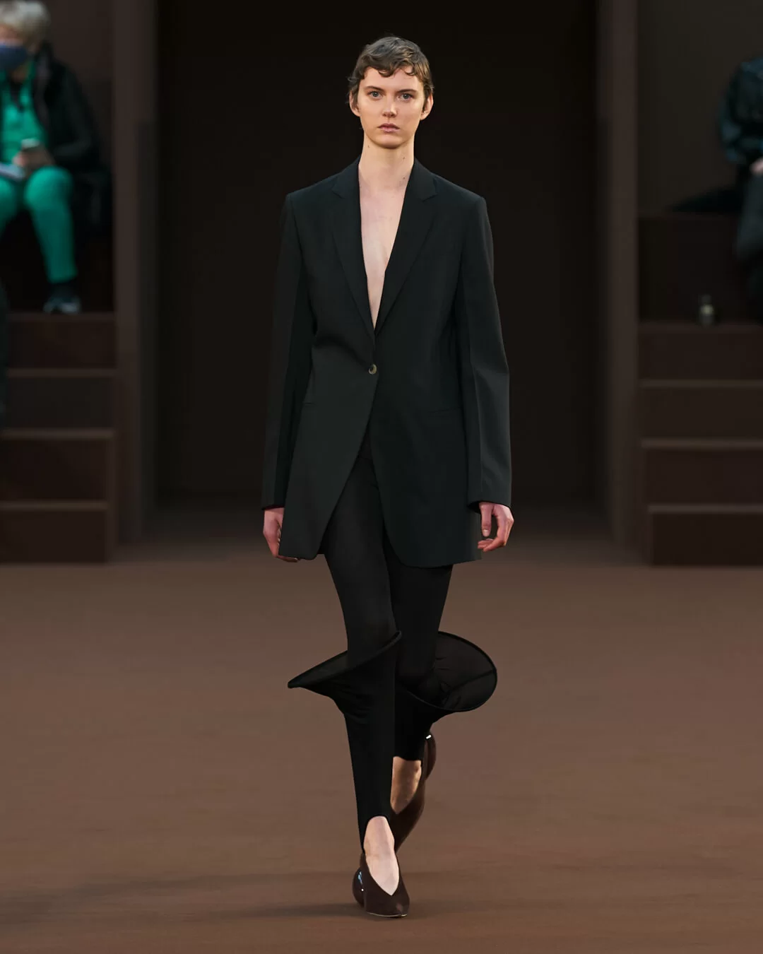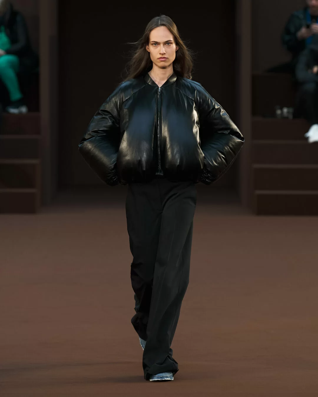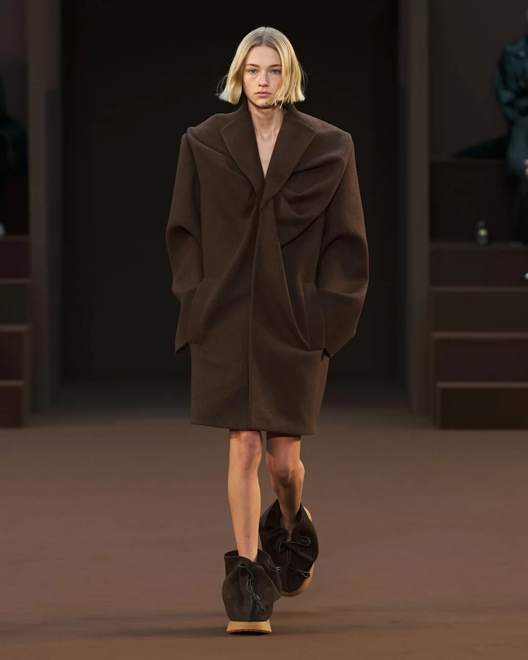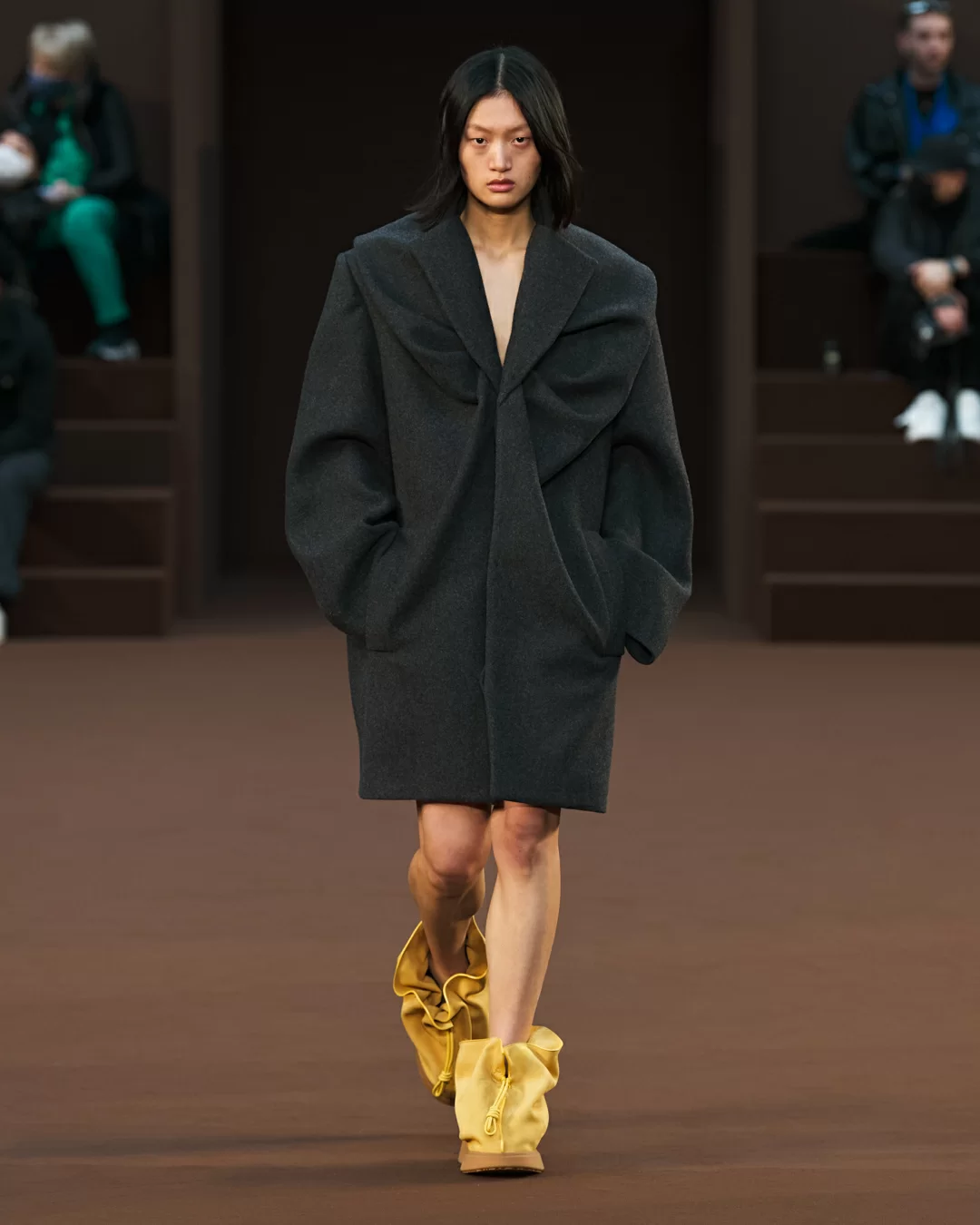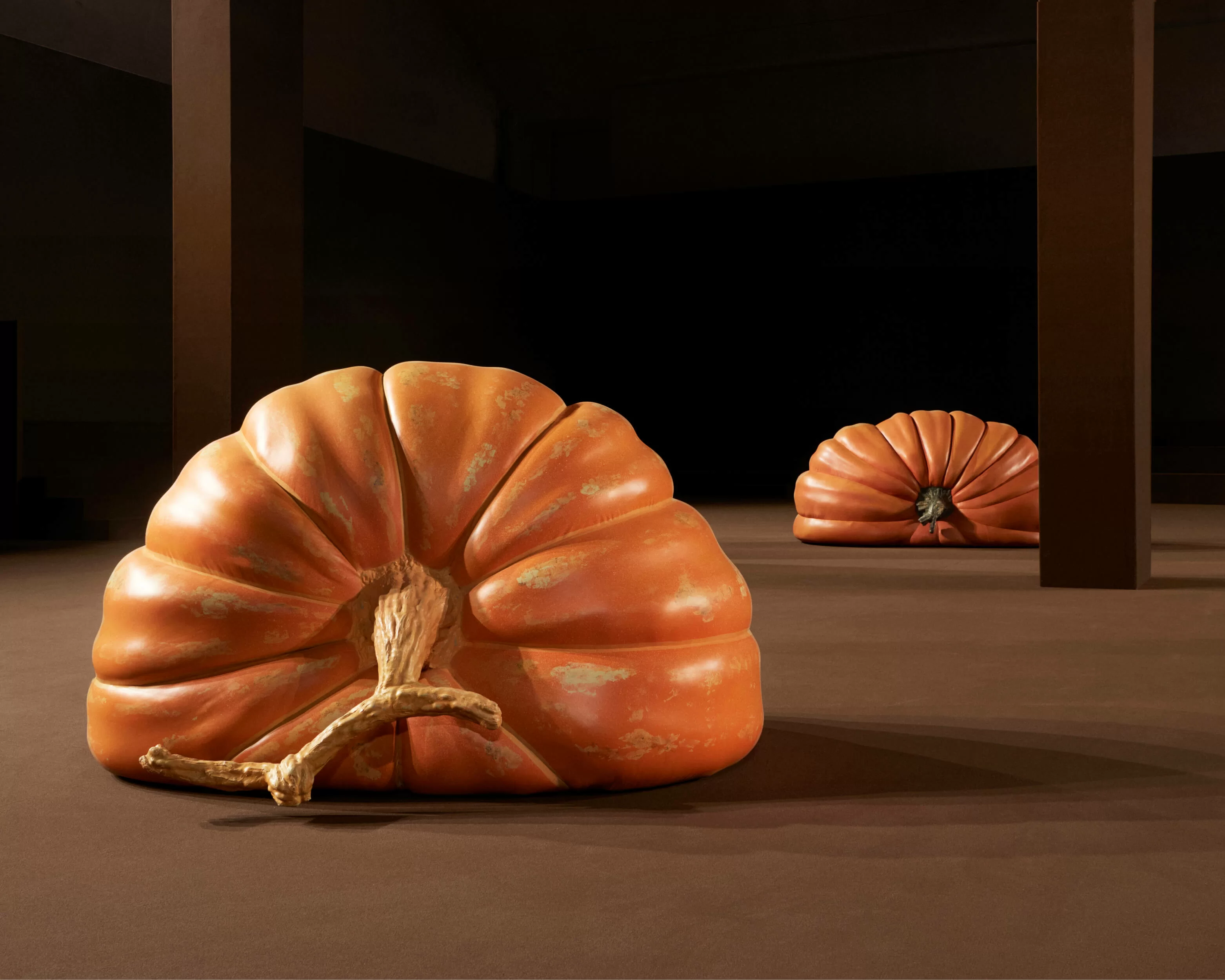 在巴黎時裝周期間,品牌 LOEWE 發佈了其最新 2022 秋冬系列。我們試著把目光投在時裝騷場內,能看到來自藝術家 ANTHEA HAMILTON 的創作《GIANT PUMPKINS》,場上皮革製的巨型南瓜散佈在啡色地氈上,如同在泥土上自然生長出來卻有一邊被壓扁,遠看的硬體型態到近處卻變得柔軟,當中的超現實意味,與上一季主題形成聯繫,亦傳達出今個系列的意念。
