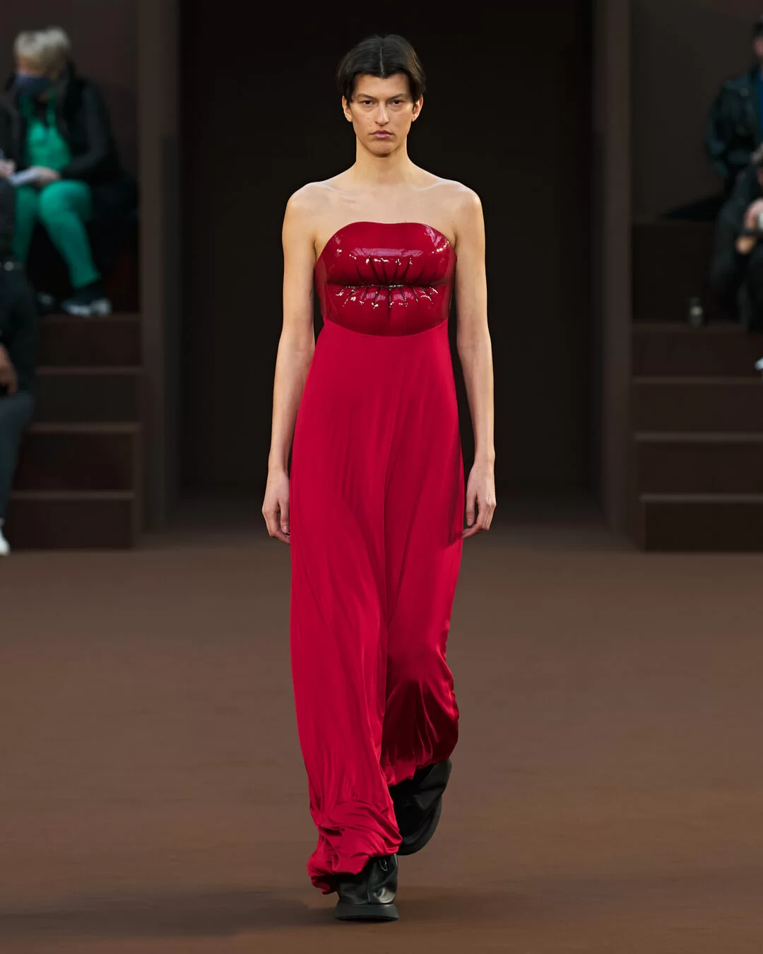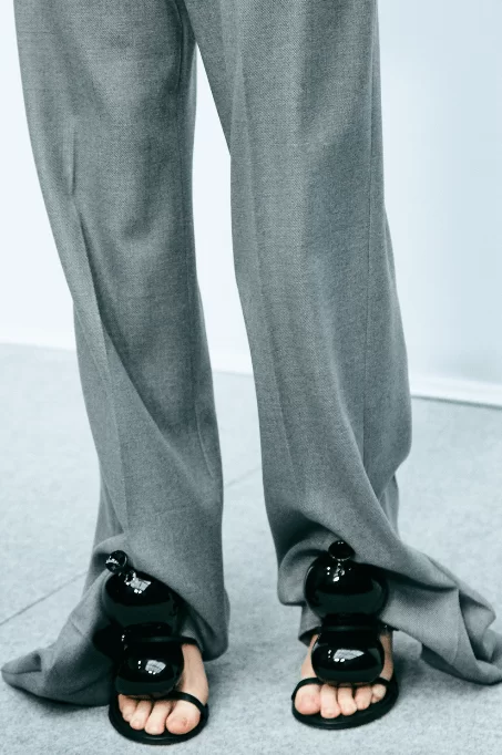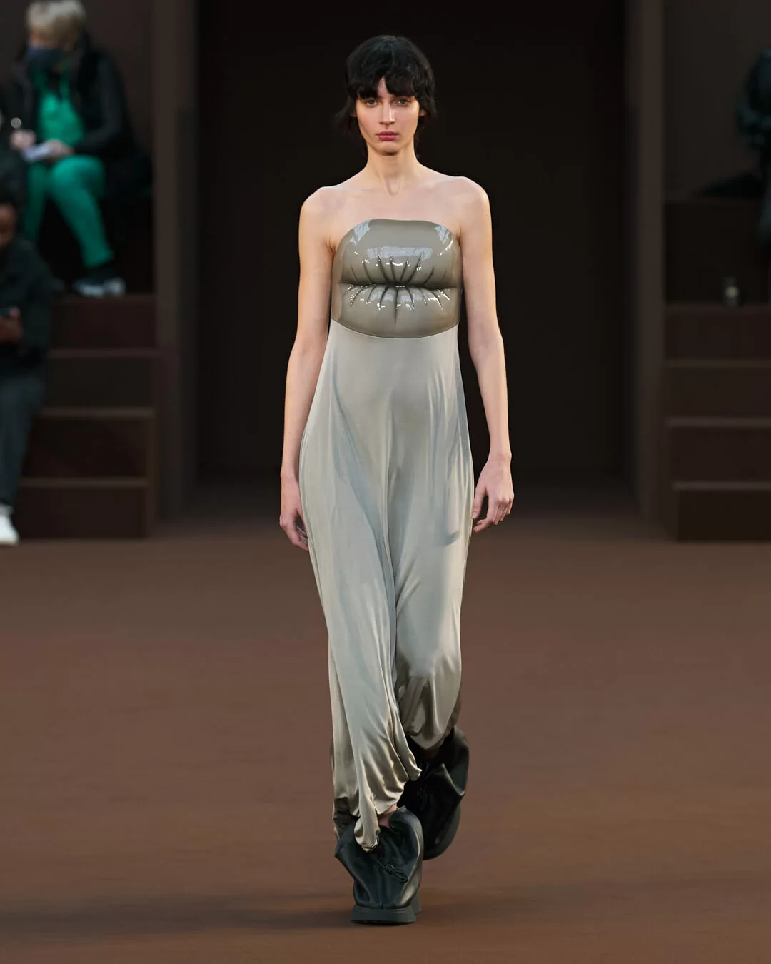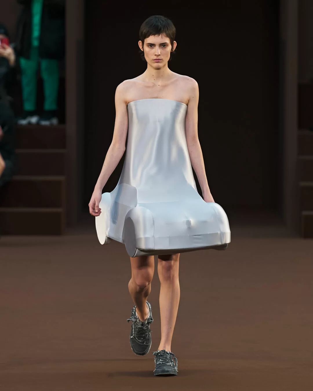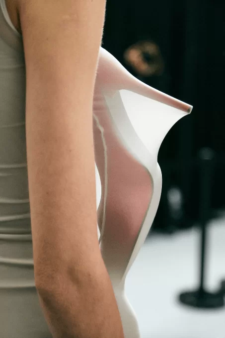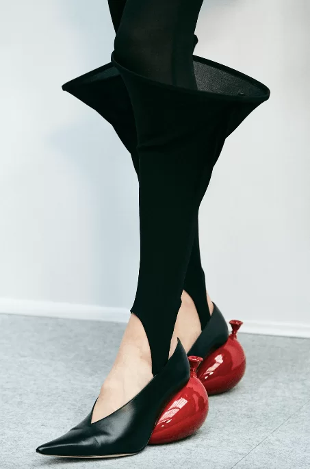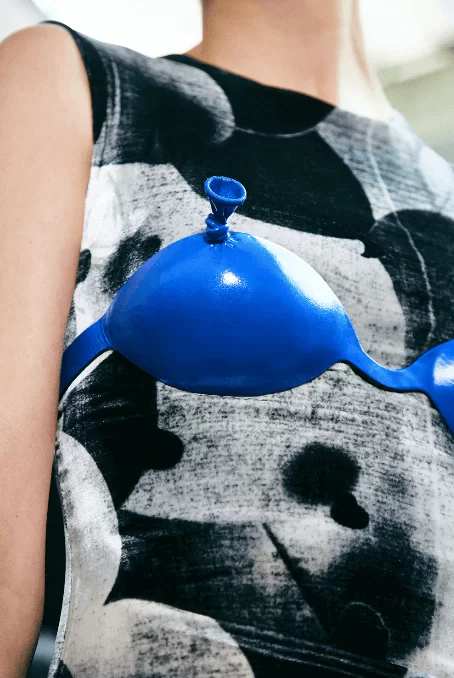 在設計中,可見一系列模壓皮裙、模壓毛氈緊身胸衣,從皮革、毛氈、絲綢到乳膠、樹脂等物料的運用,顯示出對人類從原始階段進化到工業革命時期的演變的敘述角度。比如說那條汽車模型下擺的迷你連身裙,比起實用性,更關乎工藝的概念。系列還融入 3D 打印技術,也有幾個造型呈現錯視效果,而代表了脆弱性的大量氣球細節出現在胸圍、鞋帶上,甚至輕薄的連身裙包裹著尖尖高跟鞋的設計細節,似被困住的感覺,卻又捕捉出動感,製造出衝突和觀感上的刺激。「將事物推向可能是非理性的東西」正如創意總監 JONATHAN ANDERSON 在後台採訪中說。氣球的爆破是隨時的,有著無時無刻的緊張感,他試圖透過超現實主義的觀點對此進行探索,而此時此刻世界正面對 COVID 和戰爭危機爆發,似乎這種表達亦非常切合當下緊張局勢的現實。