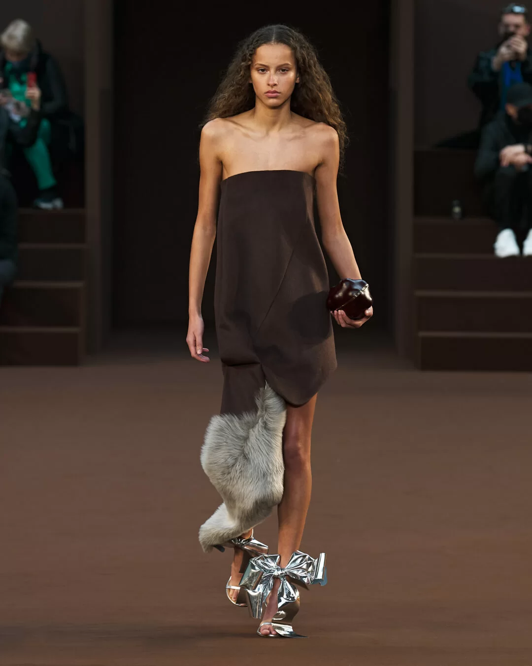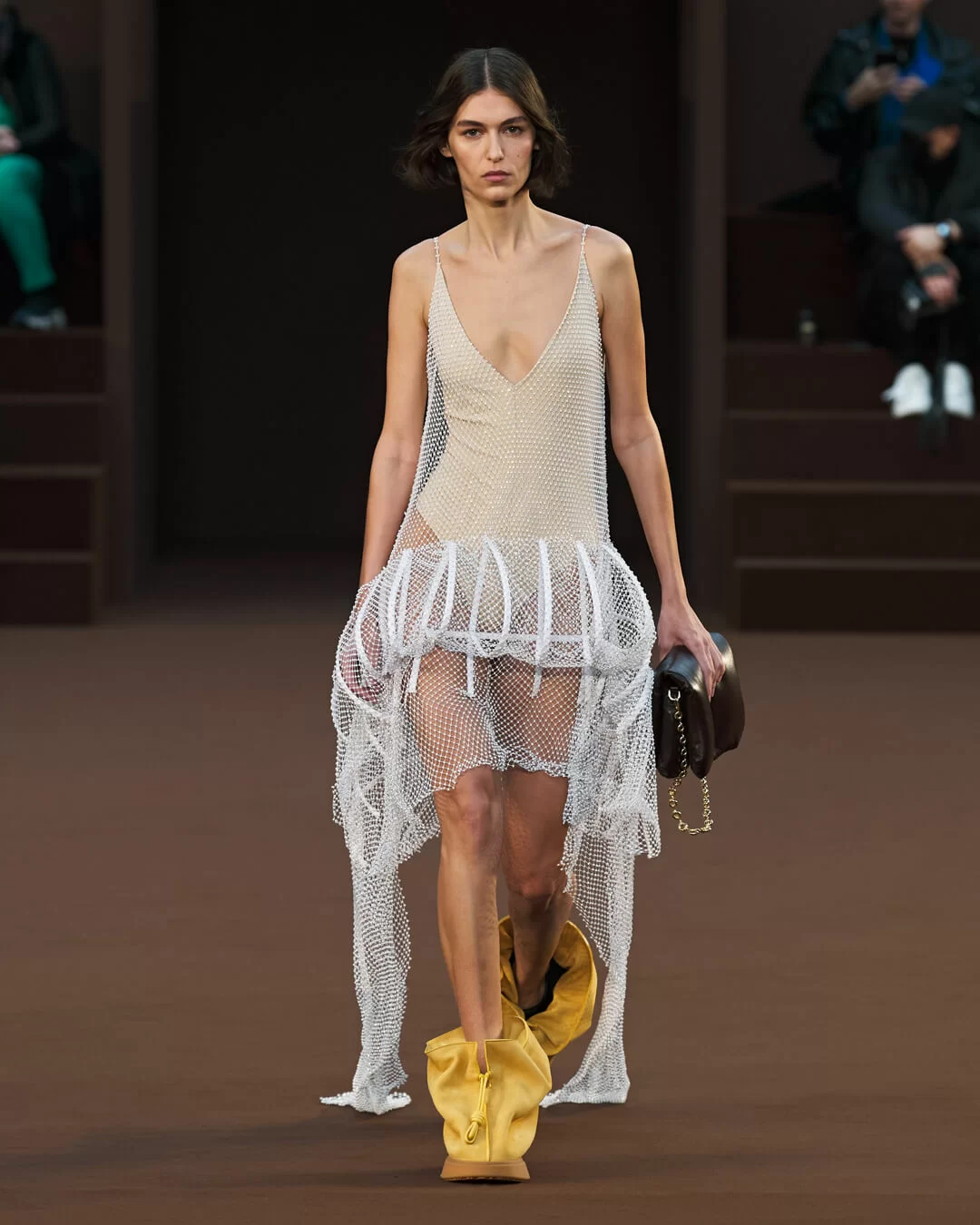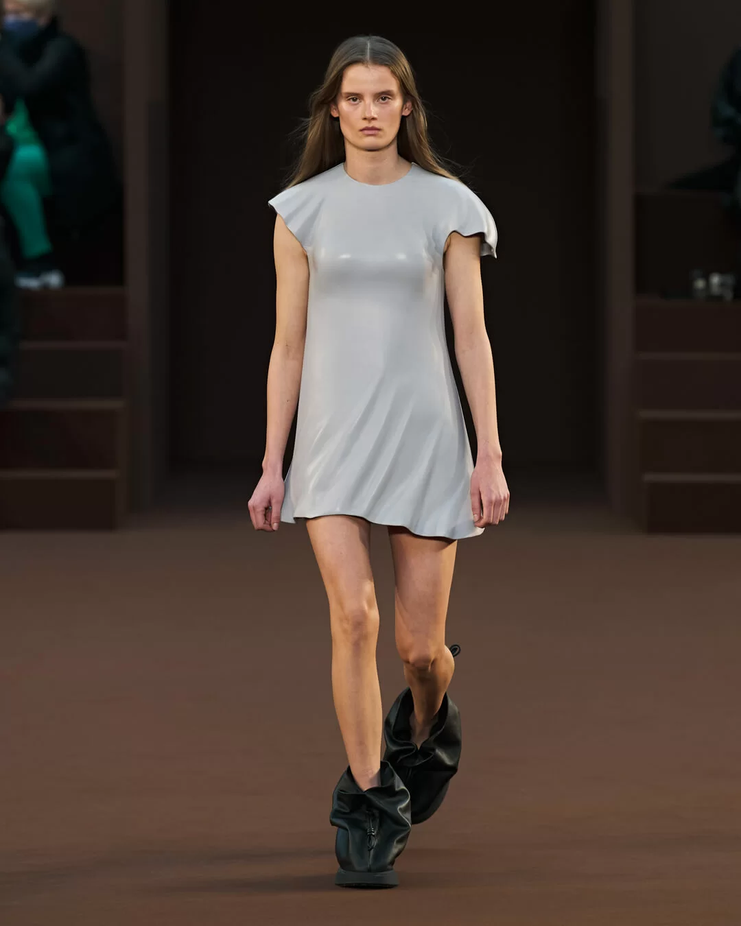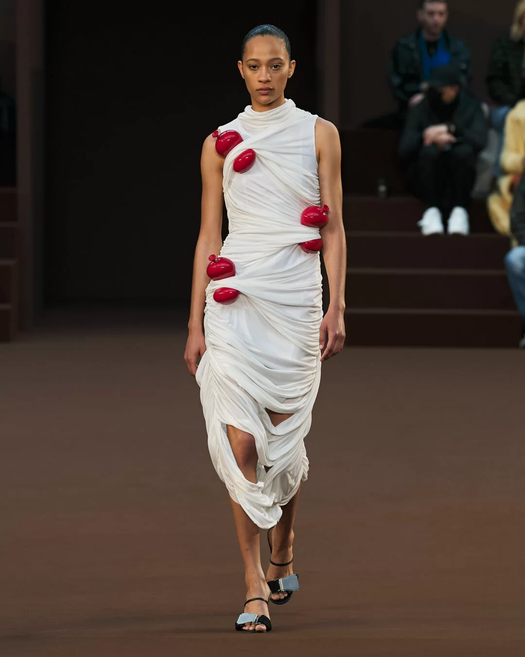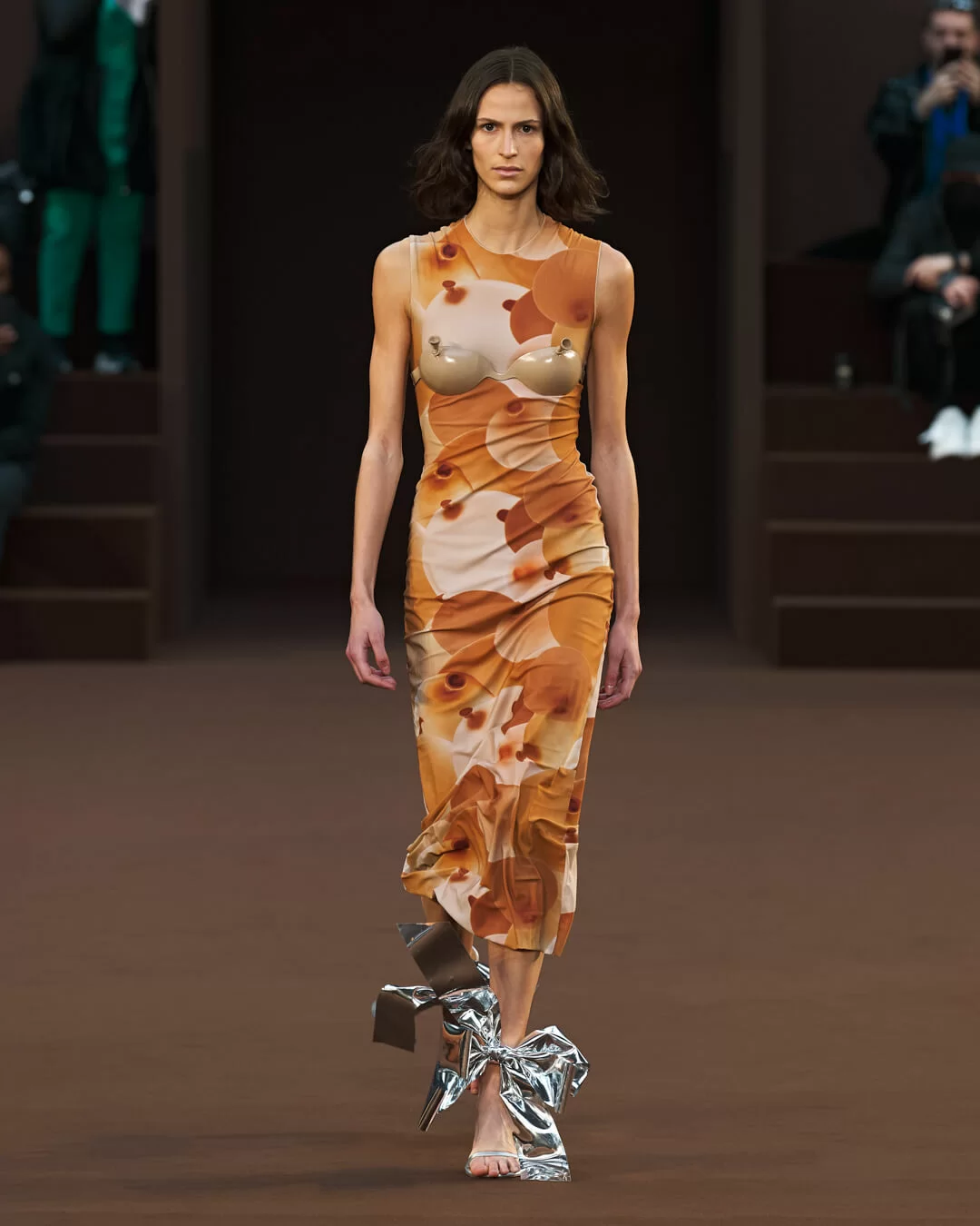 在設計中,可見一系列模壓皮裙、模壓毛氈緊身胸衣,從皮革、毛氈、絲綢到乳膠、樹脂等物料的運用,顯示出對人類從原始階段進化到工業革命時期的演變的敘述角度。比如說那條汽車模型下擺的迷你連身裙,比起實用性,更關乎工藝的概念。系列還融入 3D 打印技術,也有幾個造型呈現錯視效果,而代表了脆弱性的大量氣球細節出現在胸圍、鞋帶上,甚至輕薄的連身裙包裹著尖尖高跟鞋的設計細節,似被困住的感覺,卻又捕捉出動感,製造出衝突和觀感上的刺激。「將事物推向可能是非理性的東西」正如創意總監 JONATHAN ANDERSON 在後台採訪中說。氣球的爆破是隨時的,有著無時無刻的緊張感,他試圖透過超現實主義的觀點對此進行探索,而此時此刻世界正面對 COVID 和戰爭危機爆發,似乎這種表達亦非常切合當下緊張局勢的現實。