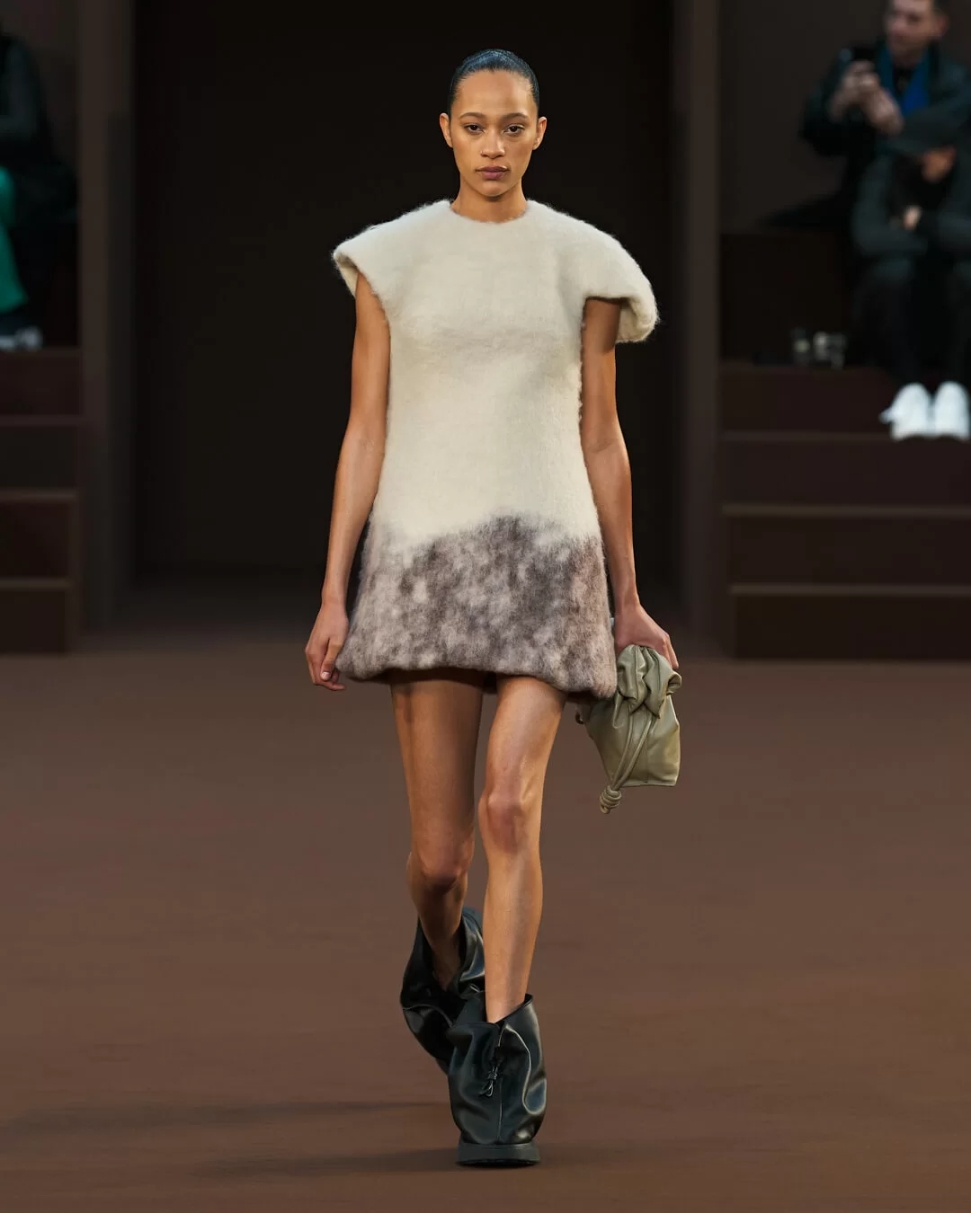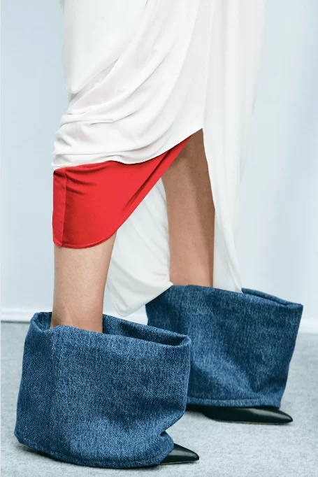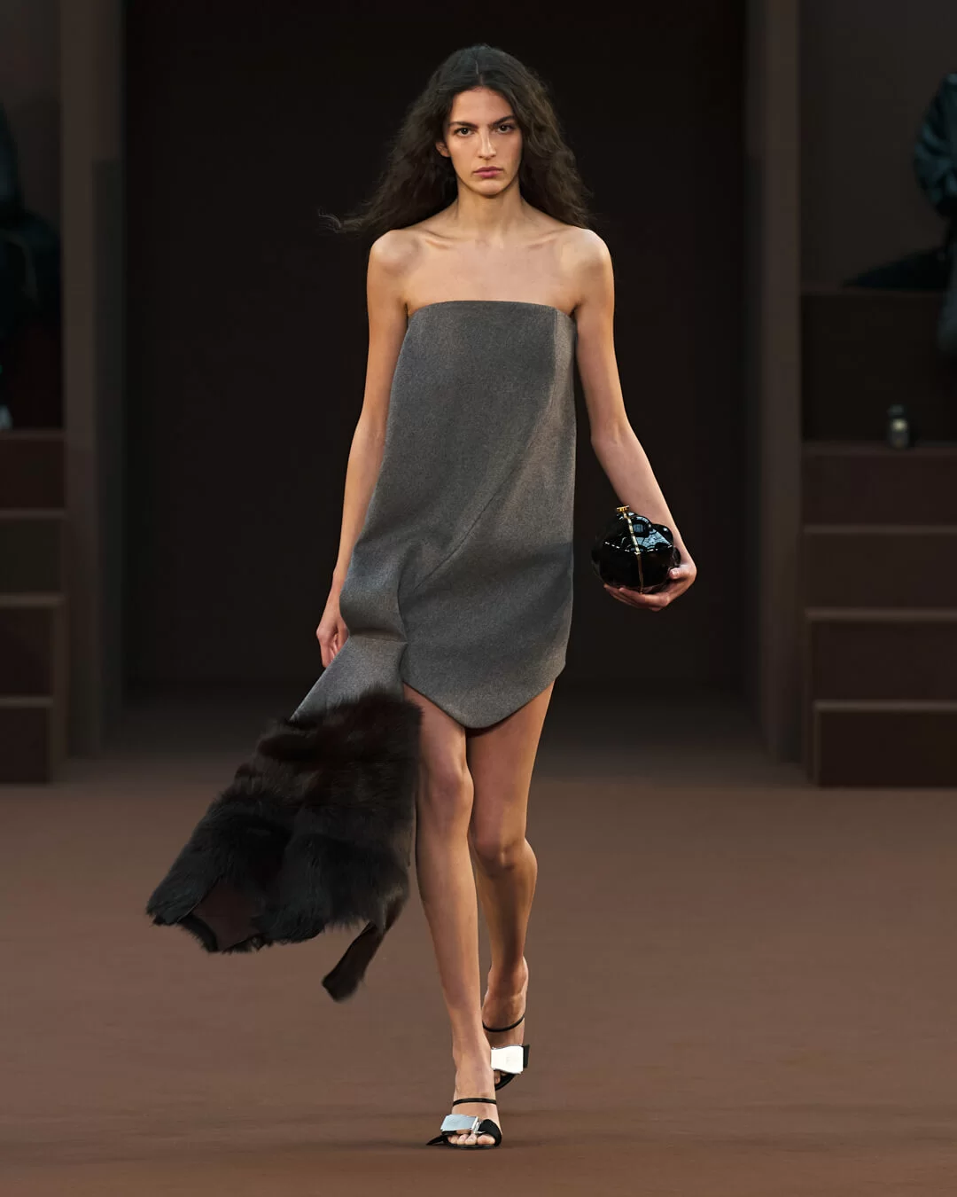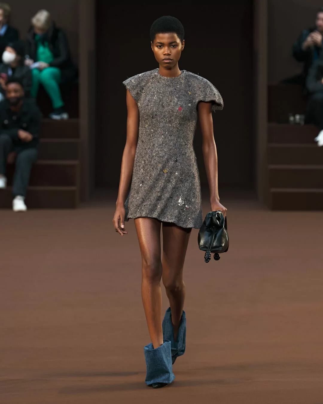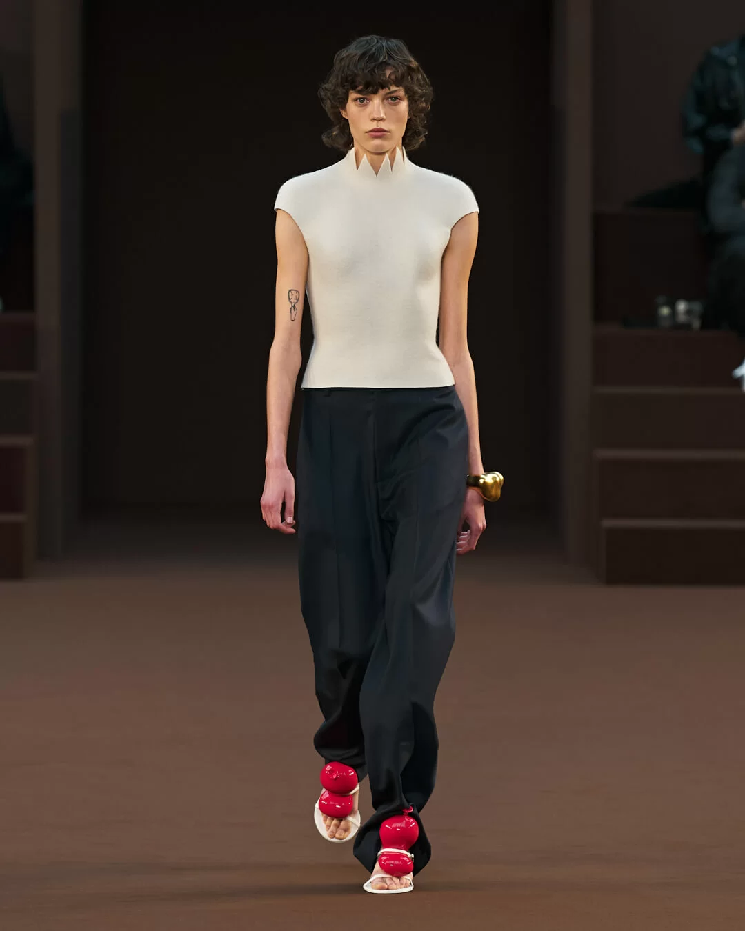 在設計中,可見一系列模壓皮裙、模壓毛氈緊身胸衣,從皮革、毛氈、絲綢到乳膠、樹脂等物料的運用,顯示出對人類從原始階段進化到工業革命時期的演變的敘述角度。比如說那條汽車模型下擺的迷你連身裙,比起實用性,更關乎工藝的概念。系列還融入 3D 打印技術,也有幾個造型呈現錯視效果,而代表了脆弱性的大量氣球細節出現在胸圍、鞋帶上,甚至輕薄的連身裙包裹著尖尖高跟鞋的設計細節,似被困住的感覺,卻又捕捉出動感,製造出衝突和觀感上的刺激。「將事物推向可能是非理性的東西」正如創意總監 JONATHAN ANDERSON 在後台採訪中說。氣球的爆破是隨時的,有著無時無刻的緊張感,他試圖透過超現實主義的觀點對此進行探索,而此時此刻世界正面對 COVID 和戰爭危機爆發,似乎這種表達亦非常切合當下緊張局勢的現實。
