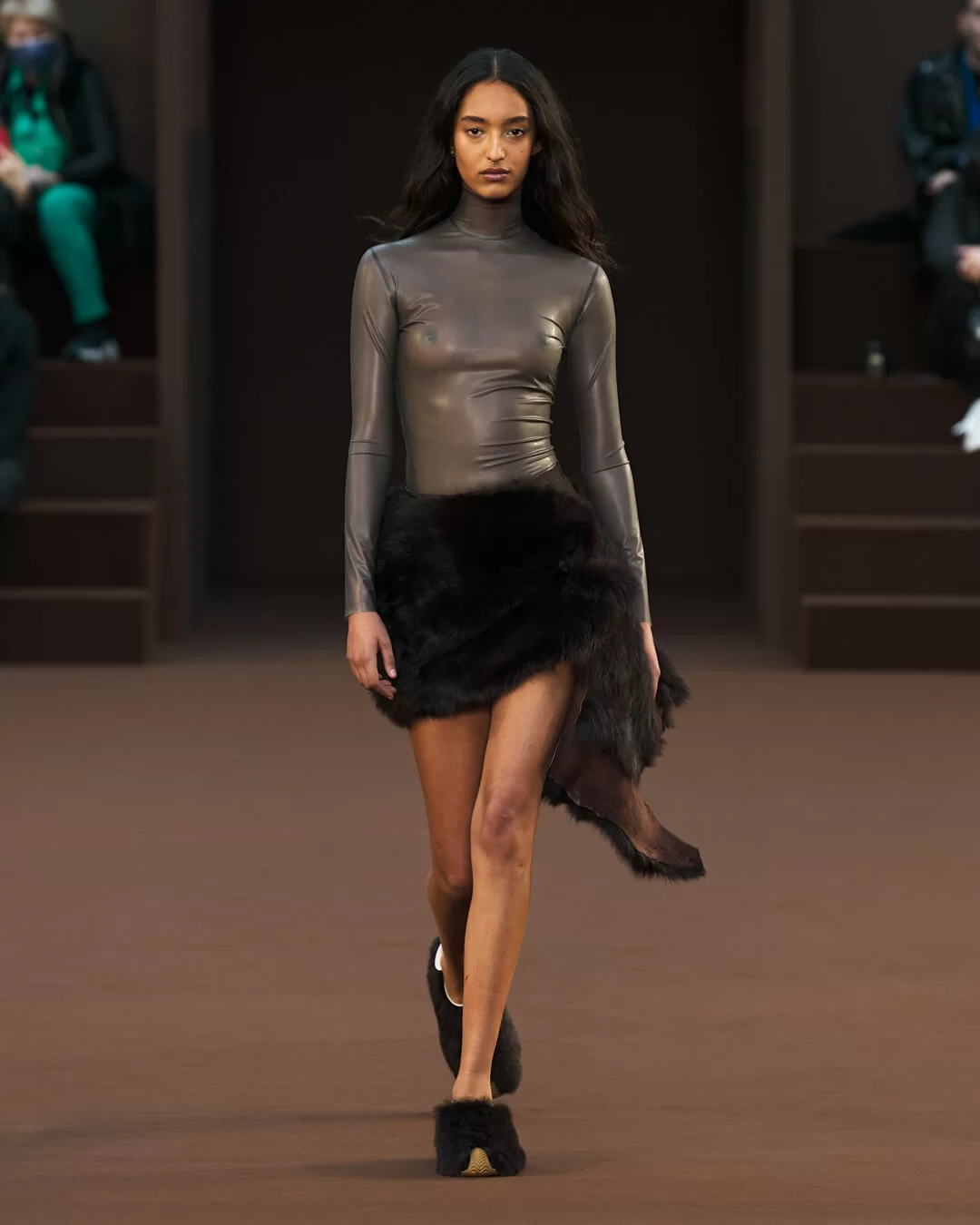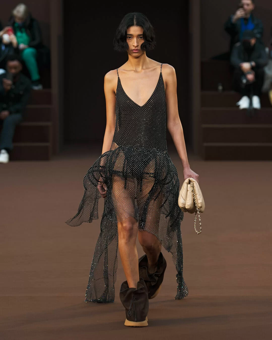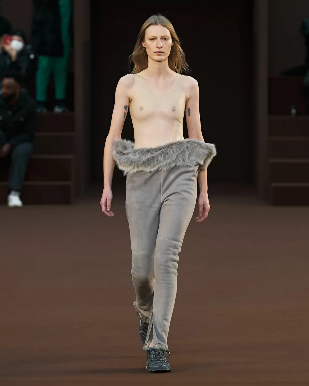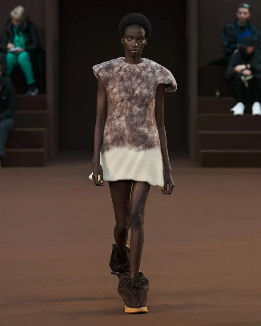 在設計中,可見一系列模壓皮裙、模壓毛氈緊身胸衣,從皮革、毛氈、絲綢到乳膠、樹脂等物料的運用,顯示出對人類從原始階段進化到工業革命時期的演變的敘述角度。比如說那條汽車模型下擺的迷你連身裙,比起實用性,更關乎工藝的概念。系列還融入 3D 打印技術,也有幾個造型呈現錯視效果,而代表了脆弱性的大量氣球細節出現在胸圍、鞋帶上,甚至輕薄的連身裙包裹著尖尖高跟鞋的設計細節,似被困住的感覺,卻又捕捉出動感,製造出衝突和觀感上的刺激。「將事物推向可能是非理性的東西」正如創意總監 JONATHAN ANDERSON 在後台採訪中說。氣球的爆破是隨時的,有著無時無刻的緊張感,他試圖透過超現實主義的觀點對此進行探索,而此時此刻世界正面對 COVID 和戰爭危機爆發,似乎這種表達亦非常切合當下緊張局勢的現實。