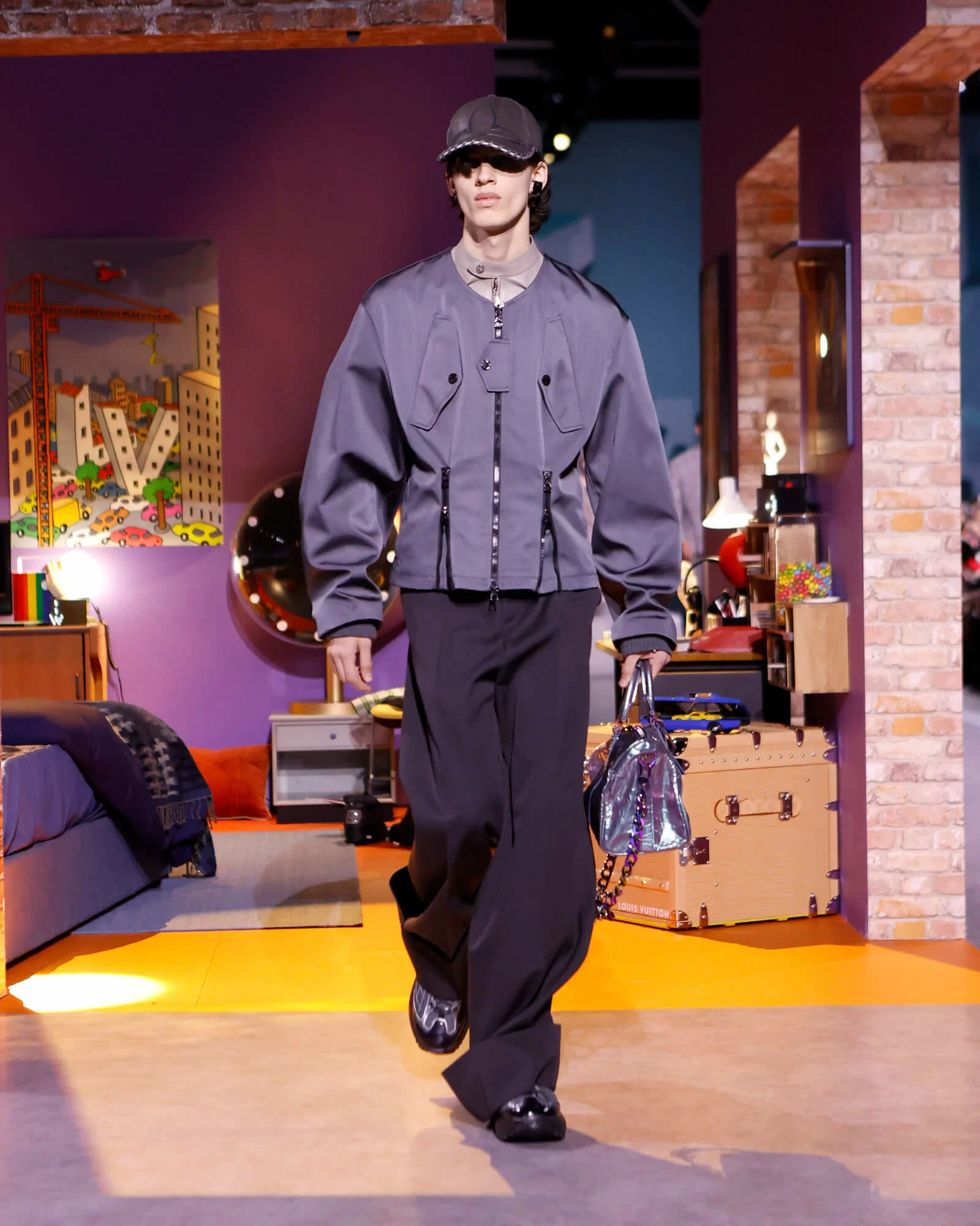 秋冬系列 LOUIS LIFEWEAR 破天荒找來紐約品牌 KIDSUPER 創辦人 COLM DILLANE 擔任客席設計師,當然 VIRGIL 對其他媒介的獨特觸覺也依然體現在時裝秀中。今次秀場設計計和序曲短片由法國電影製作人 MICHEL GONDRY 和 OLIVIER GONDRY 執導,MICHEL 的作品包括《無痛失戀》、《戀愛夢遊中》,天馬行空的風格和服裝不謀而合。除此之外,亦邀請到西班牙歌手、REGGAETON 天后 ROSALÍA 擔任音樂策劃並現場演出。一群創意之士透過創作、工藝和表演技巧等重要支柱觸動、連繫和凝聚世界各地的觀眾。