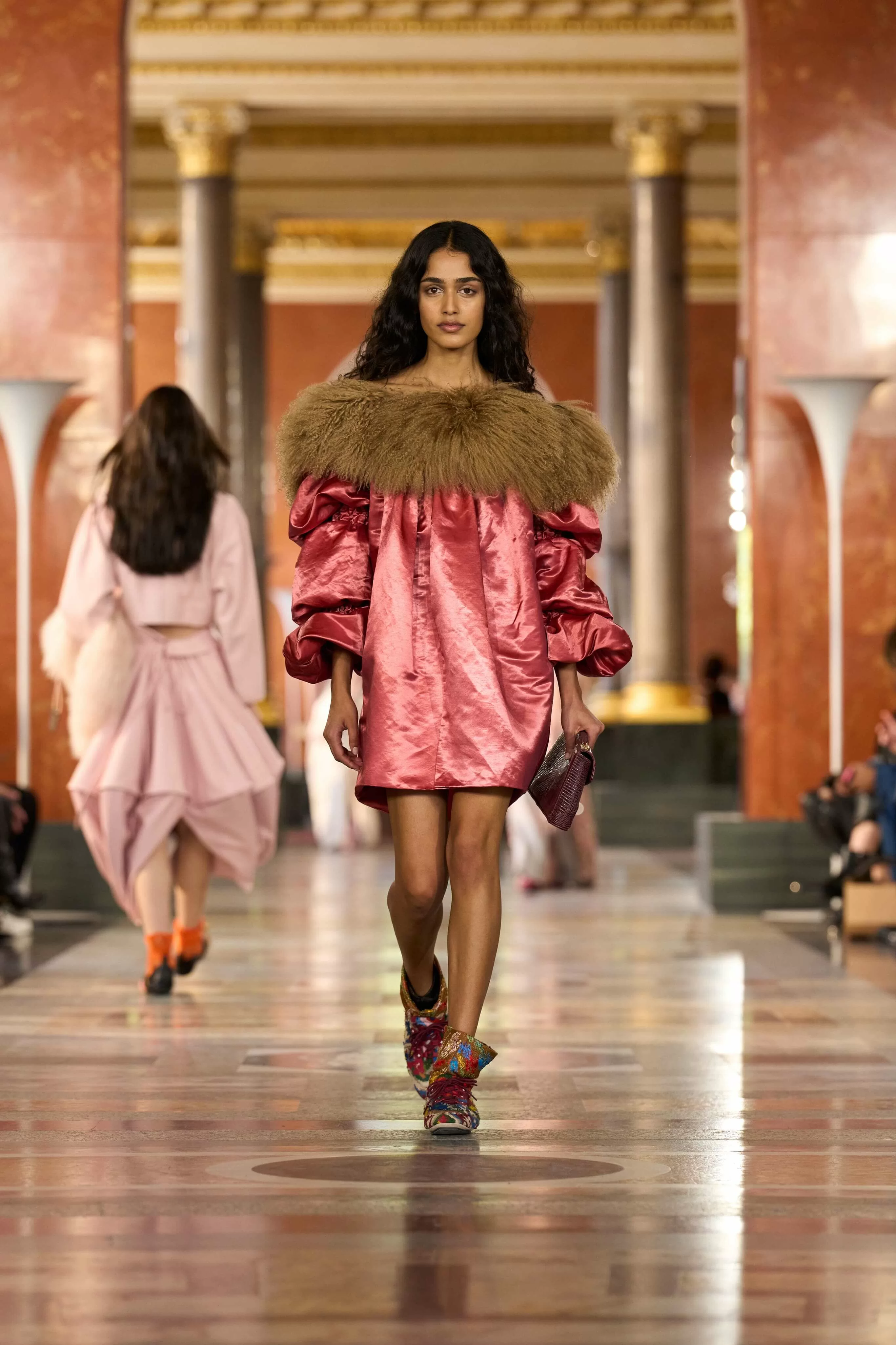 NICOLAS GHESQUIÈRE 在細節上也花了不少心思,例如將水晶燈元素以閃石裙裝呈現、圍在頭上的頭飾看似沐浴後的狀態、以及脖上的圍巾如窗簾繩等細節,讓人會心一笑,增添了幽默感。