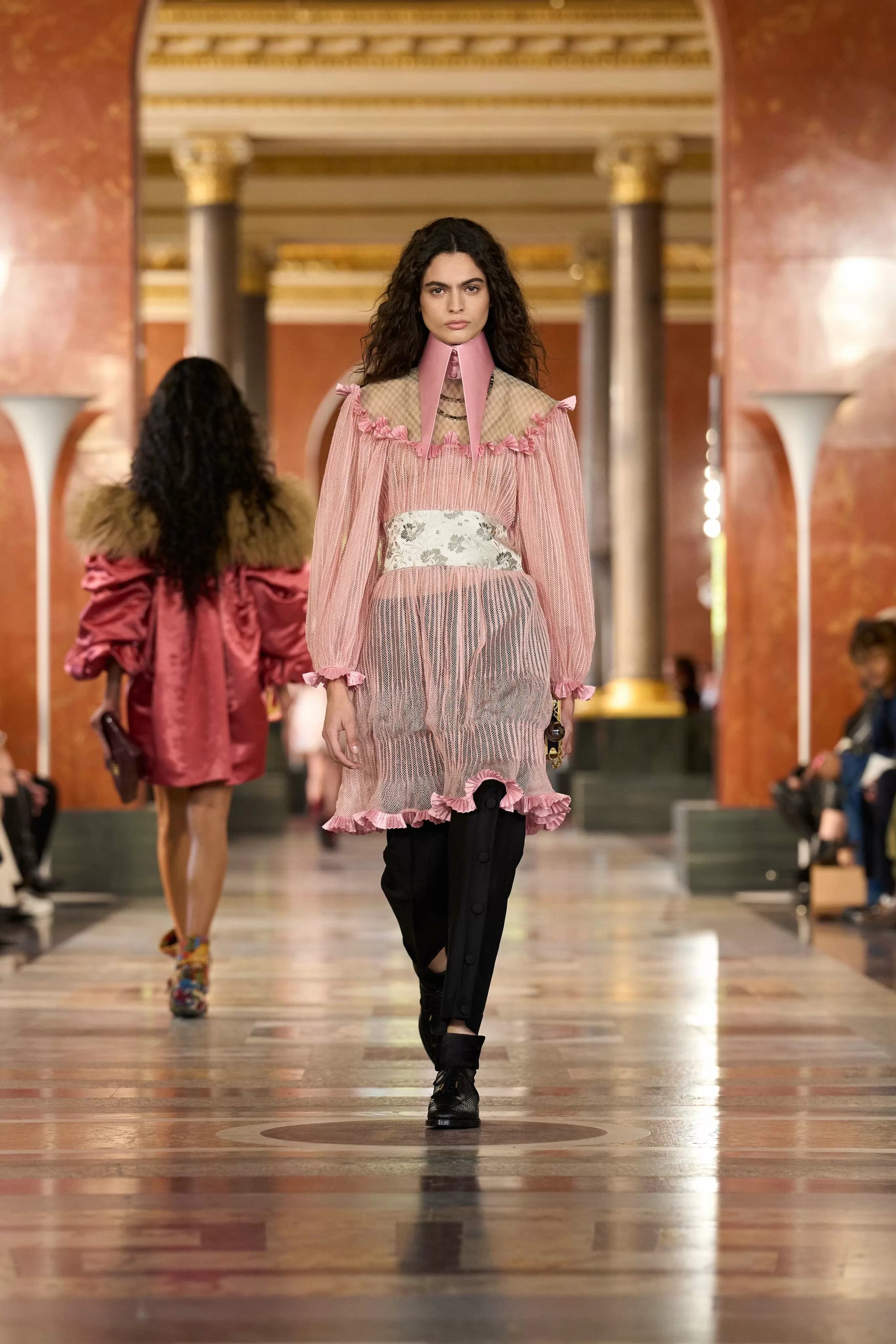 模特兒們以寬鬆且具立體感的設計作為開場造型,透視設計搭配模特兒慵懶的狀態,令人聯想到周末早晨剛起床的樣子,搭配金色平底鞋,傳遞即使在家也要活得精緻的理念。值得注意的是,整個系列的模特兒皆以平底鞋示人,搭配寬鬆舒適的剪裁,彷彿將天橋變成了家,輕鬆而自在。