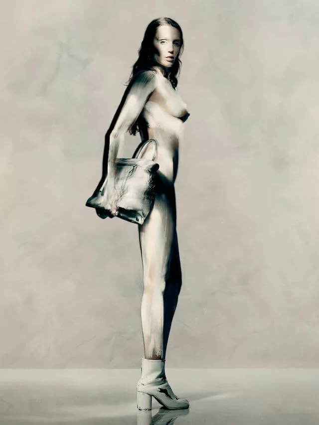 在這輯時裝大片中,MARGIELA 一反傳統高級品牌所採用光鮮亮麗的拍攝模式,取而代之的是讓 MILEY CYRUS 以帶點戲劇性和抑鬱情感的視覺表達品牌形象——她脫去衣服、於身體表面塗上白油漆,既巧妙地品牌 1989 年的 BIANCHETTO 技法致敬,亦呈現出宛如藝術家裸露的狀態,完美融合了明星身份與品牌的匿名美學。此舉在利用了名人效應的同時,也沒有背離品牌的基因與精髓,令人拍案叫絕。