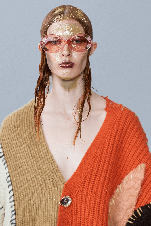 JULIEN D’YS 這次也為MARNI FW20,帶來了新鮮的視覺衝擊 ,這些造型的靈感是來自俄羅斯油畫,先是用硬髮啫喱膠把頭髮弄得貼服,後以毫不吝嗇的姿態,在所有模特的頭和面上灑上金銀閃粉和塗抹鮮艷油漆,這種色彩的層次交疊,呈上一份混亂感美學。