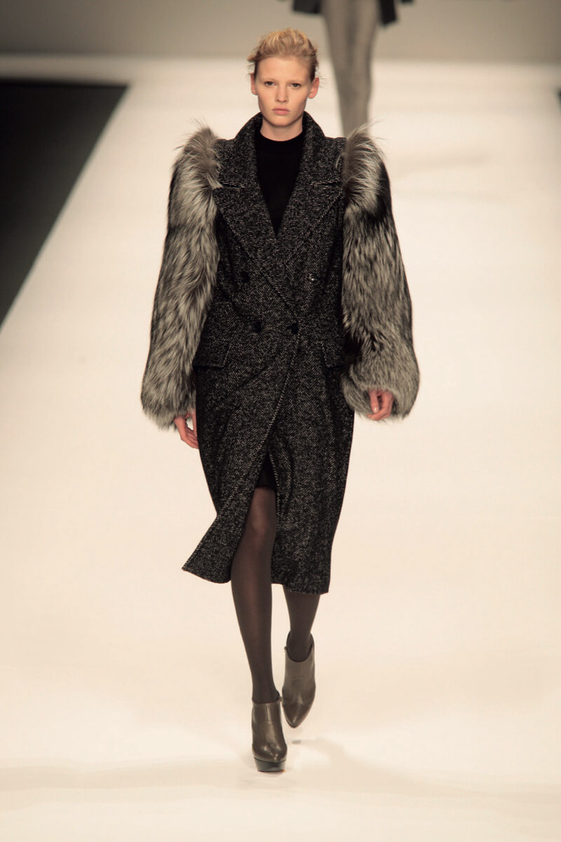 今季的 Max Mara 講求結構性,孖襟大衣、三件頭西裝或半截裙的線條都有力而不 失女性化味道,即使是重 volume 的設計,設計師也運用了筆直的線條來淡化顯胖的問題。不同深淺度的灰色,伴隨着炭黑、銀、淡紫及米白,配合品牌少有的皮草及釘珠細節,構成一組貴氣而實在的設計。
