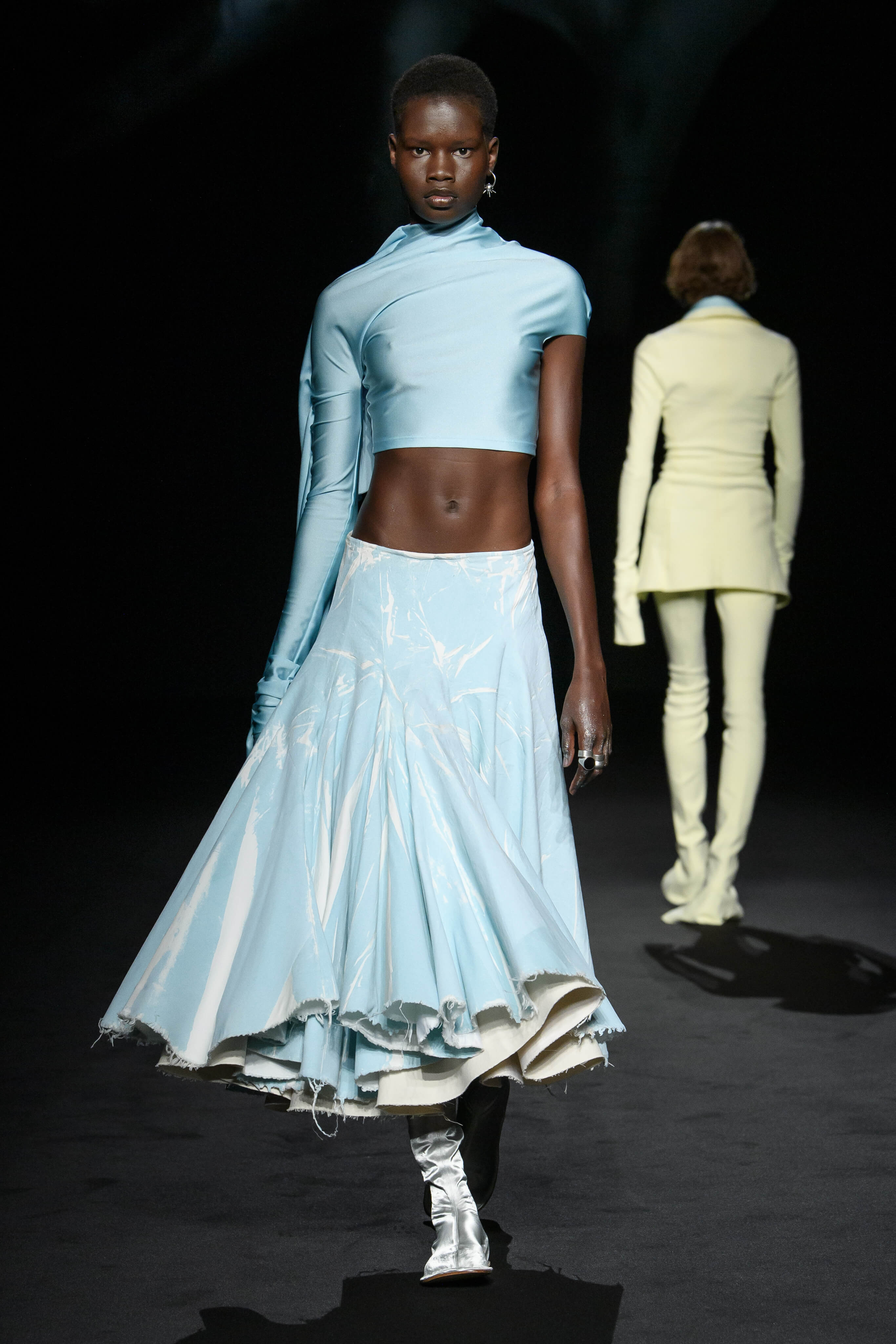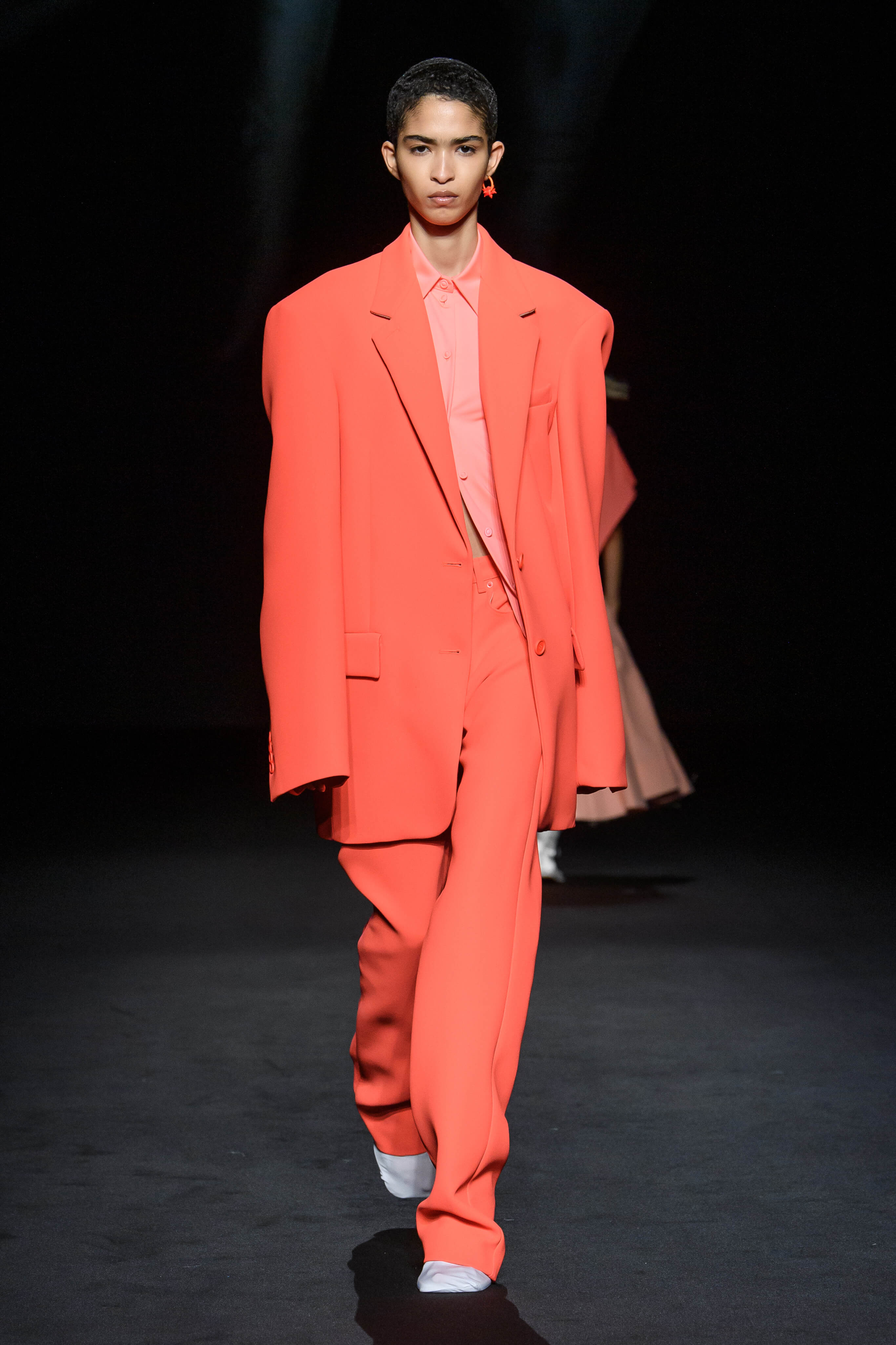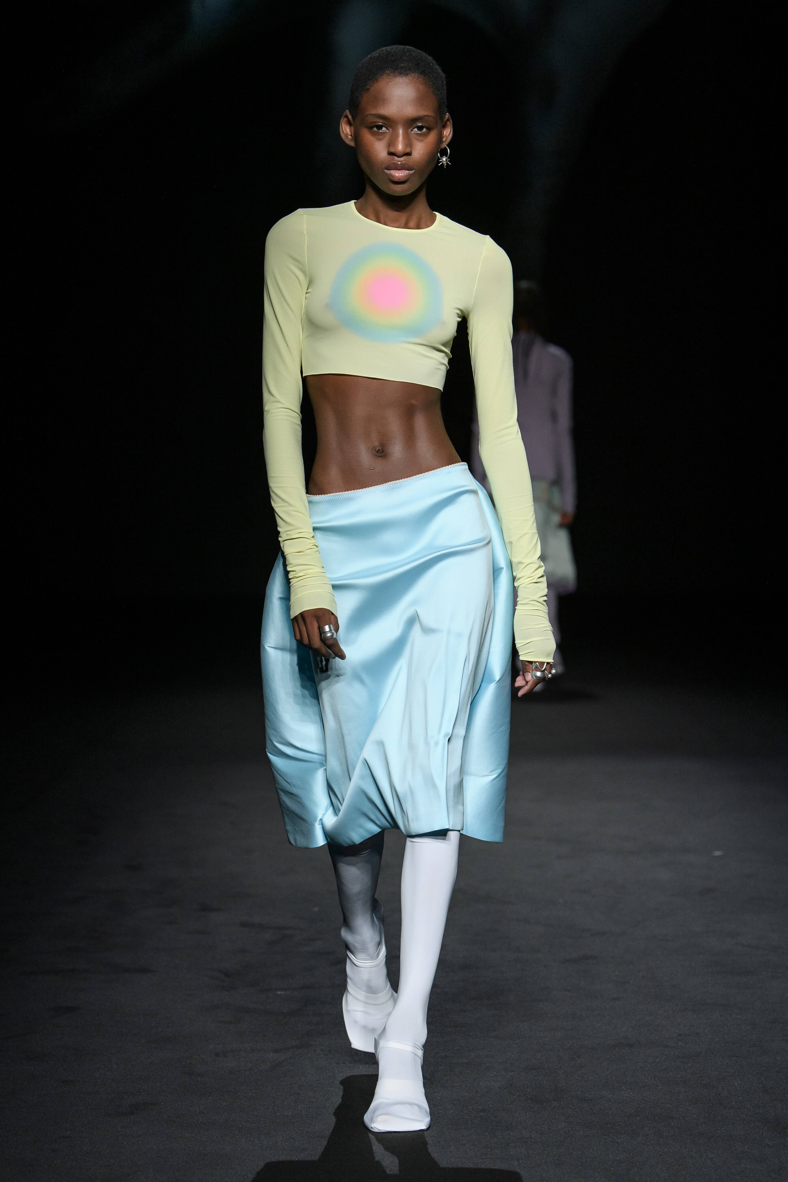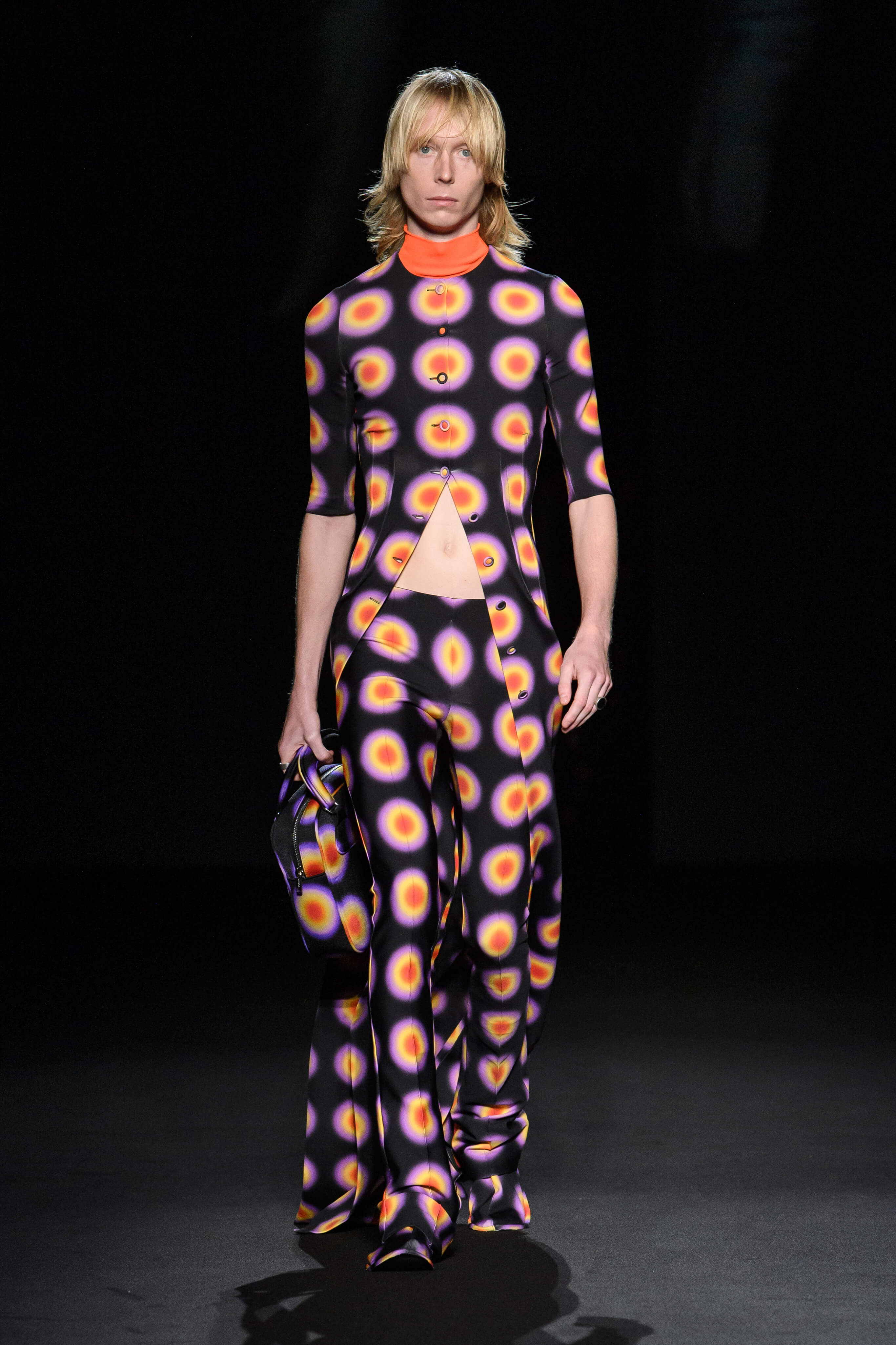 休閒與奢華、顏色與圖形碰撞實驗,幻化成一系列的服裝。科技風格的高腰半截裙與超短上衣配搭穿著。街頭服飾搖身一變,經由晚裝風格的著裝演繹。鮮亮、淡雅和深邃色調交錯呈現,精緻印花飾有迷幻圖案和柔軟填充效果紋理,展現感官刺激。1950 年代的 A 字、窄肩、低腰與大喇叭廓形、60 年代的未來主義太空風格、90 年代由 TECHNO 電子科技舞曲中的 CYBERPUNK 元素構成反主流文化造型。