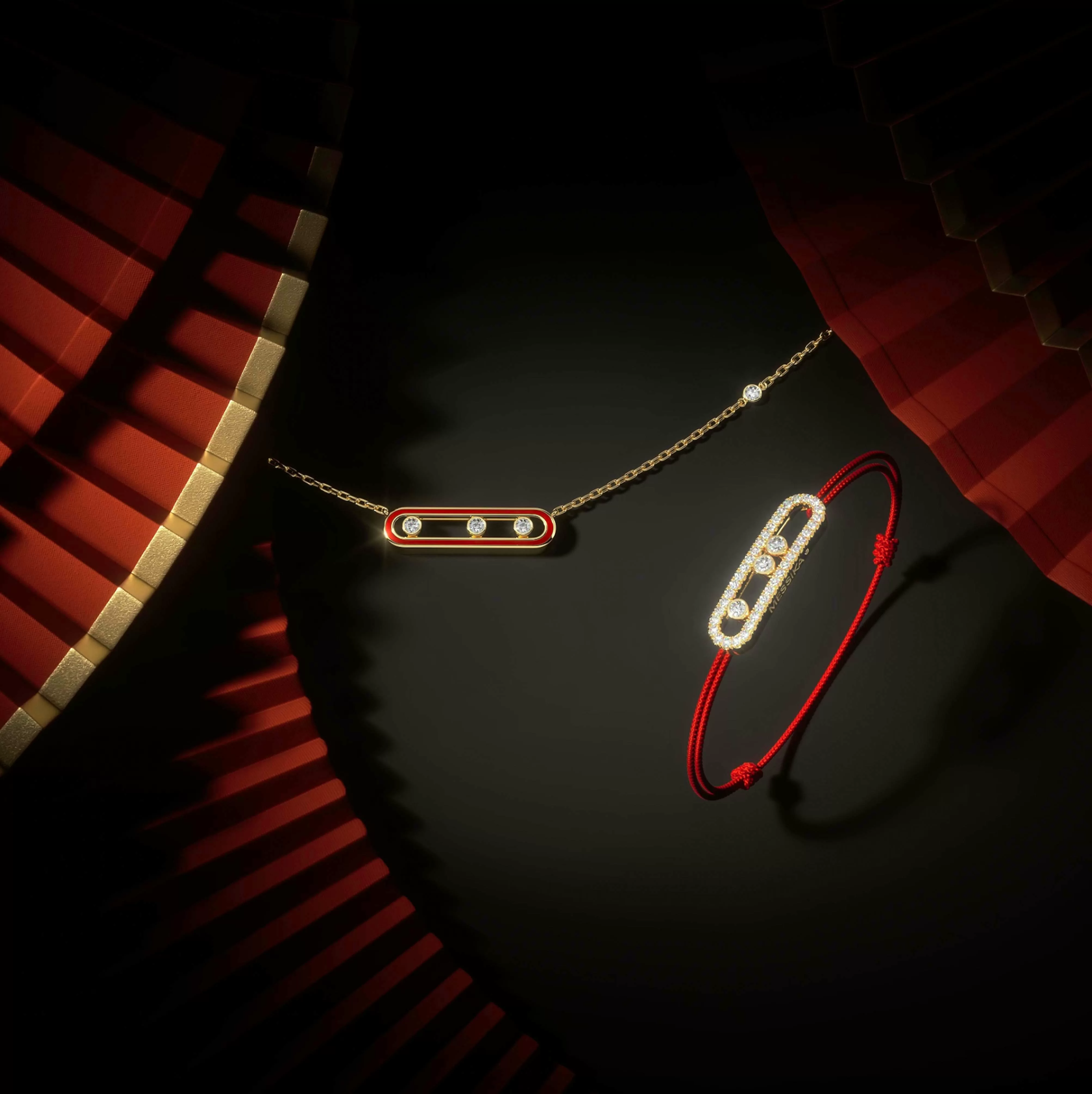 BABY MOVE 項鍊中央別具心裁地以紅色琺瑯飾面作點綴及突顯出標誌性三顆移動鑽石;開運紅繩手鏈則將幸運緊緊纏繞,既可單獨佩戴,也能混搭其他首飾,配合當日心情。