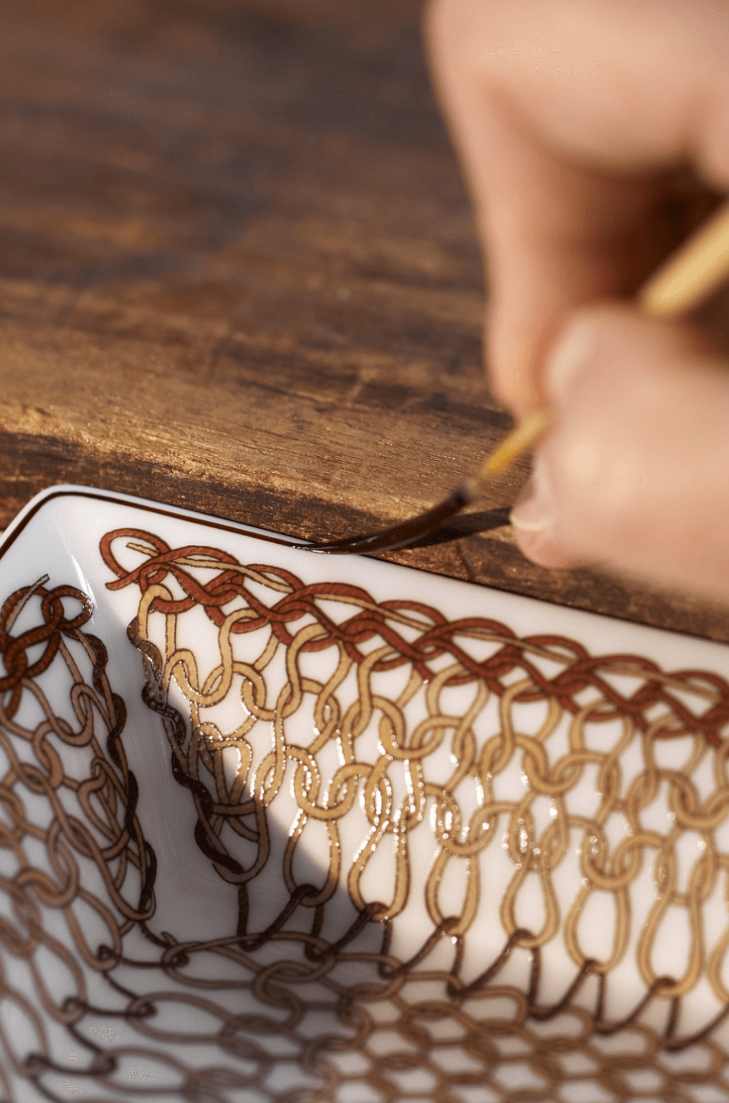 LORO PIANA 亦即將在 9 月推出「PUNTI A MAGLIA」餐具系列,每件均在法國里摩日(LIMOGES)以最上乘的瓷土打造,以工匠手工一筆一劃繪上米色、褐色、海軍藍、酒紅色和赤石色的線條圖案,重現品牌經典種子針、平針和花式針花紋。顏料中的氧化物在燒製過程中會產生不同反應,必須經過細緻調控才能達到理想色調。工匠首先將圖案網印在特殊媒介,再利用有機薄膜轉印到器物。手工對齊貼花時,要確保線條清晰,位置完美。最後的成品,卻是低調精緻,靜靜融入每個人的家居,一份能用上數百年的家傳之寶。