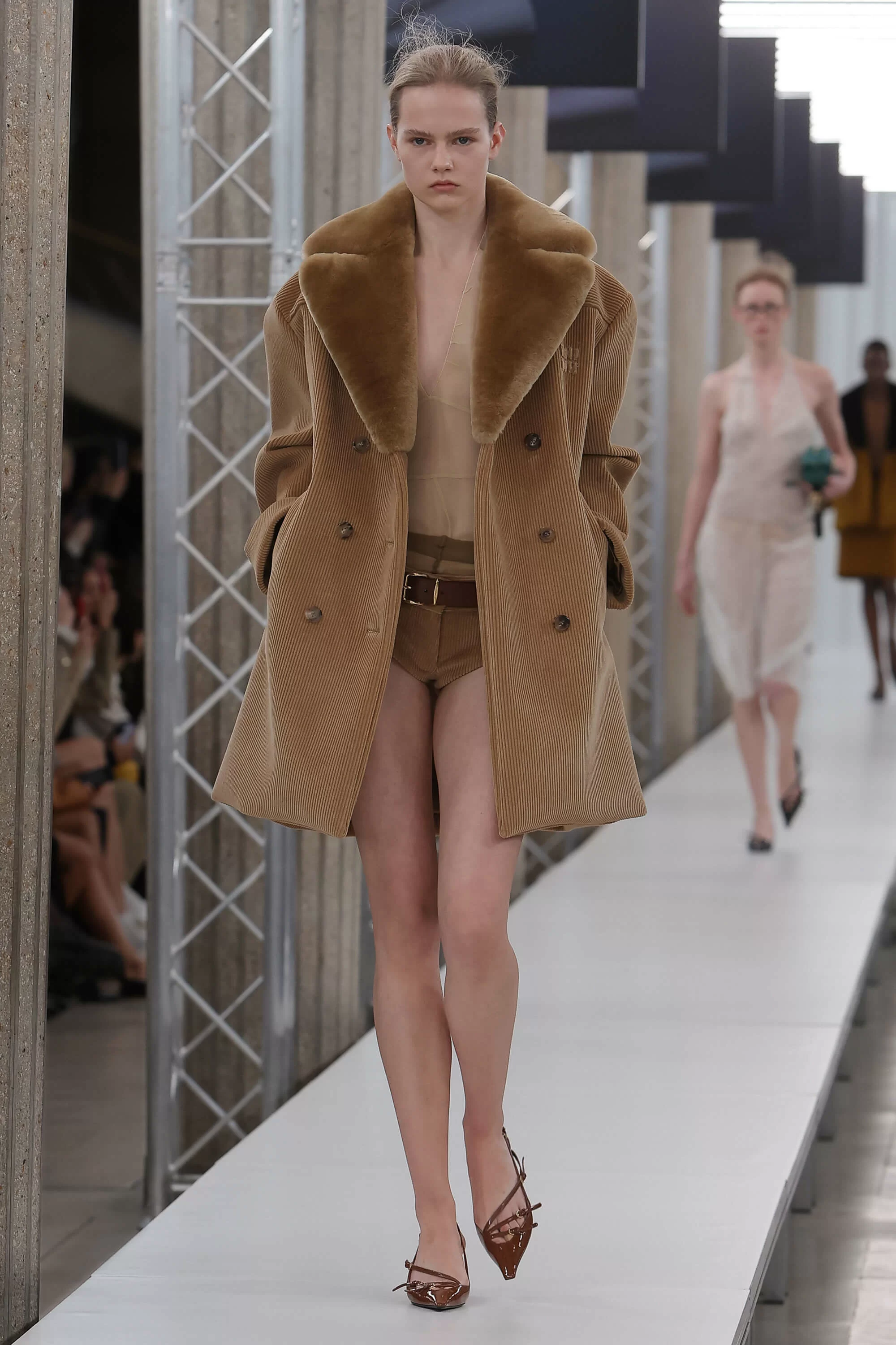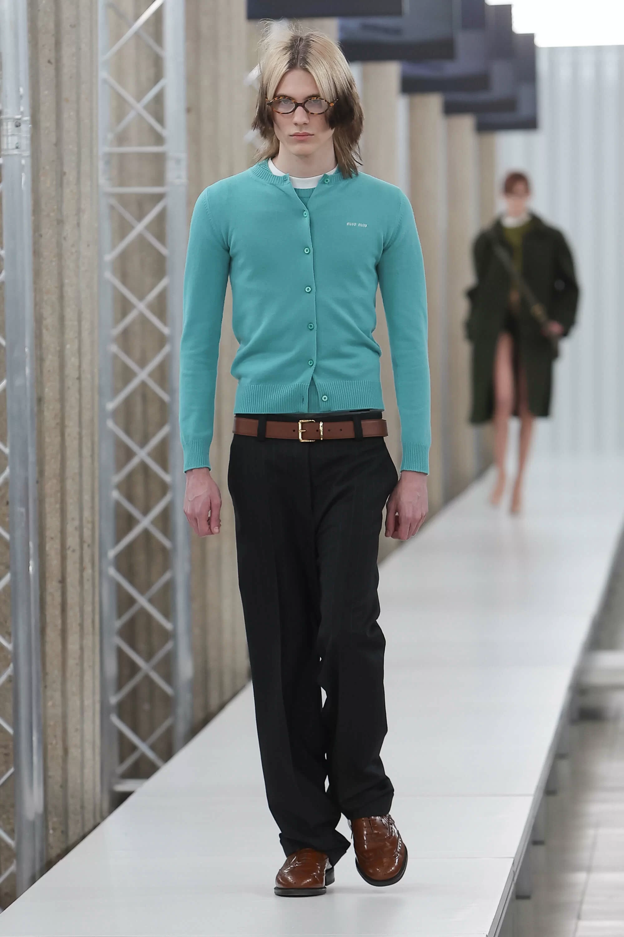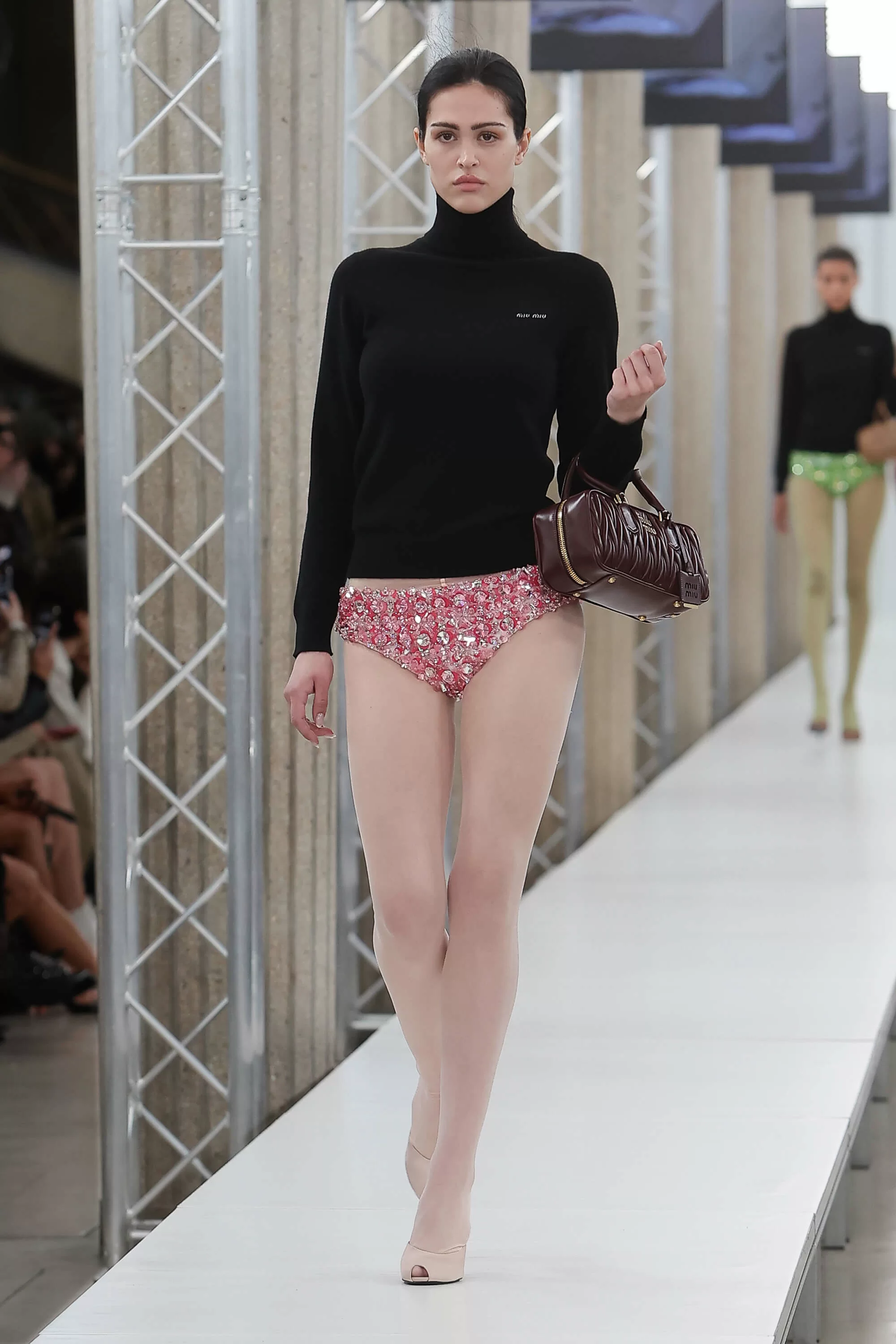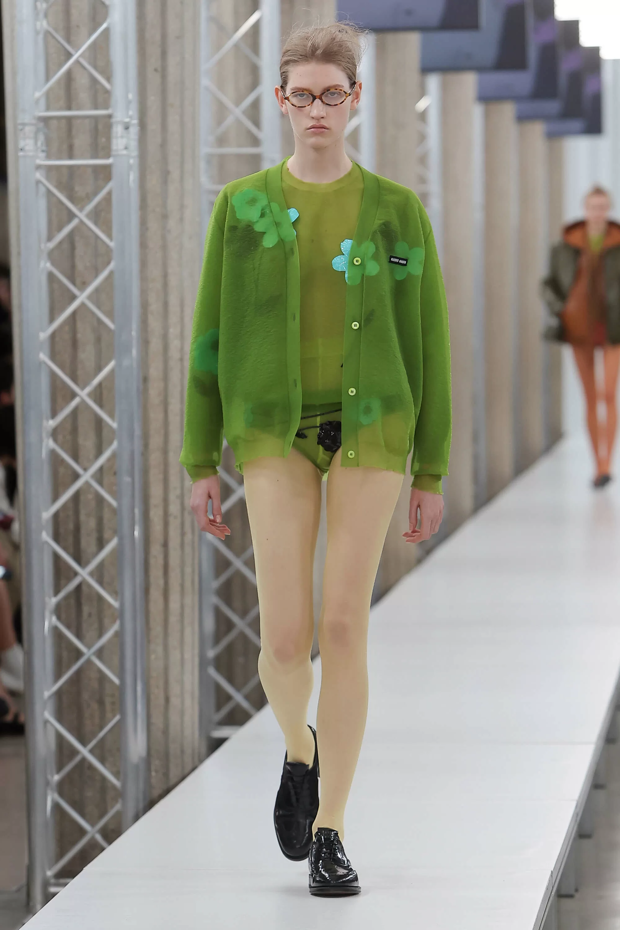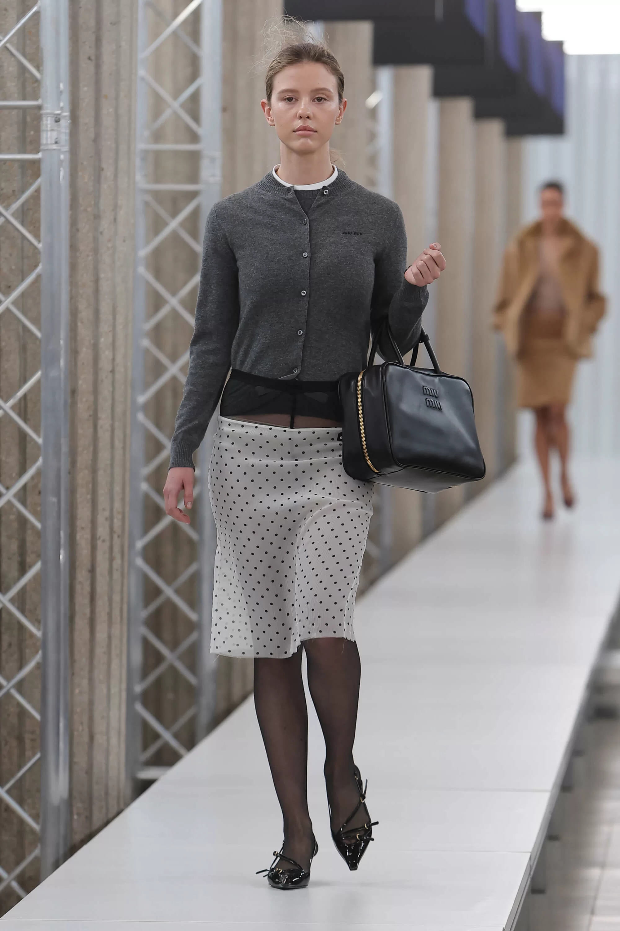 今季 MIU MIU 和以往一樣,總是能把復古千禧感加入全新的摩登時尚風格,剪裁展現了力量和脆弱之間的張力,扭轉了傳統比例、強調多重層次、不同布料的互相碰撞,更改變了我們以往對服裝穿搭的單一理解,性感慵懶卻帶著俏皮感。熟悉的兩件頭、短裙、帽衫等等都有著略帶失衡的脆弱感。肉色薄衫、絲質 SHIRT 衫透露了平常隱藏的內衣,平日我們藏起來的襪褲褲頭突出。層次複雜得叫人要專心一致、仔細解讀,重拾對服裝配搭的好奇心。