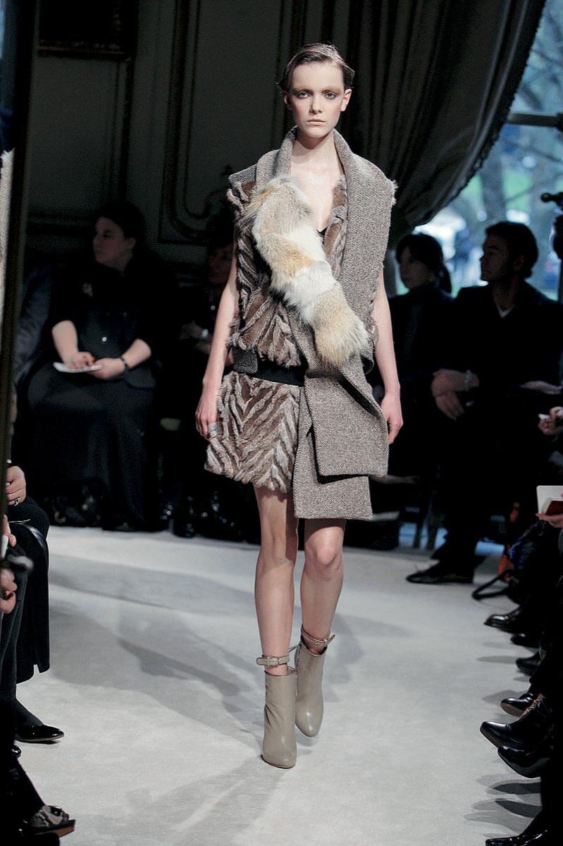 背景音樂的重要性真正不可忽視。當 Miu Miu 會場響起上世紀七十年代電影如《Histoire d’O》、《Madame Claude》的對白,模特兒穿著大領口孖襟大衣出場,鬆掉的鈕釦露出部分近似膚色的內衣,也不難猜想設計師 Miuccia Prada 要表現的是「不同類型的 femmes fatales 危險女人」造型。上半部分鬆身的大衣,到了腰部以下便驟然收窄,開胸上衣露出內衣配長度過膝窄裙子,部分還釘上大量水晶,還有繫於頸部腰部的皮草圍巾。整個系列是性感、世故與 70 年代的結合。