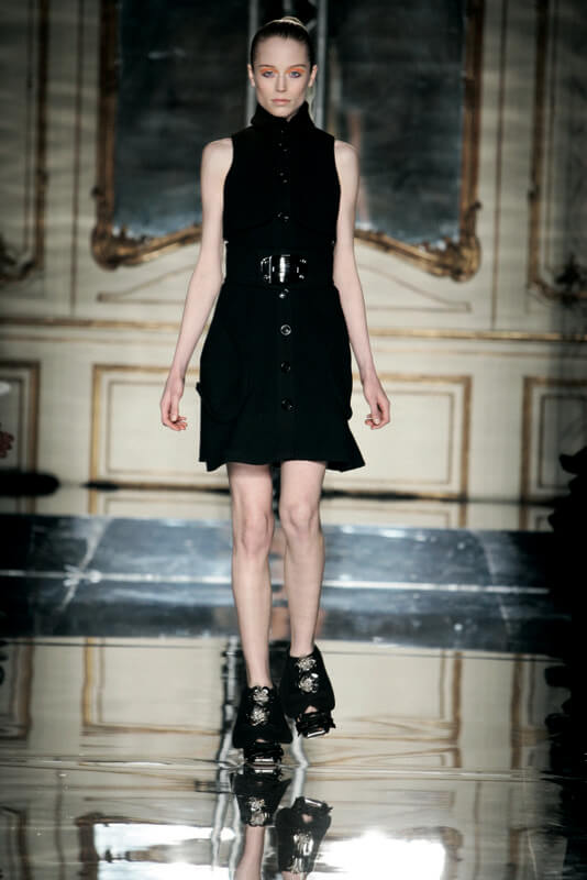 秋冬季卡通化的線條,令人想起了大力水手的女主角奧莉芙。含蓄雖然是 Miuccia Prada 來季的設計思維 (看主線 Prada 五十年代的保守風),但喜歡 Miu Miu 的,又豈會只甘於平實的設計,於是乎,Miuccia Prada 巧妙地將另一個大潮流 futuristic 的元素融入系列中。在腰部位置或造成斗篷、呈圍裙狀的連身裙,又或高身企領配有蝴牒結、泡泡肩位設計連身裙,全黑的設計,又有點 French maid 的影子,特別是其中一件在胸位對下 cut-out 的設計,演繹了 French maid 佻皮的性感,亦巧妙地與主線骨子裏的性感互相呼應。