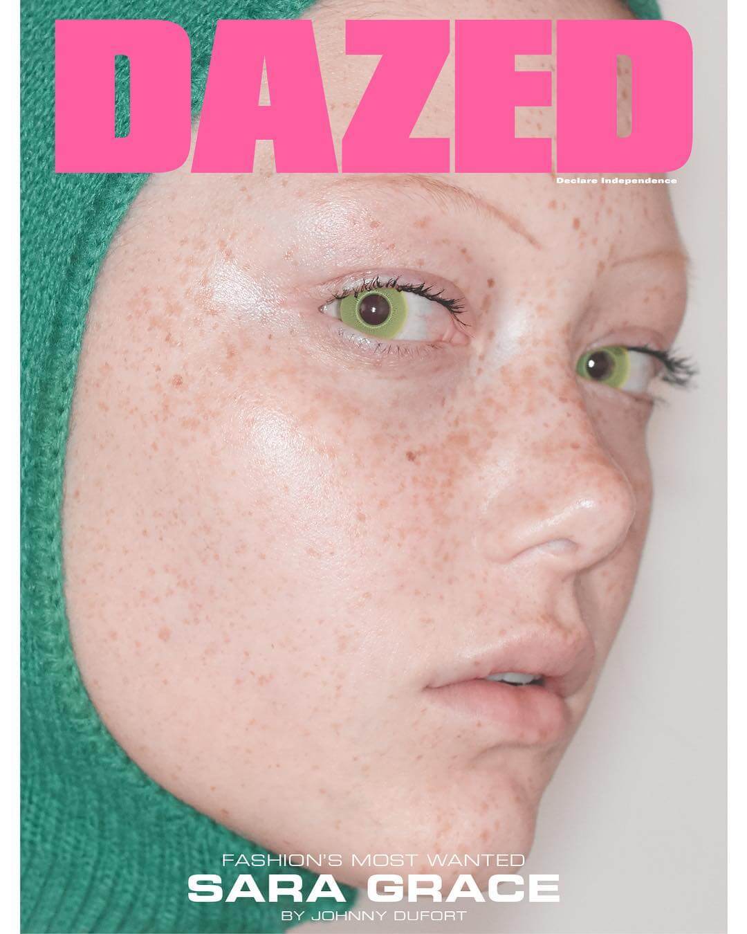 Sara Grace以滿臉雀斑、綠眼晴、淡眉毛的超大頭登上Dazed封面。
