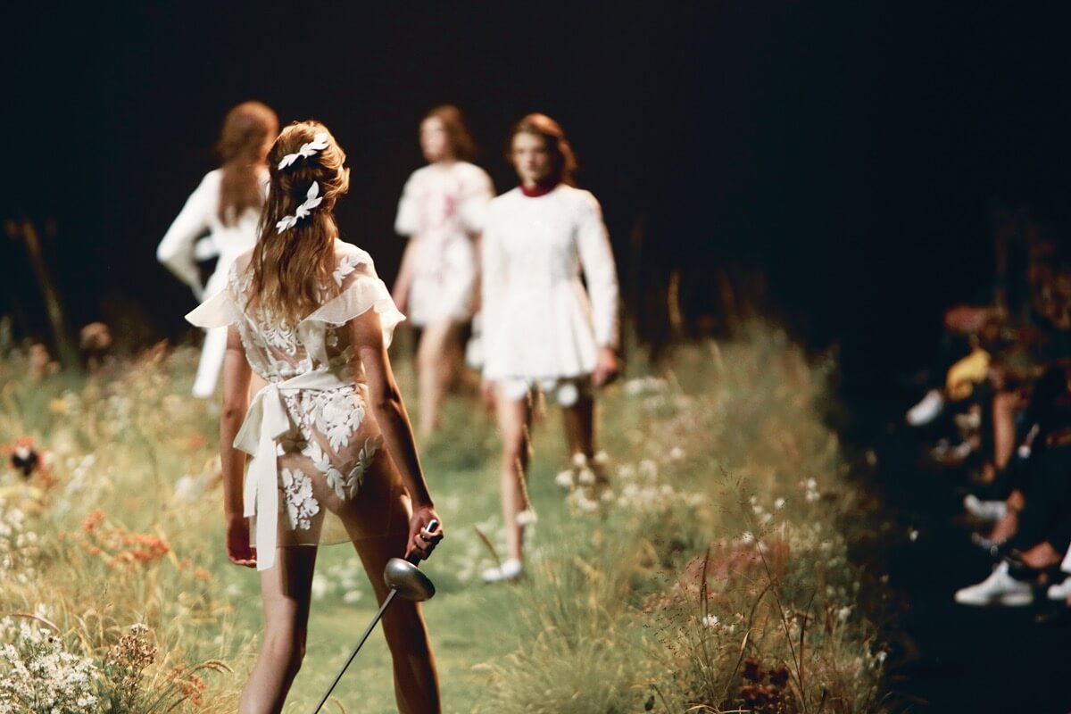 在 Giambattista Valli 的高瞻遠矚下,Moncler Gamme Rouge 系列將高級時裝與科技物料完美地結合,在一片小野田之上,走過如詩如畫的服裝,看似實用性甚重的透明雨衣,卻綴上最細緻的蕾絲,沉悶的雨衣變成可愛的傘裙裝束;充滿未來感的銀色反光物料,以劍擊手的硬朗姿態出場,工匠以精巧的手藝在 PVC 上刺繡,Giambattista 坦言藉着 Moncler 的技術性物料及支持,他以最頂級的藝術手法作回應。