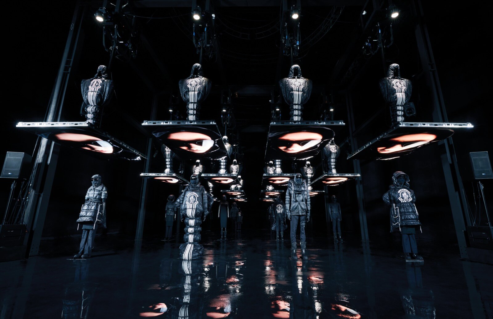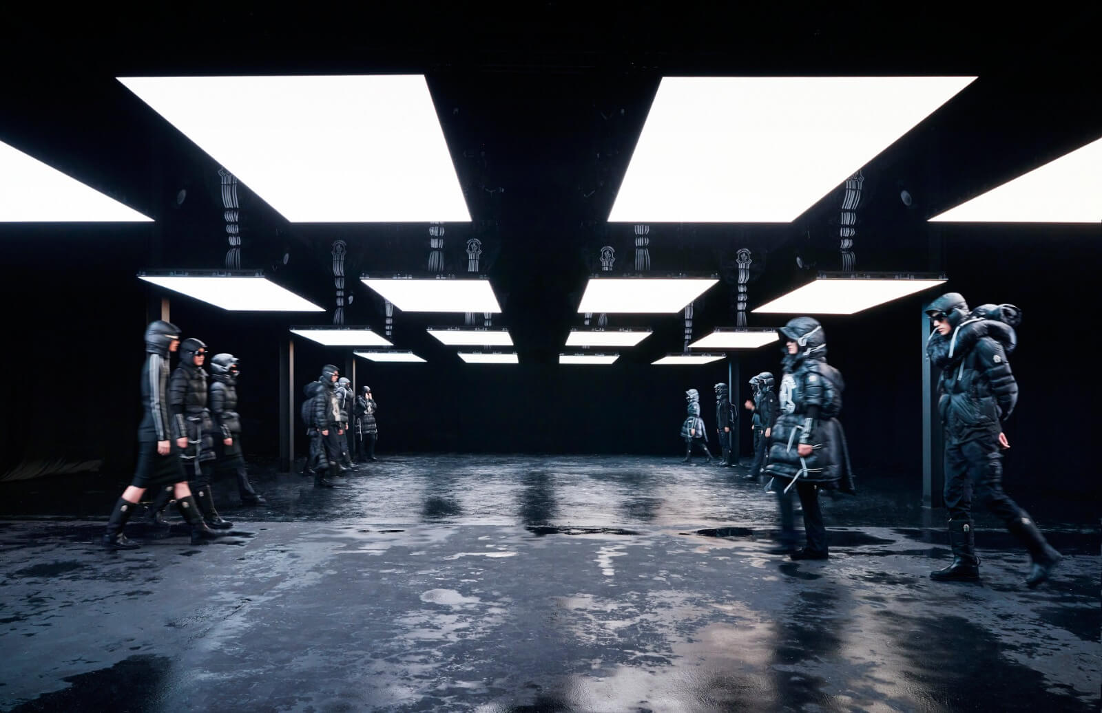 系列服裝以純黑色呈現,有連帽羽絨、羽絨馬甲、用再生尼龍及聚酯纖維製作的風衣,以及機能風上衣、褲裝、T-SHIRT 和衛衣等 ITEMS;配飾方面,則有再生聚酯纖維製作的一系列帽子、用再生尼龍製作的包袋,以及靴子。精美的紡織物細節,與誇張的服飾輪廓相得益彰,極富戲劇性。