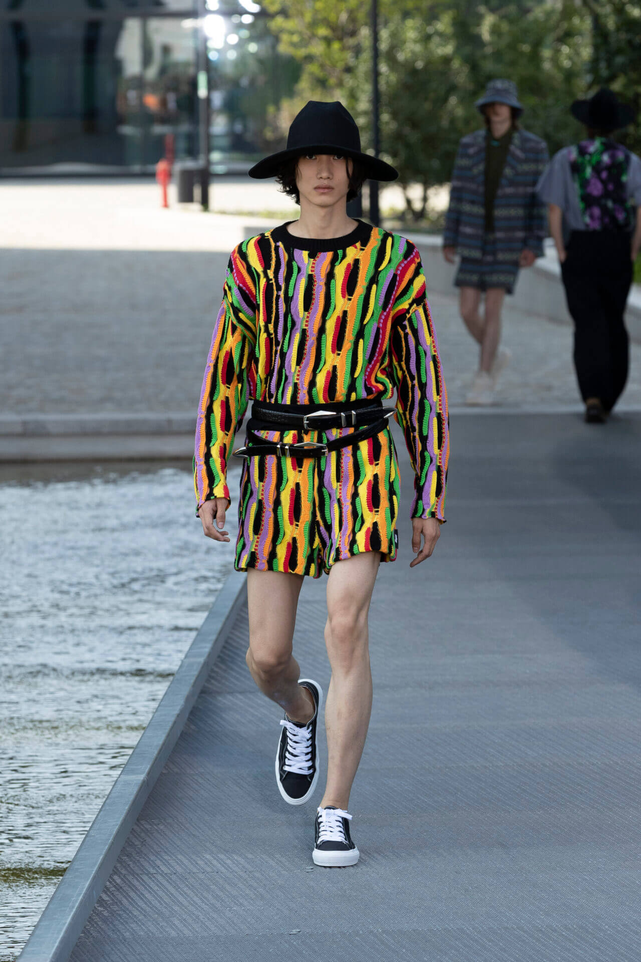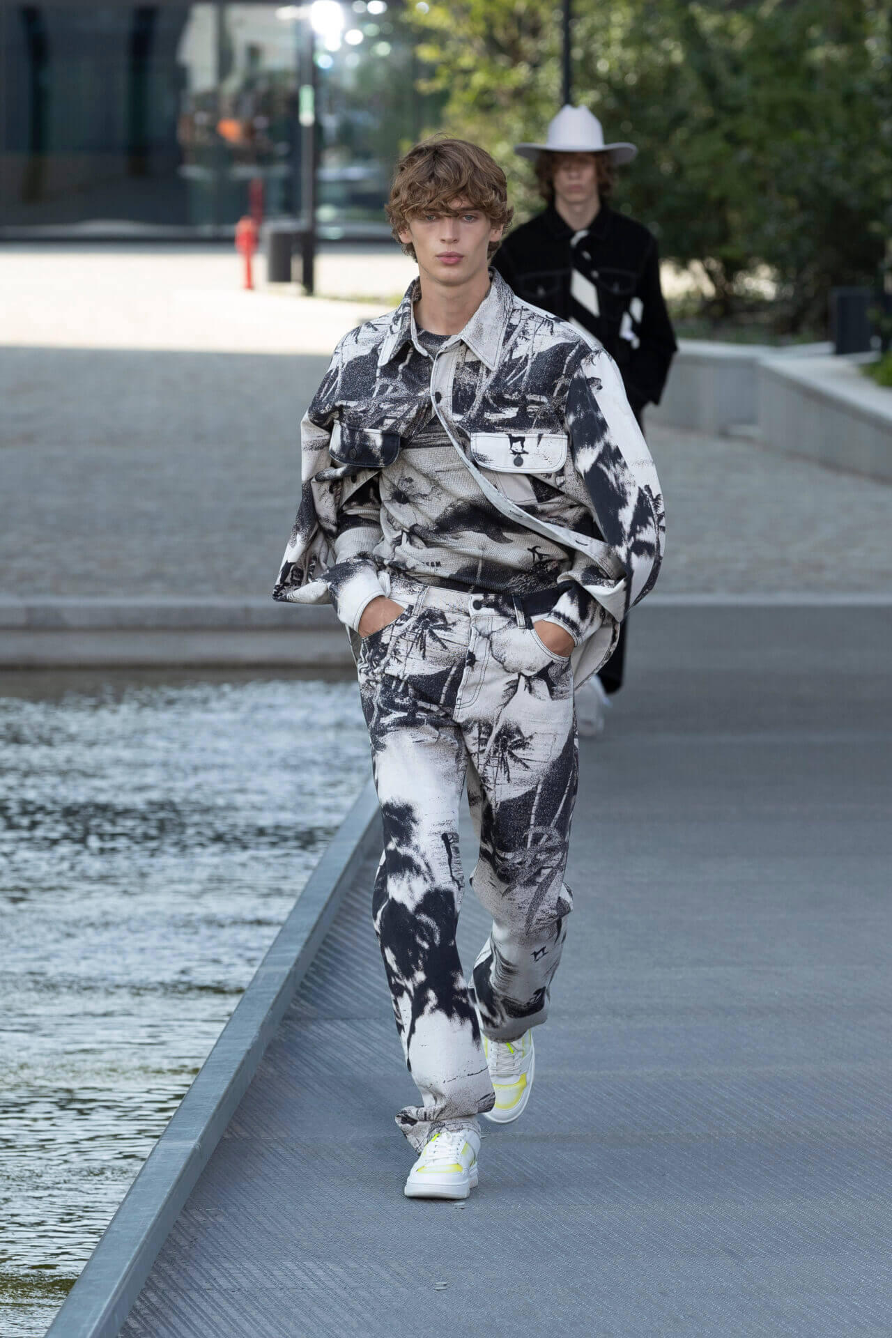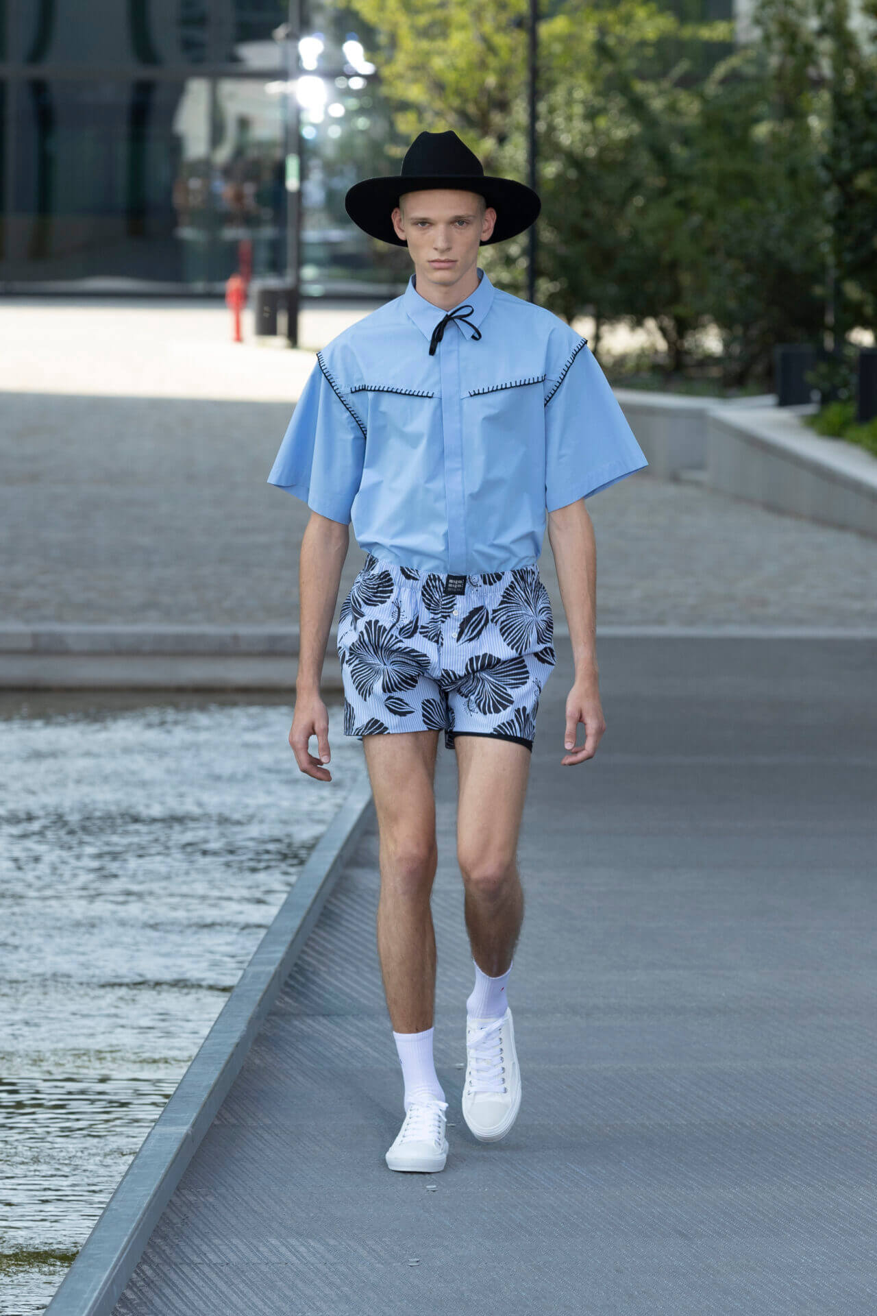 設計師秉承年輕的衝浪美學,多種熱帶植物印花,如木槿和海洋生物印在 OVERSIZE 棉質和丹寧襯衫配搭膝上短褲,還有香蕉印花的恤衫短褲套裝。品牌 ICONIC 的色彩配搭可在亮色條紋、七彩針織 SWEATER 中看到,而不同顏色牛仔帽登場率亦甚高。