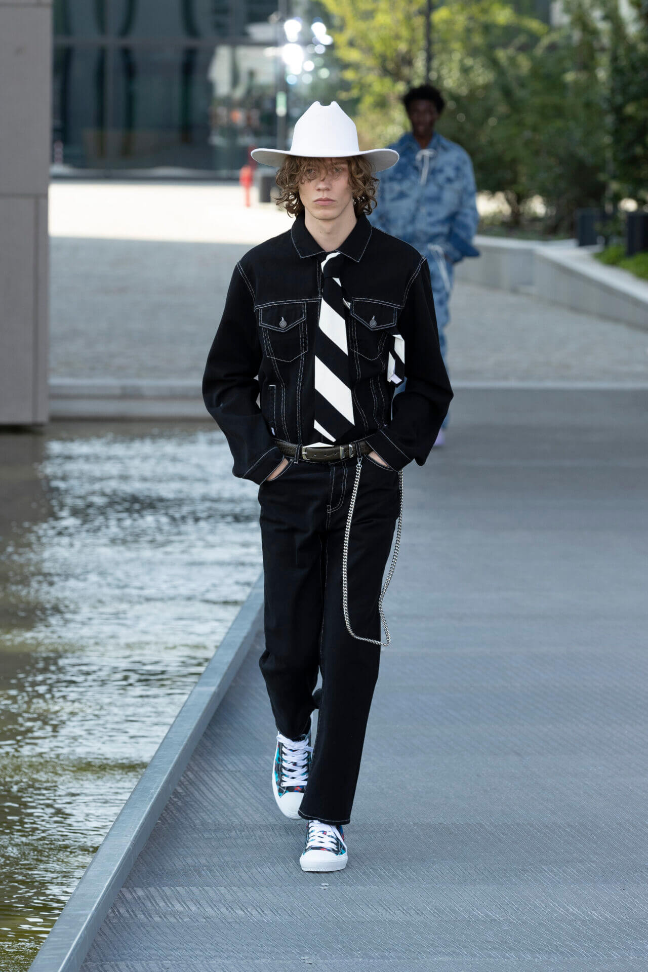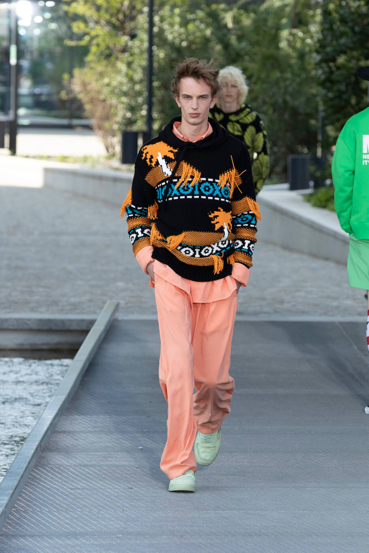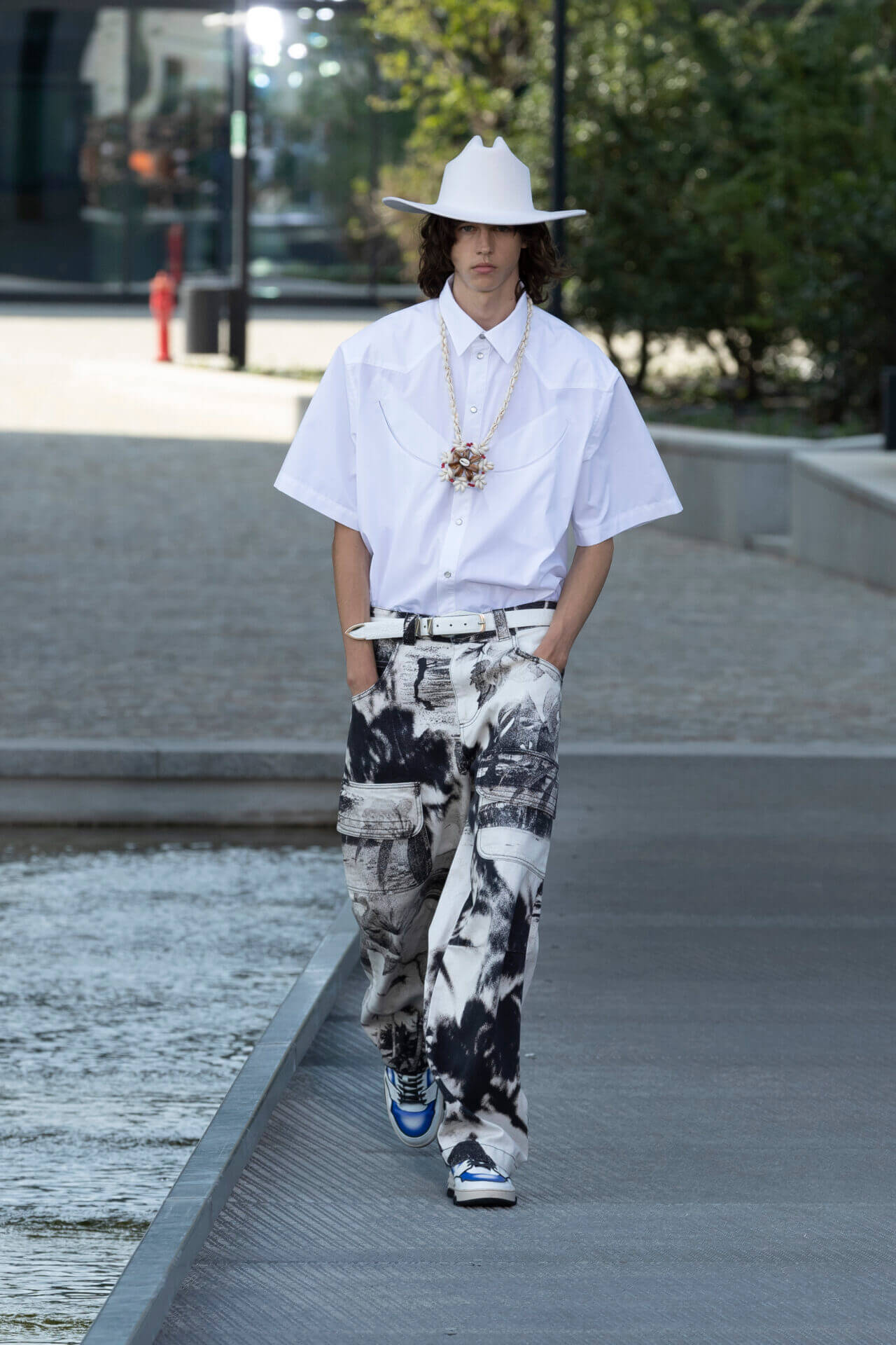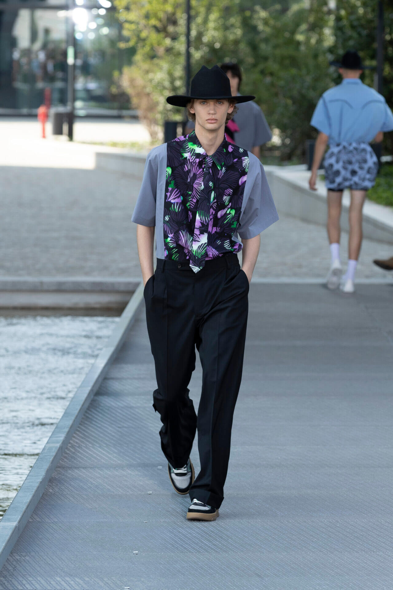 設計師秉承年輕的衝浪美學,多種熱帶植物印花,如木槿和海洋生物印在 OVERSIZE 棉質和丹寧襯衫配搭膝上短褲,還有香蕉印花的恤衫短褲套裝。品牌 ICONIC 的色彩配搭可在亮色條紋、七彩針織 SWEATER 中看到,而不同顏色牛仔帽登場率亦甚高。