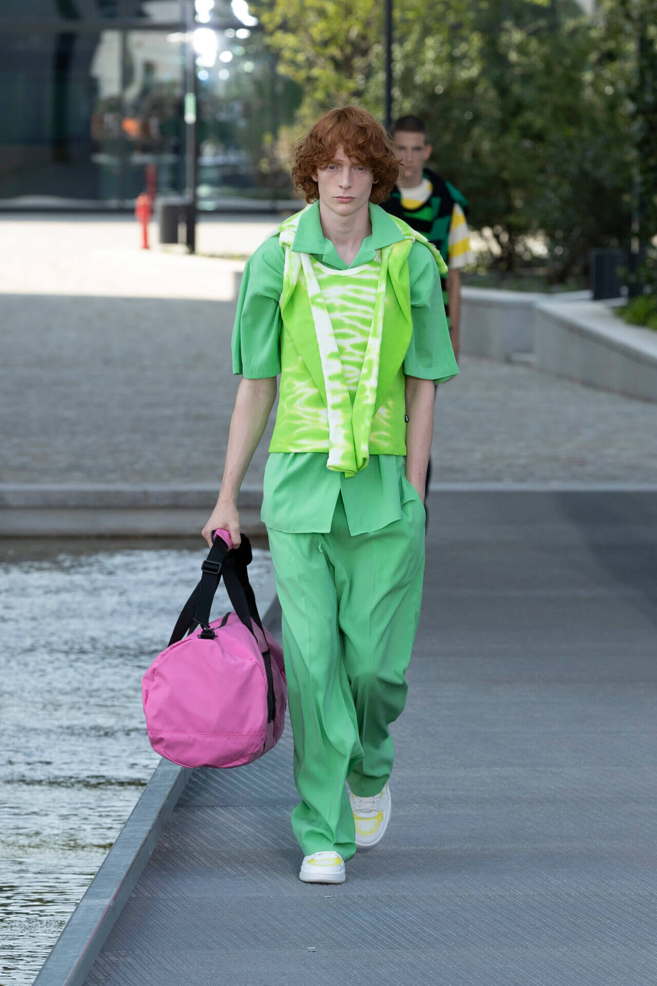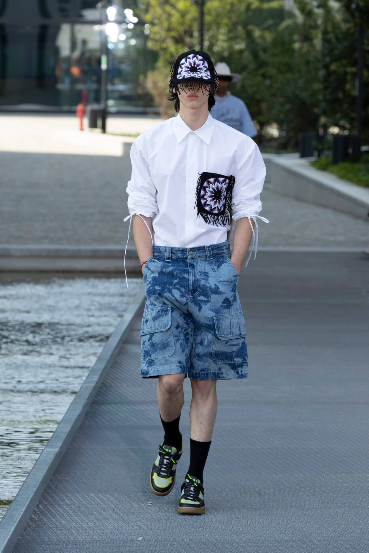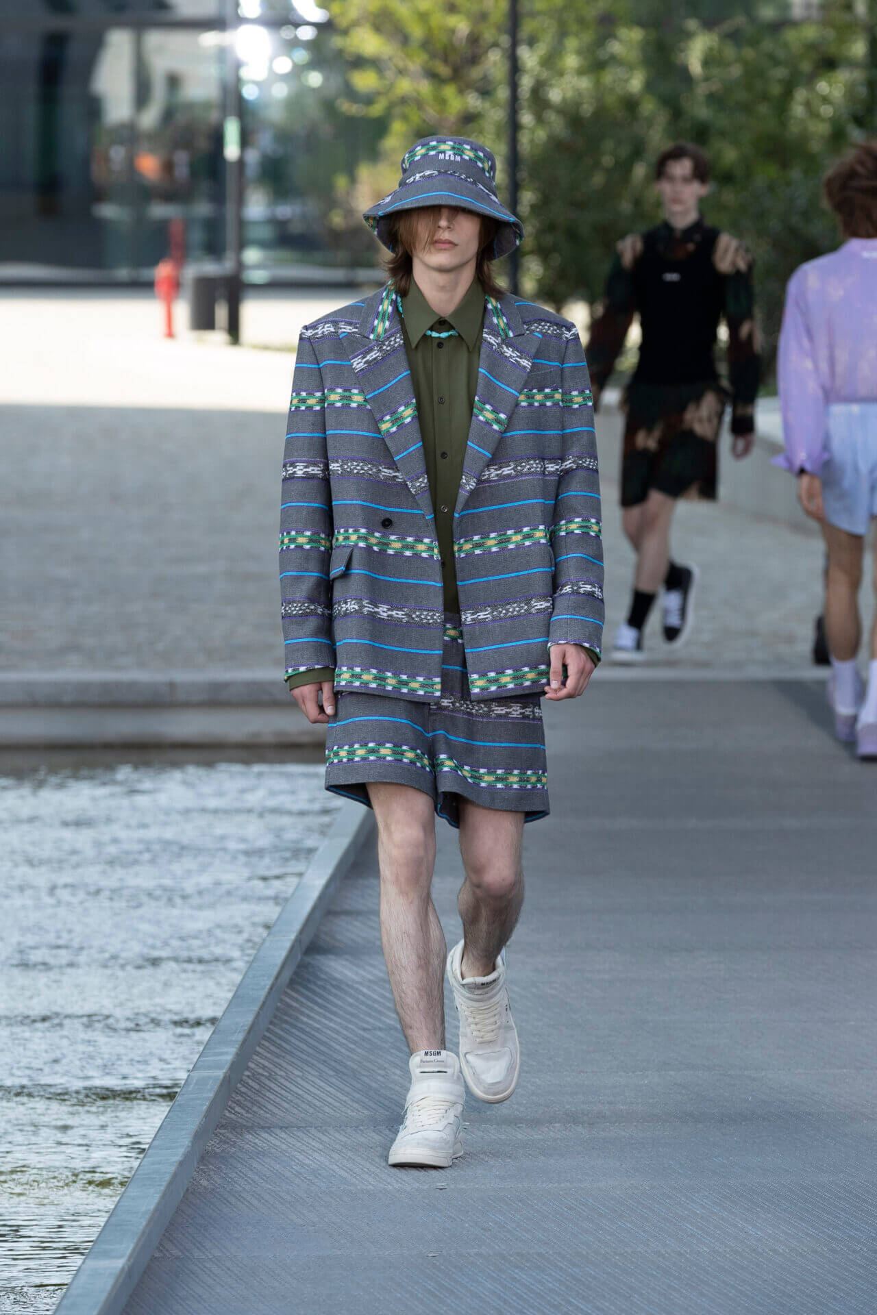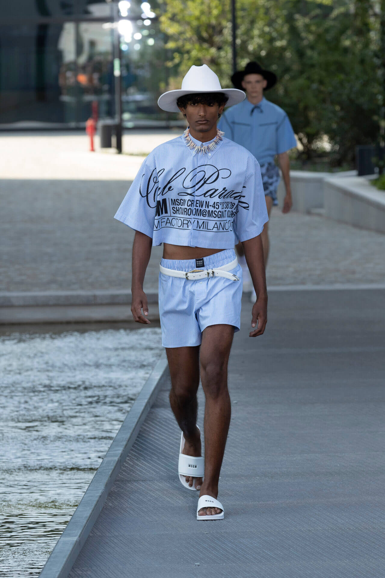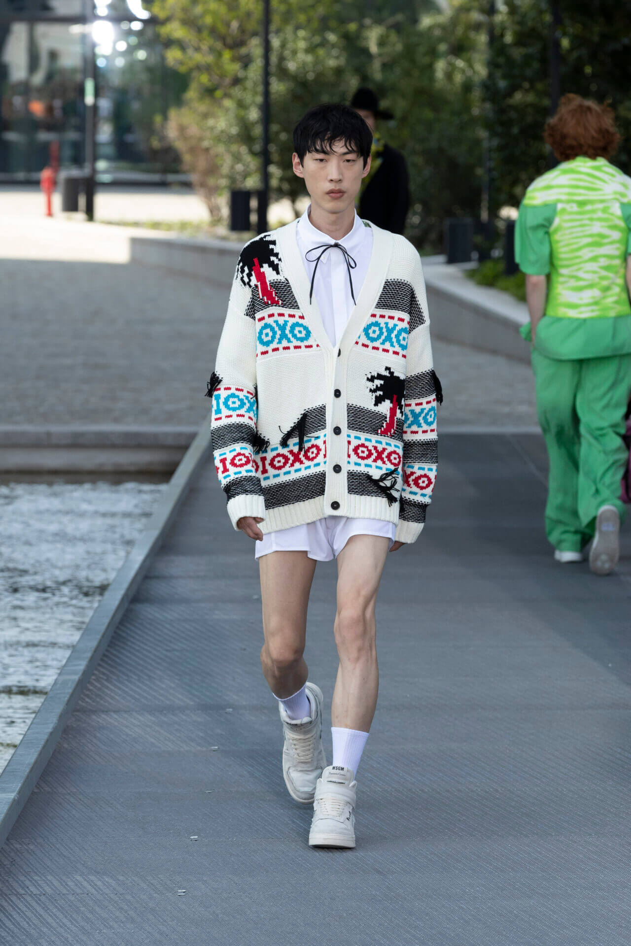 從時裝騷標題 《MSGM ISLAND ®️》就大概可以猜到,一向擅長活用各種印花以及色彩配搭的 MSGM 這一季風格模樣。是次選址在米蘭新興的工業區內一間玻璃和水泥建築,島嶼風情與現代化場景的組合緩緩道出是次展覽的靈感來源 - 科幻小說《一座島嶼的可能性》( THE POSSIBILITY OF AN ISLAND )。