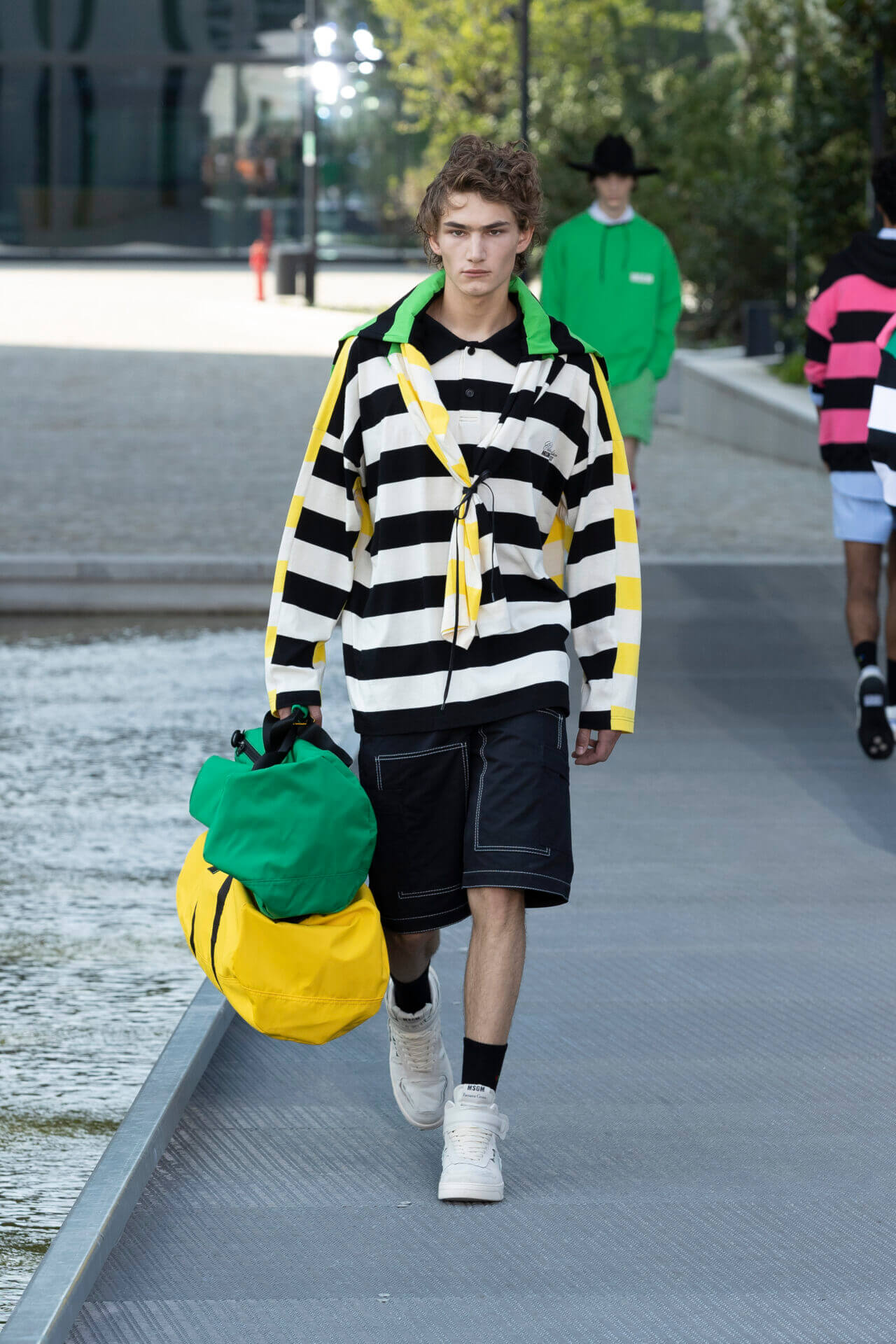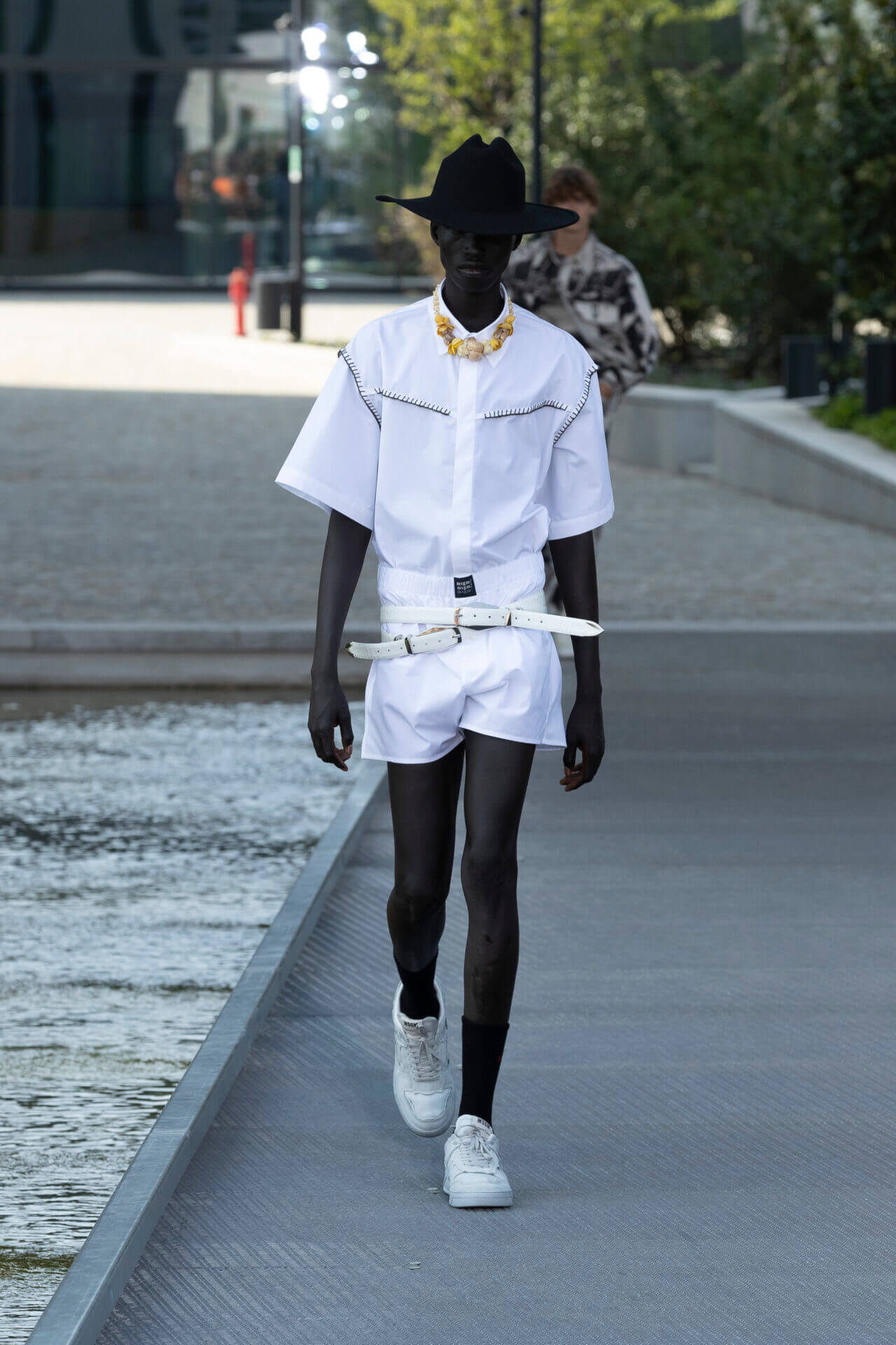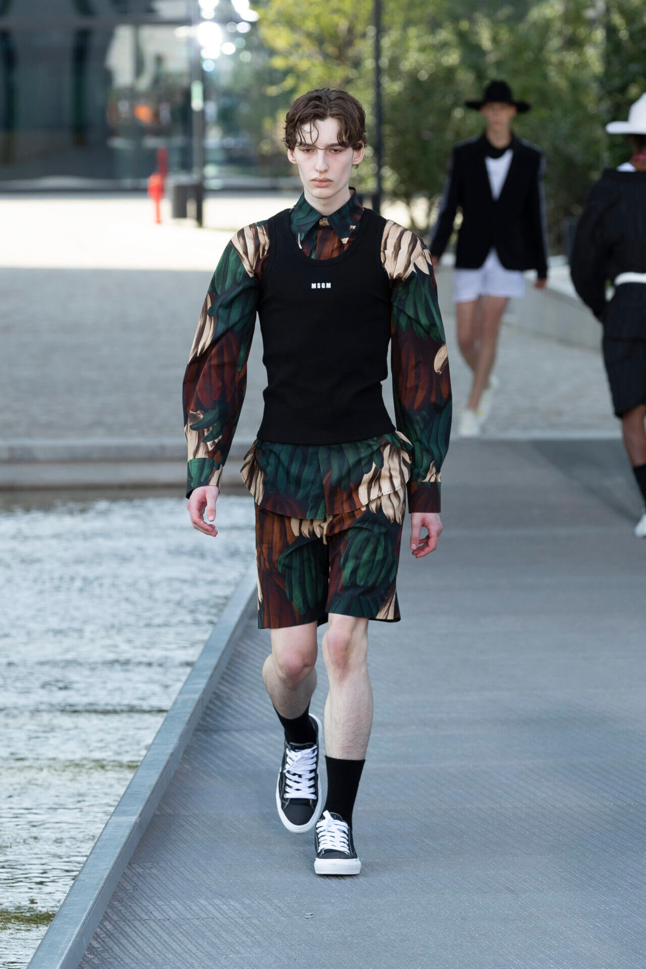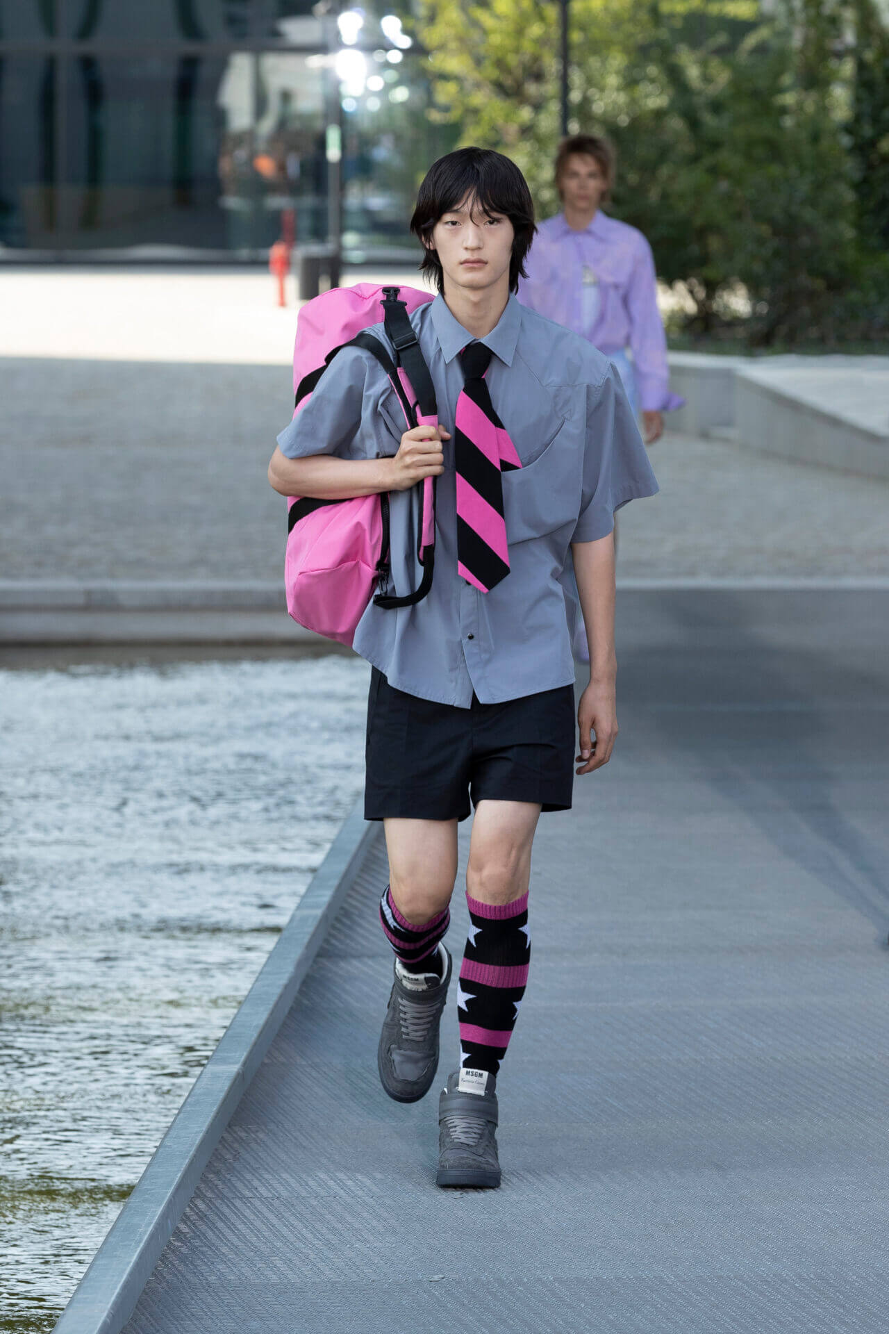 從時裝騷標題 《MSGM ISLAND ®️》就大概可以猜到,一向擅長活用各種印花以及色彩配搭的 MSGM 這一季風格模樣。是次選址在米蘭新興的工業區內一間玻璃和水泥建築,島嶼風情與現代化場景的組合緩緩道出是次展覽的靈感來源 - 科幻小說《一座島嶼的可能性》( THE POSSIBILITY OF AN ISLAND )。