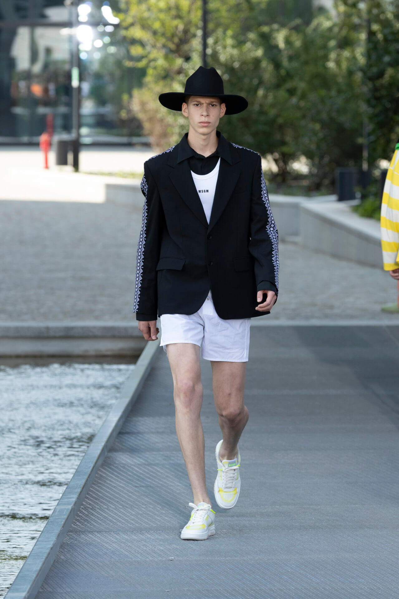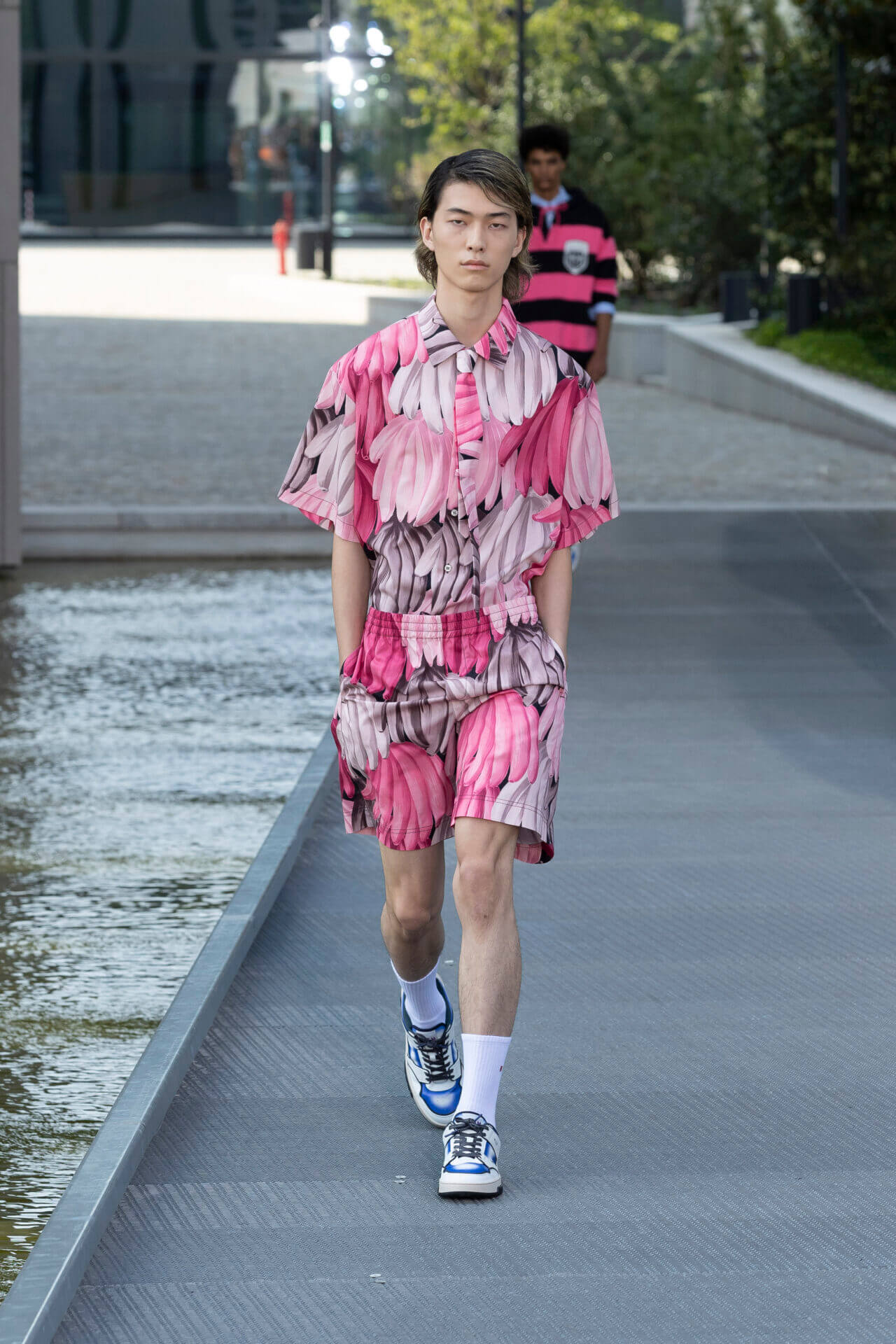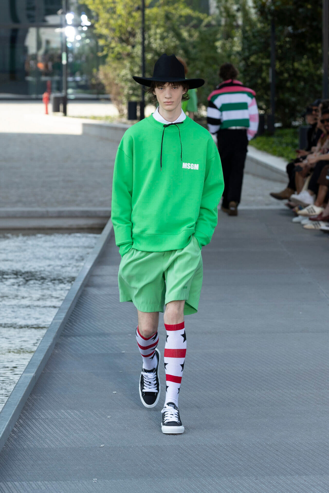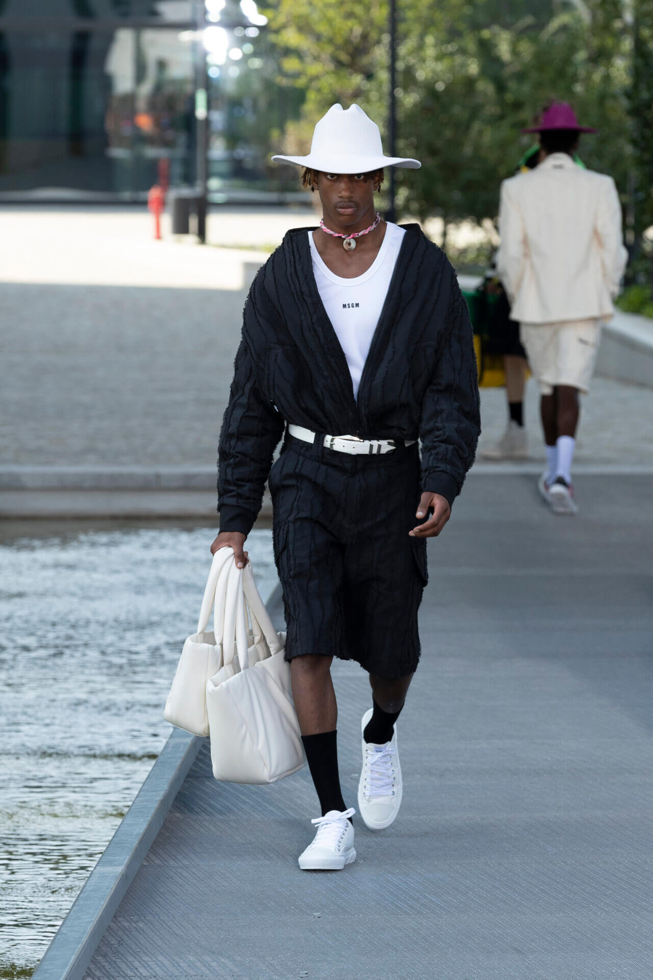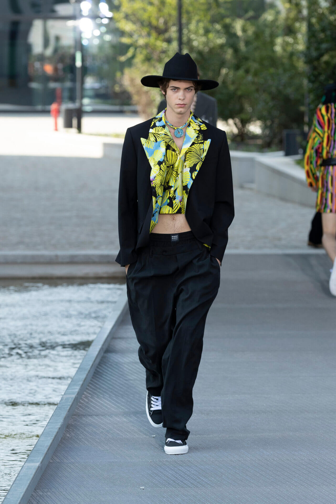 從時裝騷標題 《MSGM ISLAND ®️》就大概可以猜到,一向擅長活用各種印花以及色彩配搭的 MSGM 這一季風格模樣。是次選址在米蘭新興的工業區內一間玻璃和水泥建築,島嶼風情與現代化場景的組合緩緩道出是次展覽的靈感來源 - 科幻小說《一座島嶼的可能性》( THE POSSIBILITY OF AN ISLAND )。