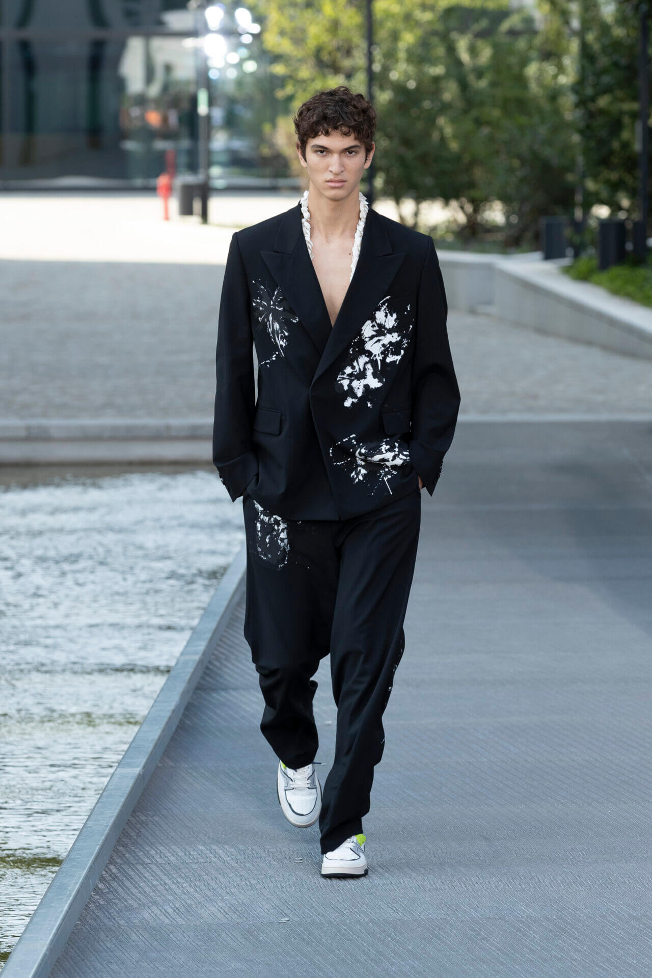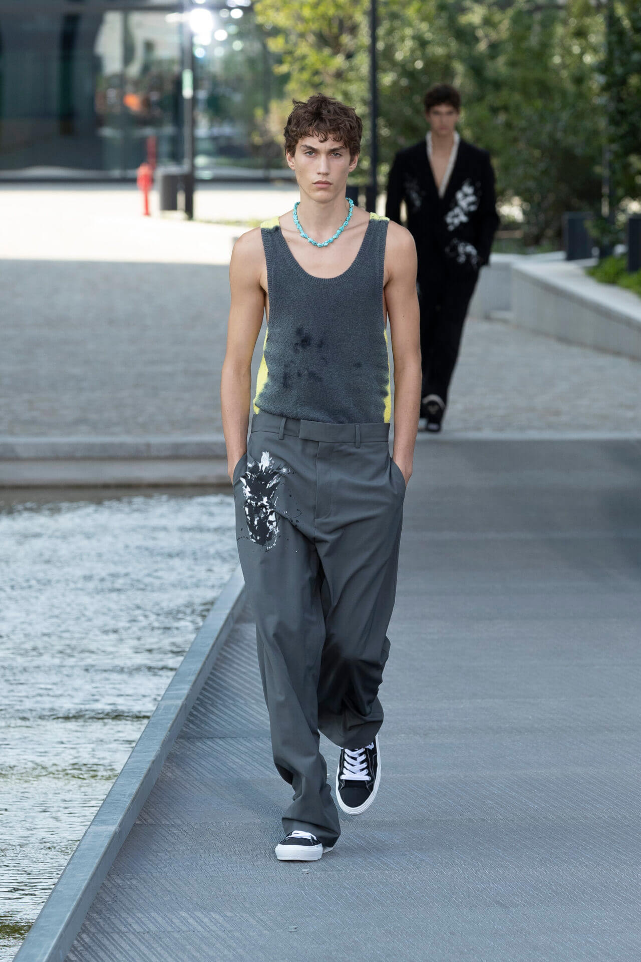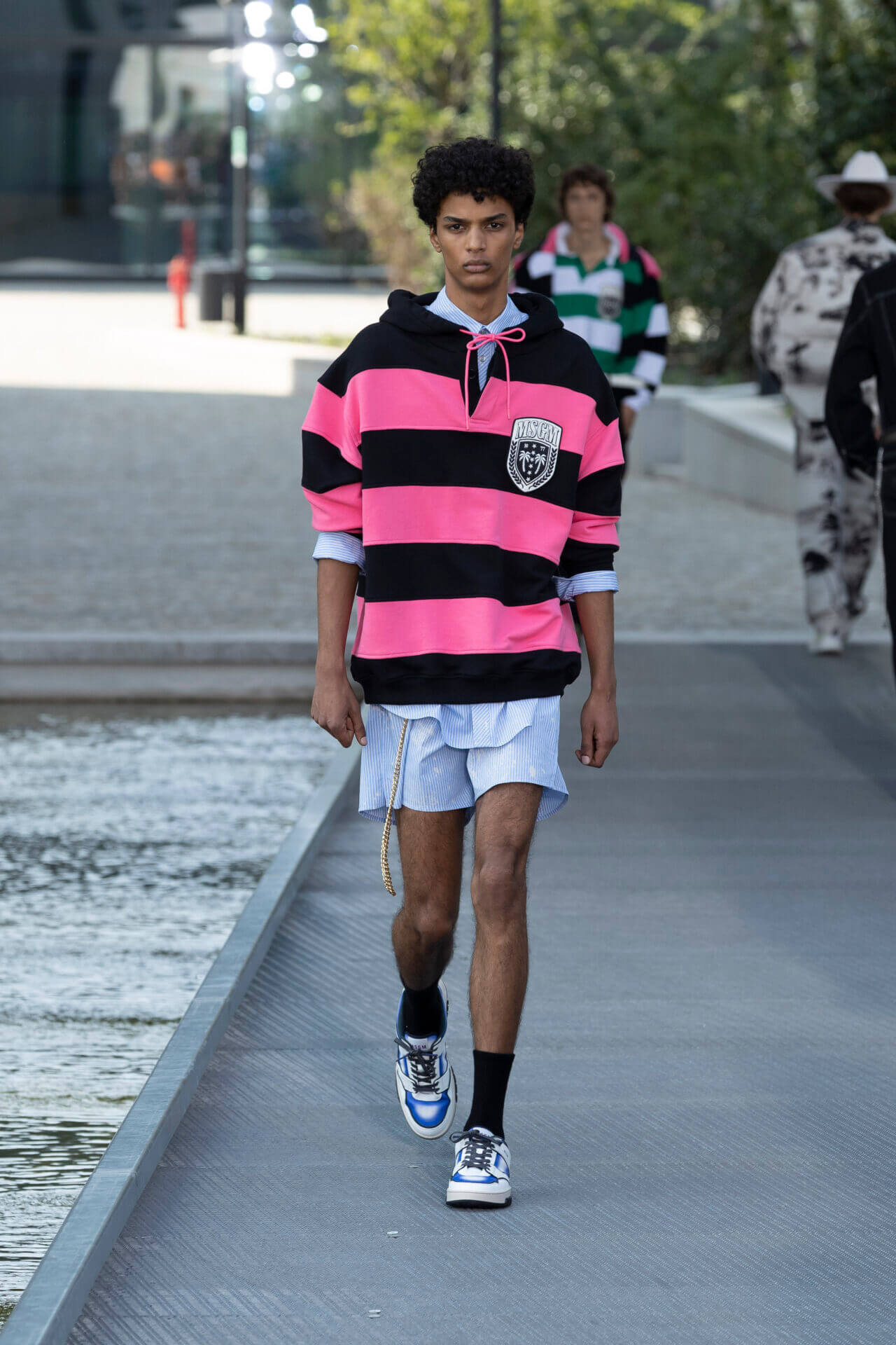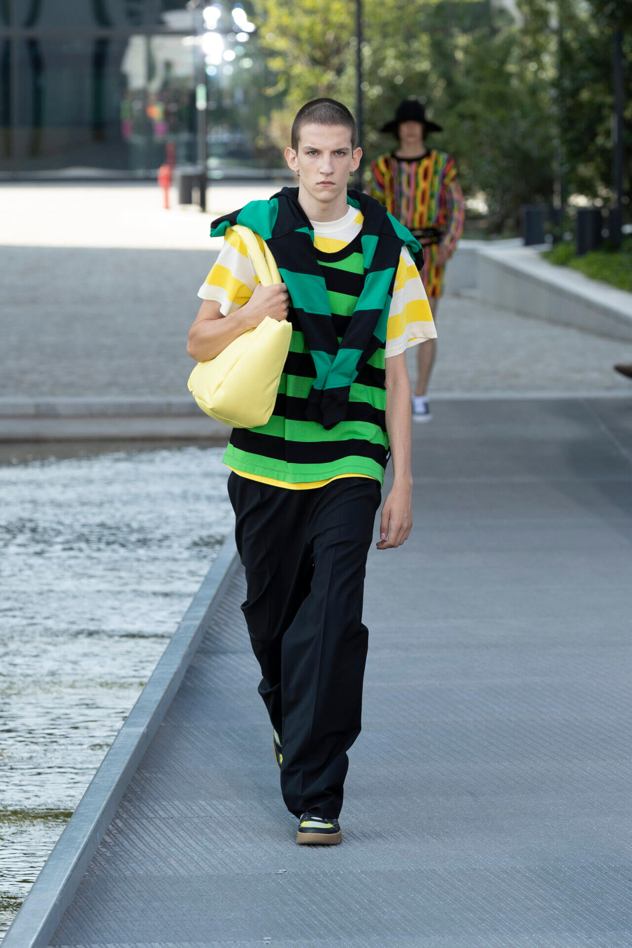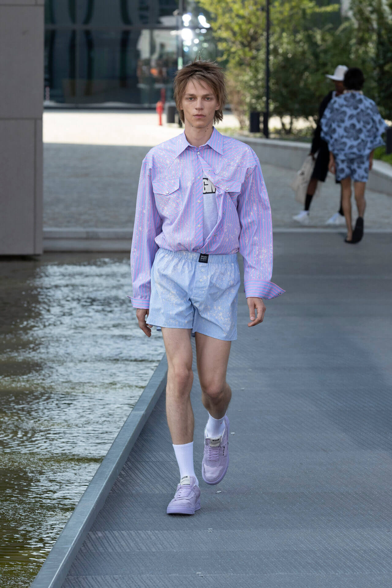 從時裝騷標題 《MSGM ISLAND ®️》就大概可以猜到,一向擅長活用各種印花以及色彩配搭的 MSGM 這一季風格模樣。是次選址在米蘭新興的工業區內一間玻璃和水泥建築,島嶼風情與現代化場景的組合緩緩道出是次展覽的靈感來源 - 科幻小說《一座島嶼的可能性》( THE POSSIBILITY OF AN ISLAND )。