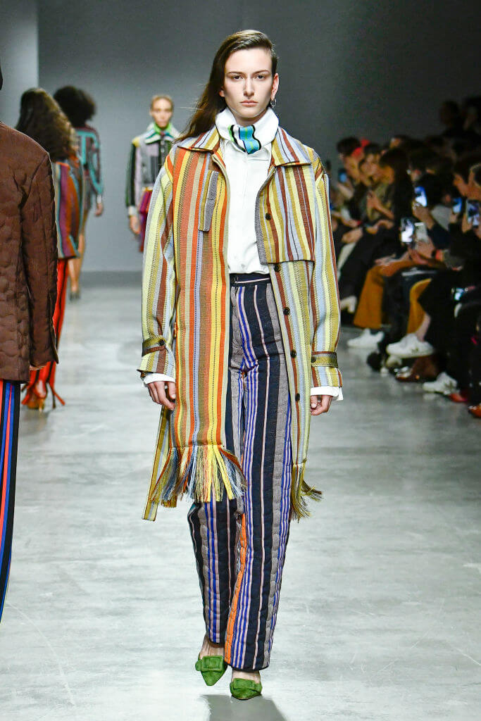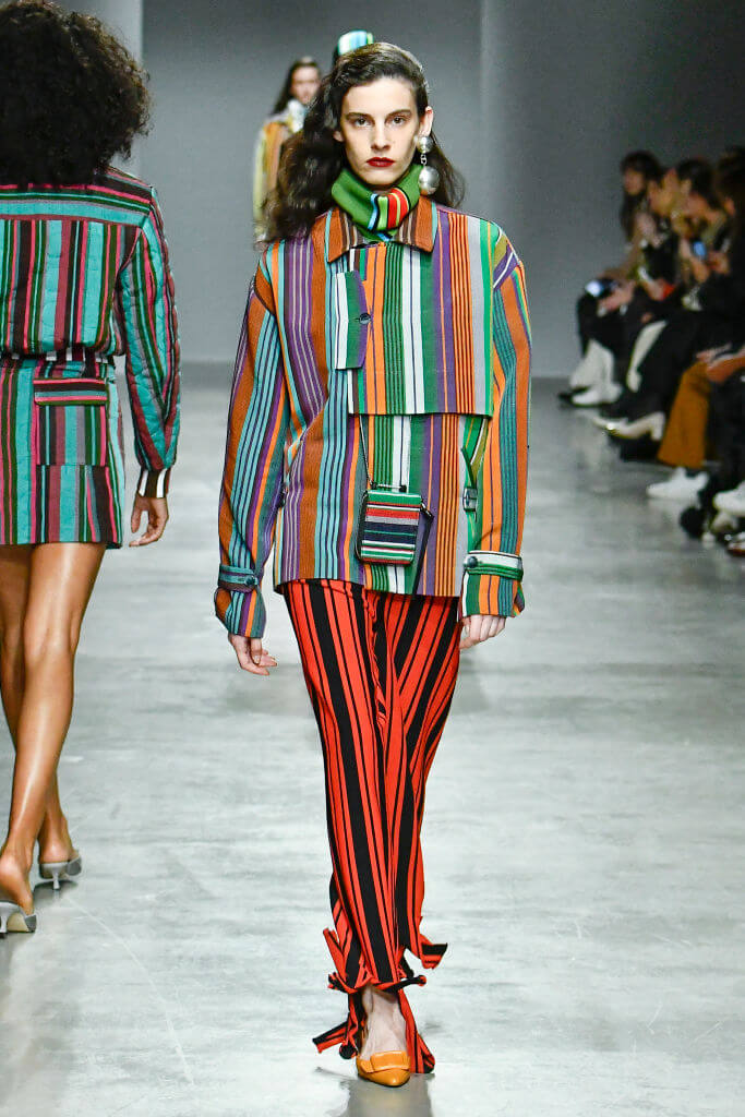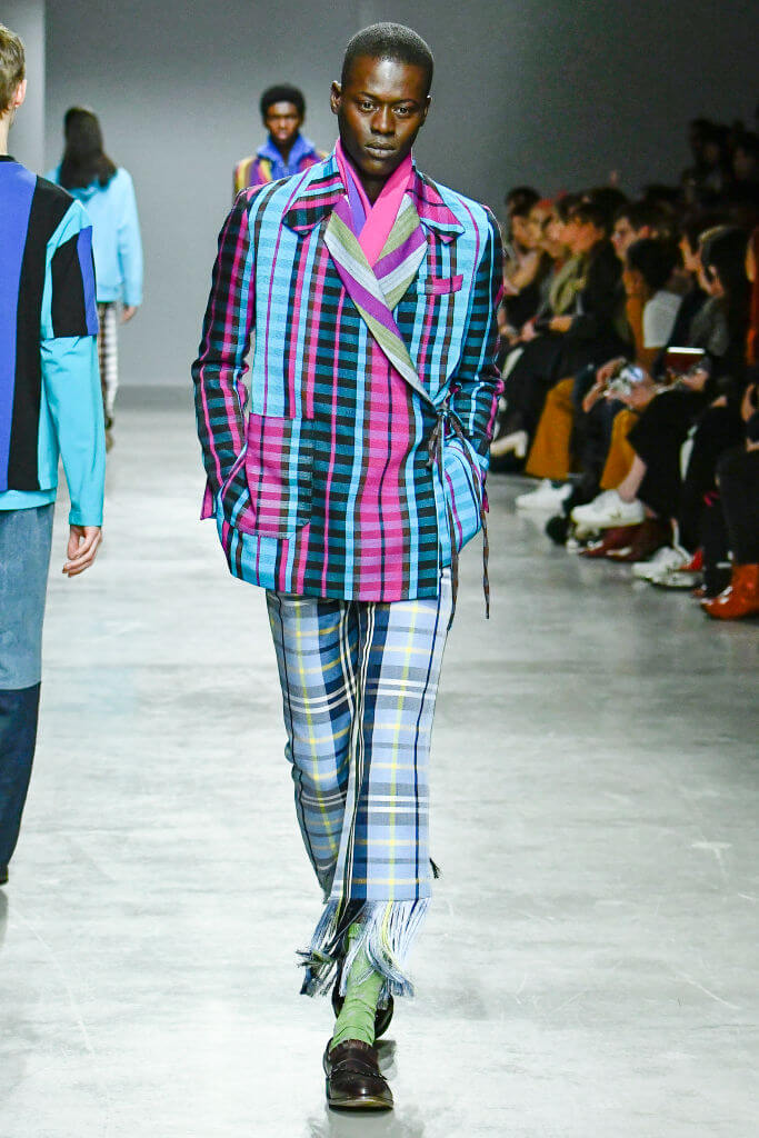 這季,KENNETH IZE 在巴黎時裝周上請來了元老級黑人女模NAOMI CAMPBELL來走騷,黑珍珠穿著彩色條紋大衣作閉幕女模,表現了非洲時尚的重要性。在一貫的UNISEX的設計之下,今季加入了奧地利蕾絲和他的標誌性ASO OKE彩色條紋布料。