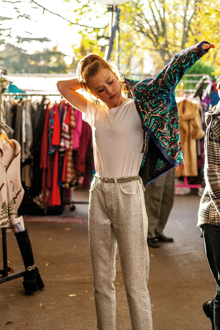 儘管見盡時尚界繁華,NATASHA 對於時裝卻沒有什麼虛榮感。她衣櫃裡大部份的衣服都是來自世界各地的古著店,所以那天她約我到倫敦最大的二手巿集 PORTOBELLO ROAD MARKET 裡尋寶,當真使我眼界大開。在那裡不但能夠找到不同年代、各大品牌的衣服、鞋履、配飾,來自本土以至世界各地的二手精品、古董家具和小玩意,通通使人目不暇給、愛不釋手。在其中一個露天攤位,NATASHA 一眼看中了一件三色珠片外套,二話不說便把它變成囊中之物,果然應驗了她的一句說話:一個女人的垃圾,便是另一個女人的寶藏。