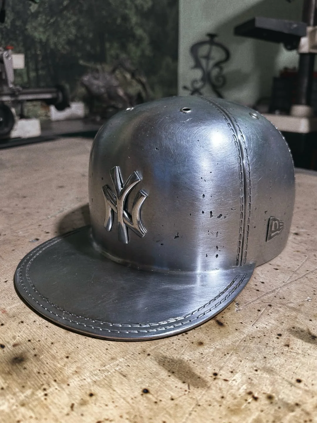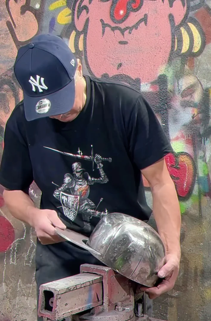 最近藝術家 MASHKOW ALEXEY 在 INSTAGRAM 上展示出一頂名為「SIR DEADASS」的帽盔作品。這頂頭盔以 NEW YORK YANKEES 經典帽型為基底,經手工改造與鍛造,成為鋼製盔甲。設計巧妙保留了帽款標誌性的「NY」字樣與邊緣的雙縫線細節,並延伸出下擺的頸部護甲,維妙維肖的設計,完美融合了紐約街頭文化與中世紀的鍛造工藝。