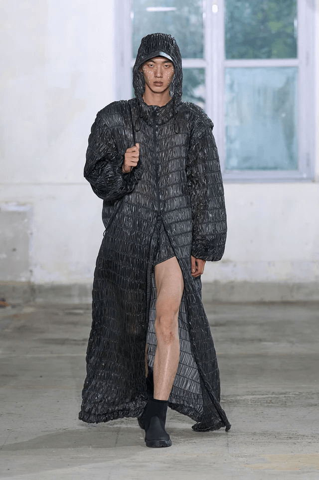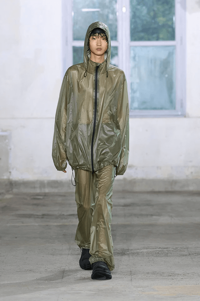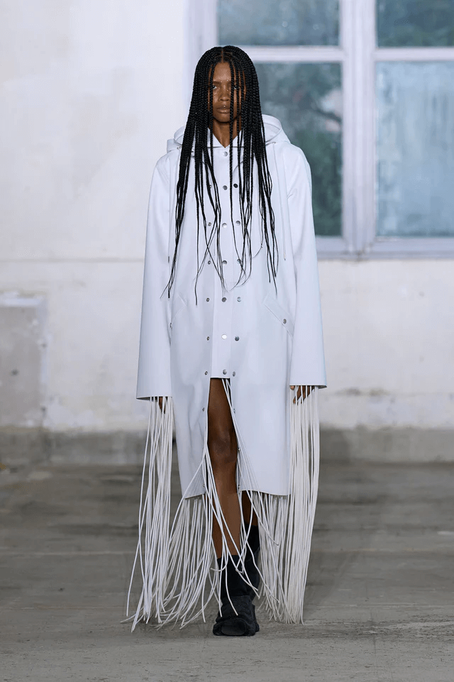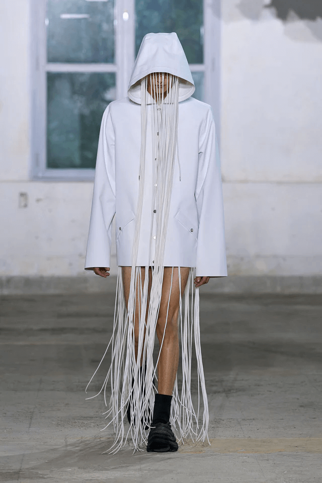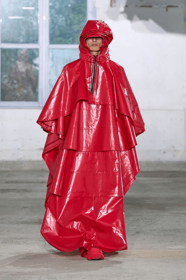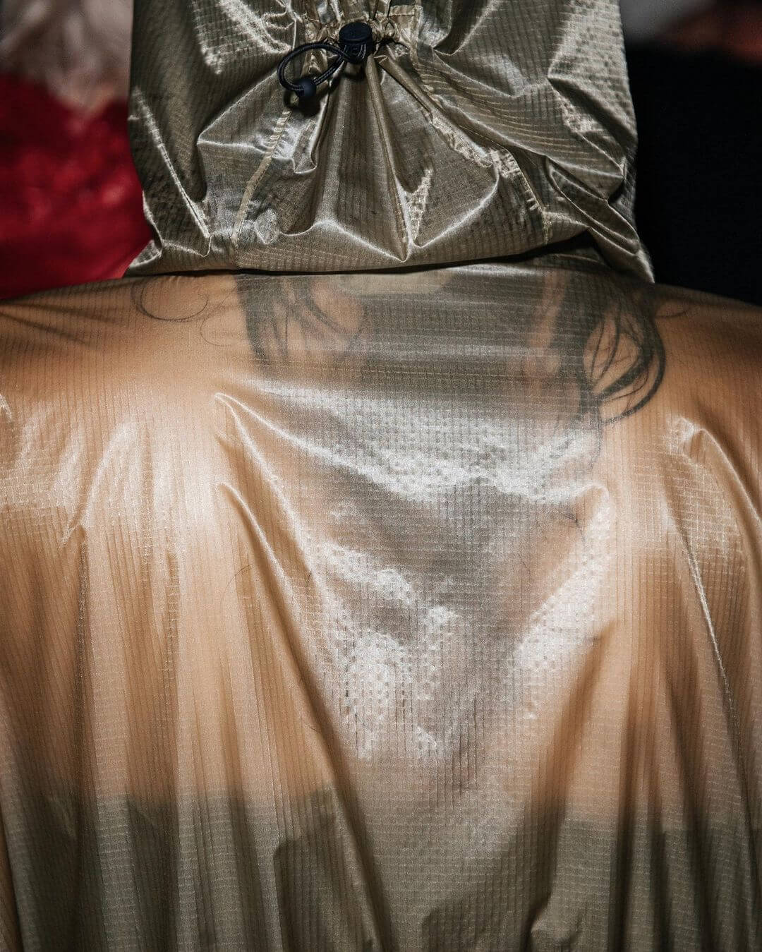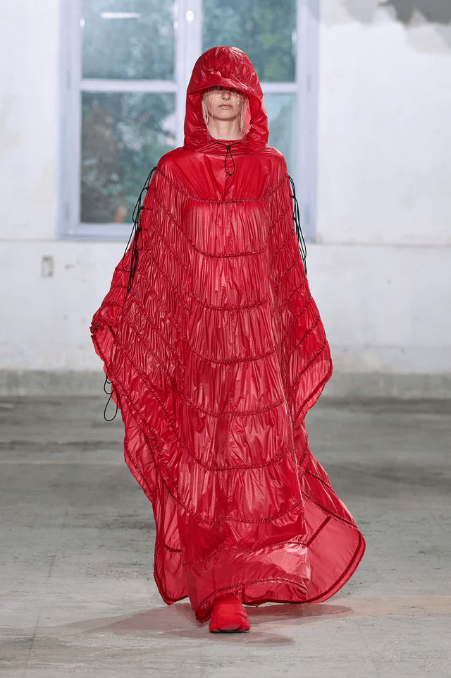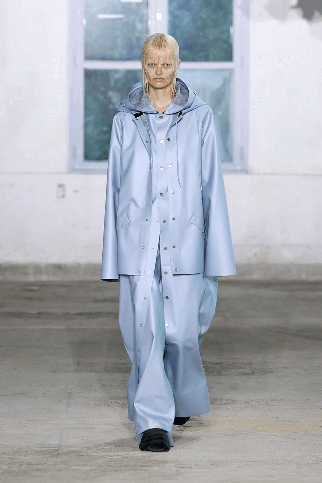 首席設計師 TANNE VINTER 一如既往地融合功能性的設計,利用聚氨酯 POLYURETHANE 展示紡織品在結構和紋理上的多功能性。將尖端創新的紡織技術與當代斯堪的納維亞美學相結合,透過結構紋理處理對紡織品進行改造,將雨衣製作出成超薄款式,甚至能造出皺褶變形的效果,打造出充滿活力、實用且植根於雨水的服裝系列;其中包括色彩豐富的連帽外套、超大尺寸剪裁的雨衣、褶邊斗篷和短款雨衣外套等更具新鮮感的設計。令人深刻的一些慵懶流蘇的單品,帶出雨中自由落體的錯覺。輔以穿著套裝時的疊搭單品及防水塗層物料的配飾,將雨衣的經典重新詮釋,形象驚豔全場。
