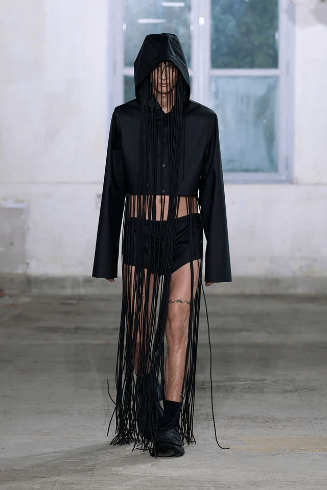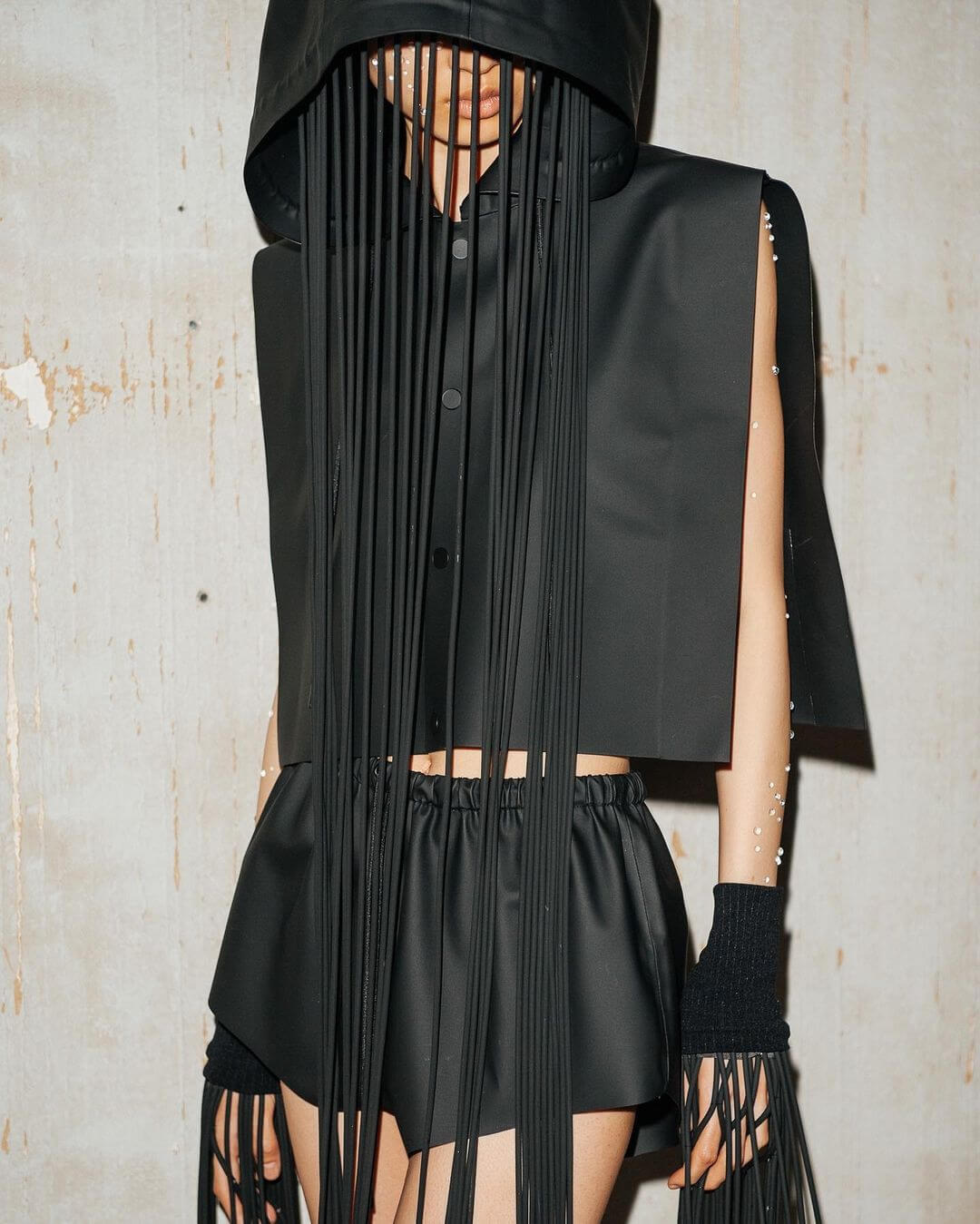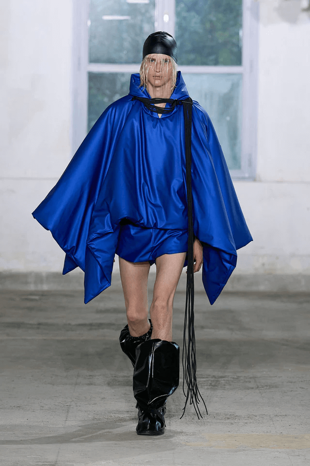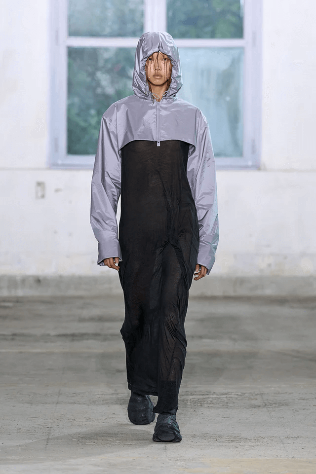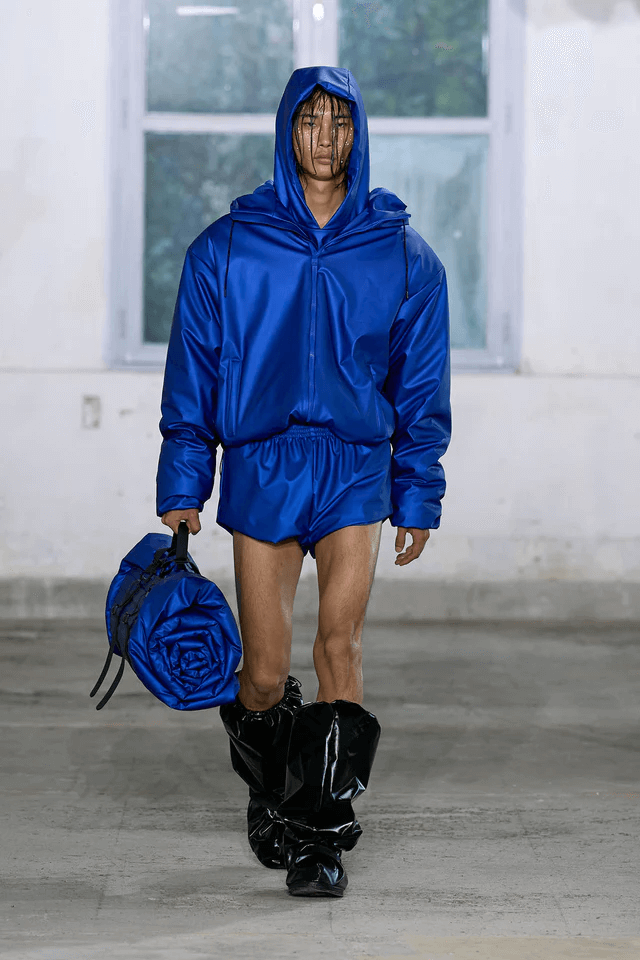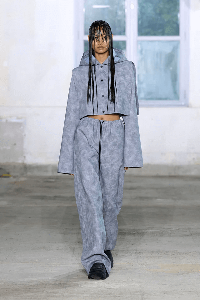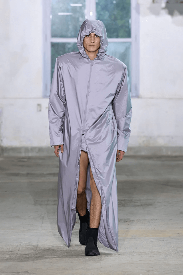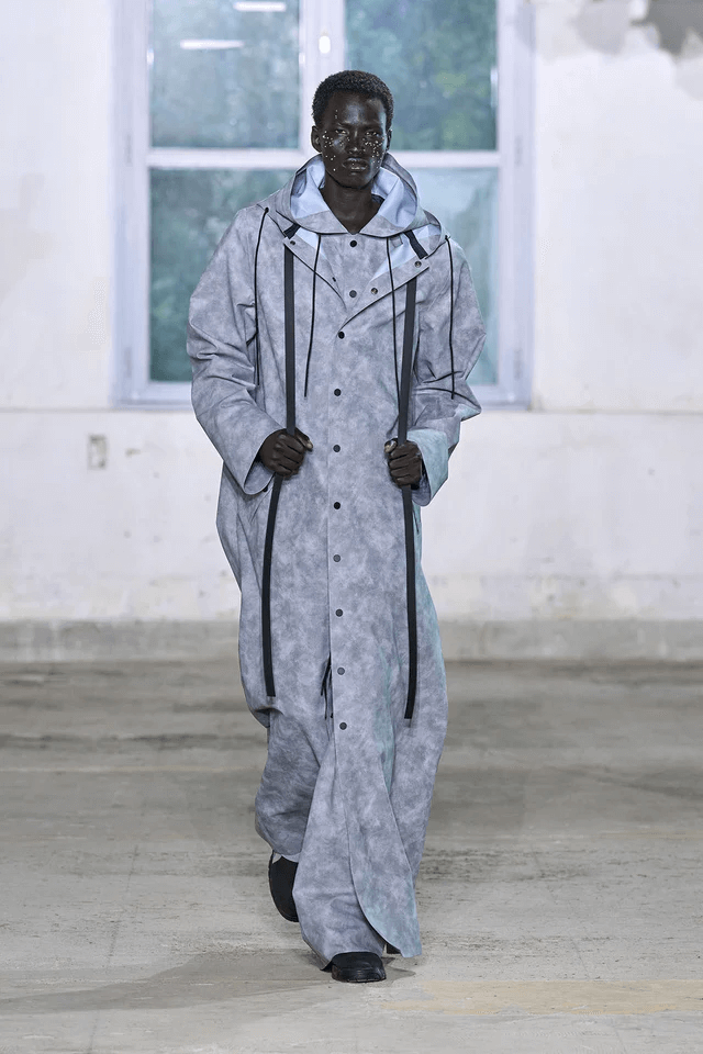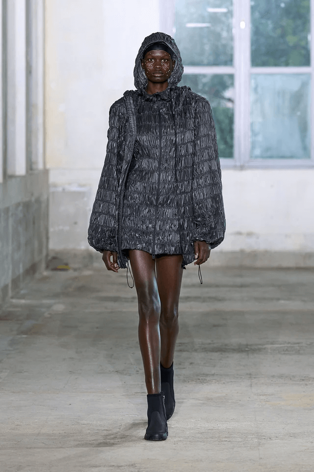 首席設計師 TANNE VINTER 一如既往地融合功能性的設計,利用聚氨酯 POLYURETHANE 展示紡織品在結構和紋理上的多功能性。將尖端創新的紡織技術與當代斯堪的納維亞美學相結合,透過結構紋理處理對紡織品進行改造,將雨衣製作出成超薄款式,甚至能造出皺褶變形的效果,打造出充滿活力、實用且植根於雨水的服裝系列;其中包括色彩豐富的連帽外套、超大尺寸剪裁的雨衣、褶邊斗篷和短款雨衣外套等更具新鮮感的設計。令人深刻的一些慵懶流蘇的單品,帶出雨中自由落體的錯覺。輔以穿著套裝時的疊搭單品及防水塗層物料的配飾,將雨衣的經典重新詮釋,形象驚豔全場。